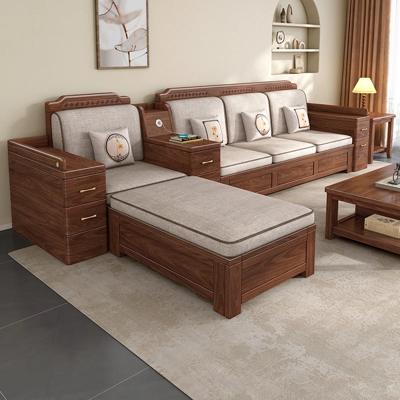 新中式スタイルの無垢材ソファ、ブラックウォールナット色。小型リビングに最適!冬夏両用で高収納ボックス付き。工場直販でお得に手に入れよう!