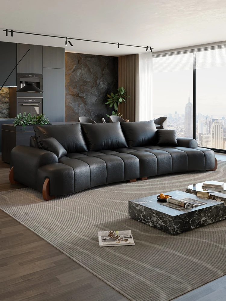 2025年新作!イタリアンミニマリズムの黒いクラウドレザーソファ。モダンでシンプルなデザイン、リビングルームにぴったり!猫の爪も気にせず使える、家族みんなに優しいソファです。