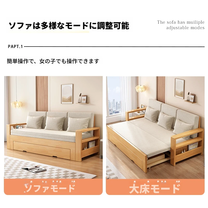 香港送料無料!全実木製のソファベッド、折りたたみ式で小型住宅にぴったり!多機能で伸縮可能なデザイン、ラバーウッドと布のコンビネーションで快適な空間を実現!
