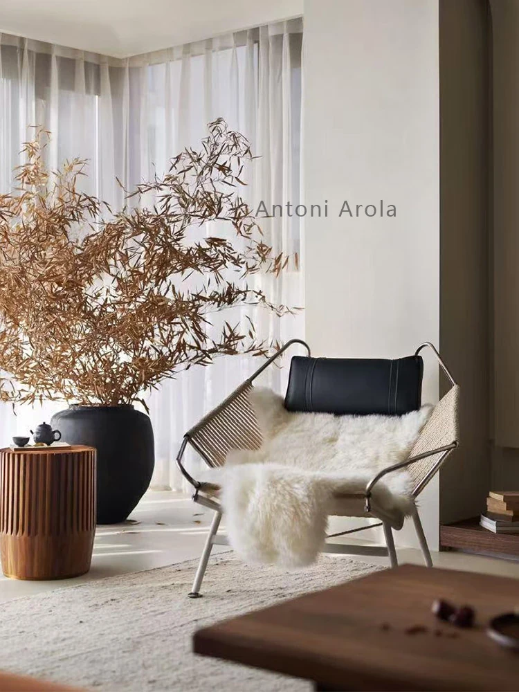 デンマークデザイナーのロープチェア、中古の侘寂スタイル、ウール製のリラックスチェア。別荘やサロンに最適な編み込みデザインのくつろぎ椅子。洗練された空間にぴったりのアイテム!
