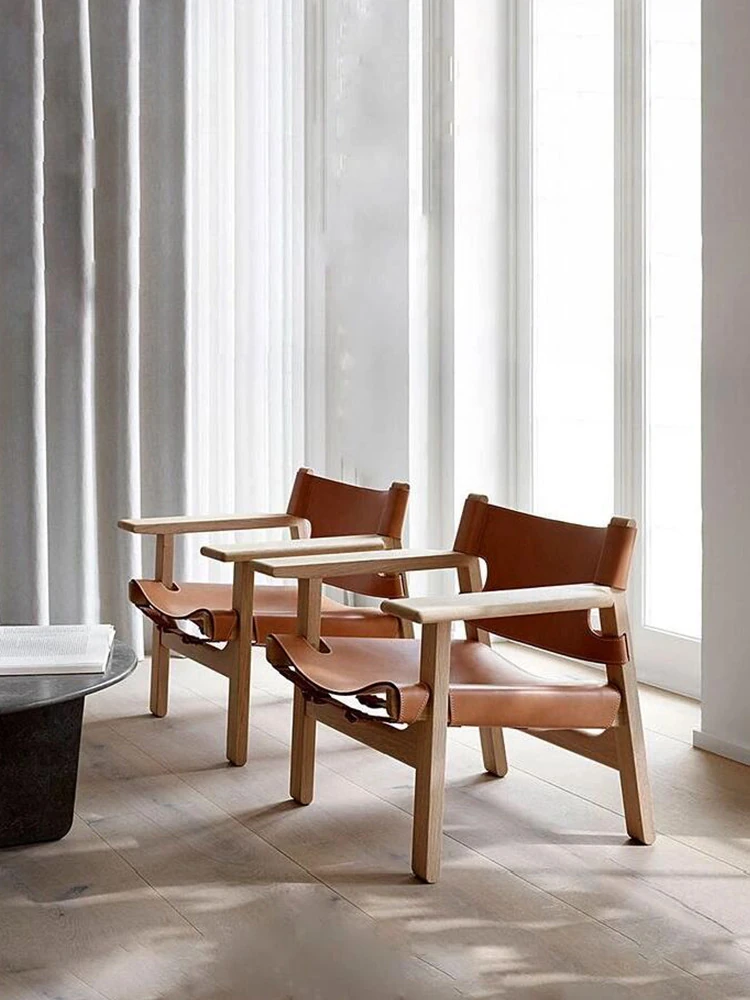 北欧風の無垢材一人掛けソファ、スペイン椅子デザインのサドルレザー狩猟椅子。レトロでリラックスした雰囲気を持つ民宿にもぴったりな洽談用チェア。おしゃれで快適な空間を演出します!