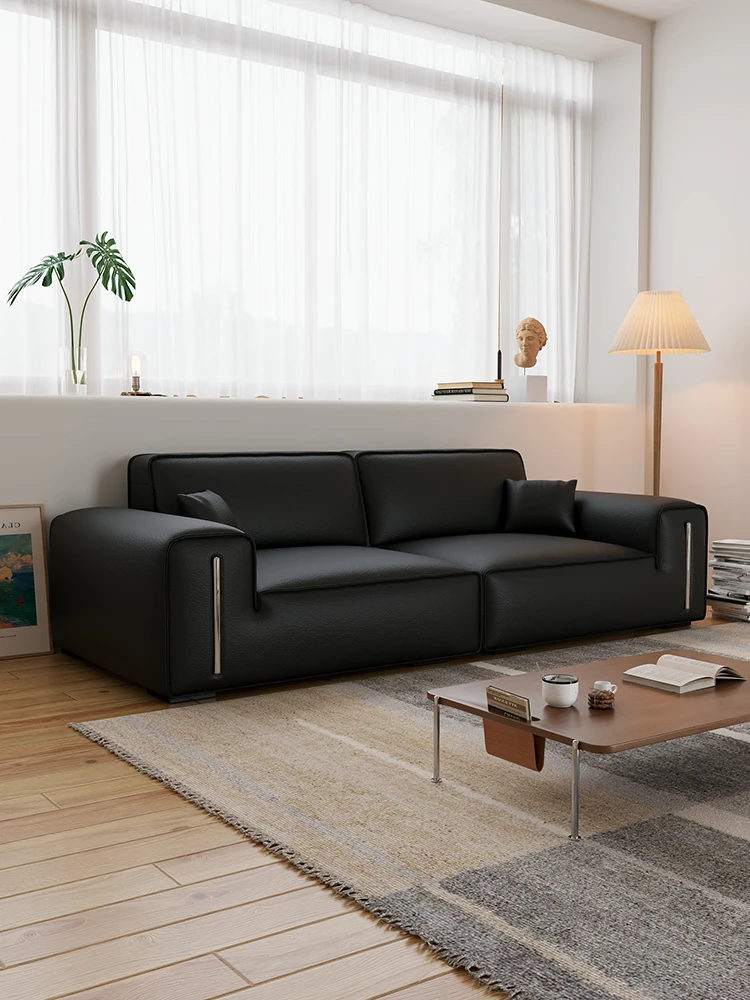 Italian Minimalist Top-Grain Leather Sofa - Modern Scandinavian Style for Small Spaces, Luxurious Retro Design with Tofu Block Shape, Genuine Leather Comfort