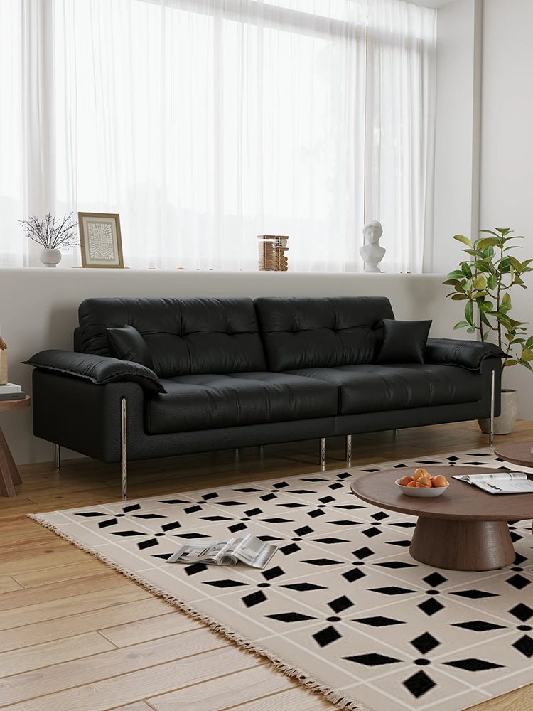 2025 New Black Leather Sofa - Modern Minimalist Design for Small Apartments, Affordable Straight-Line Couch for Compact Living Spaces