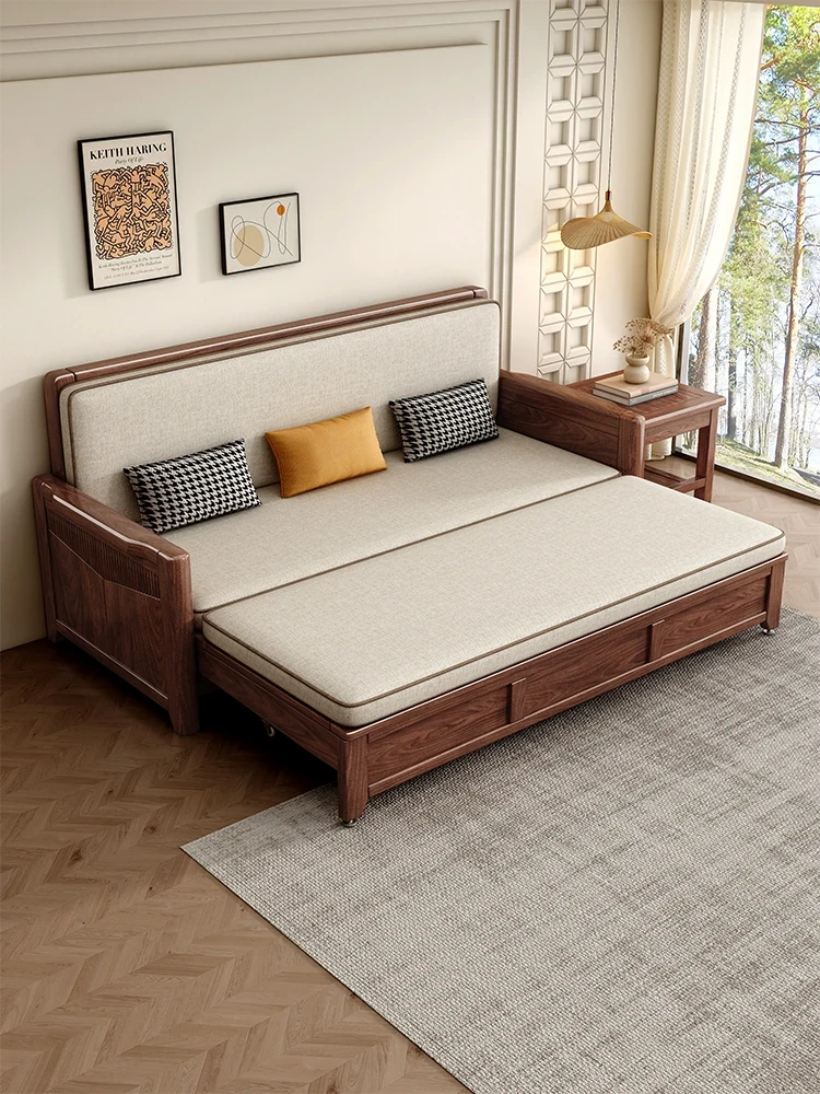 Black Walnut Folding Solid Wood Sofa Bed - Nordic Style, Multi-Functional, Space-Saving Pull-Out Bed for Small Living Rooms
