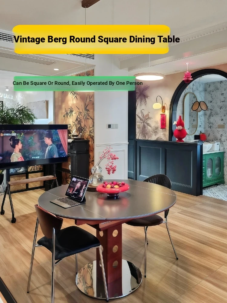 ZhiMu Borg Vintage Expandable Round Dining Table - Compact Design for Small Spaces, Made with Durable Boxwood, Perfect for Home Use. Transformable Square to Round Functionality for Versatile Dining Experiences!