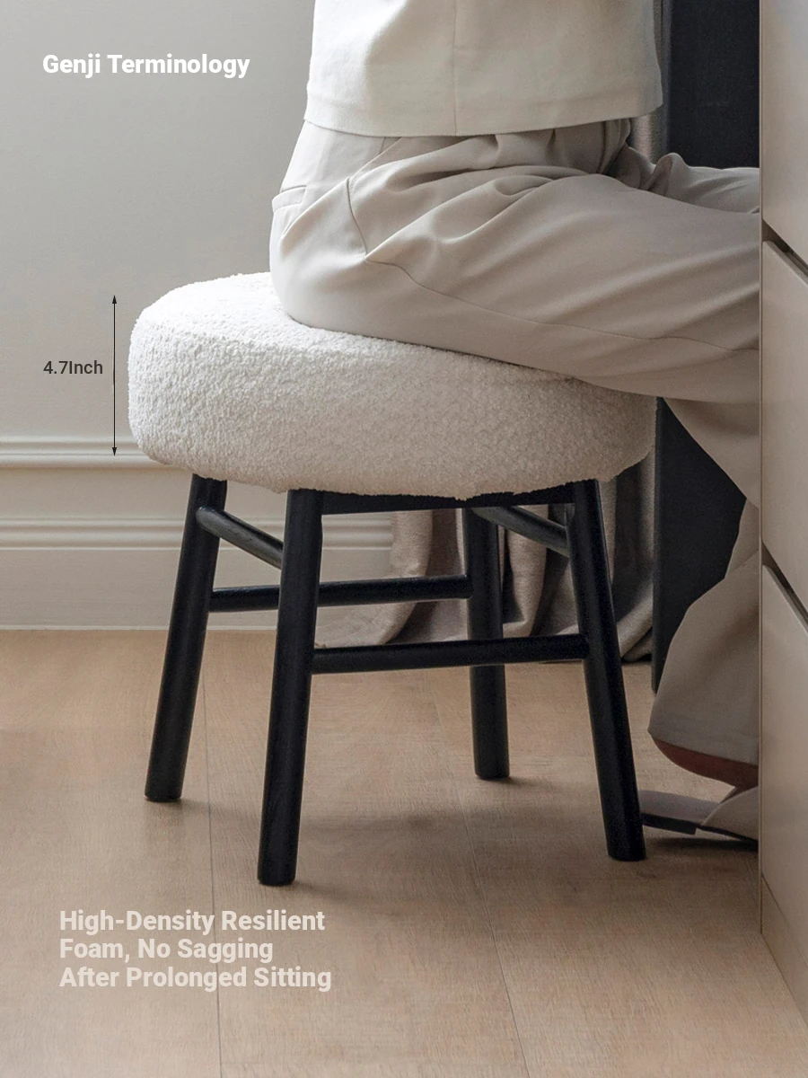 Genji Mu Yu Anani Solid Wood Makeup Stool - Versatile Dressing Table Seat, Shoe Changing Bench, Minimalist Bedroom Design with Cozy Lambswool Upholstery, Round Shape for Ultimate Comfort.