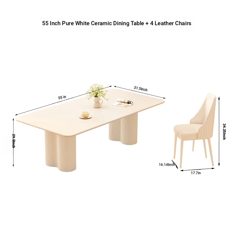 [One Table and Four Chairs] 55.12 in Pure White Rock Plate Rectangular Dining Table +4 Leather Chairs