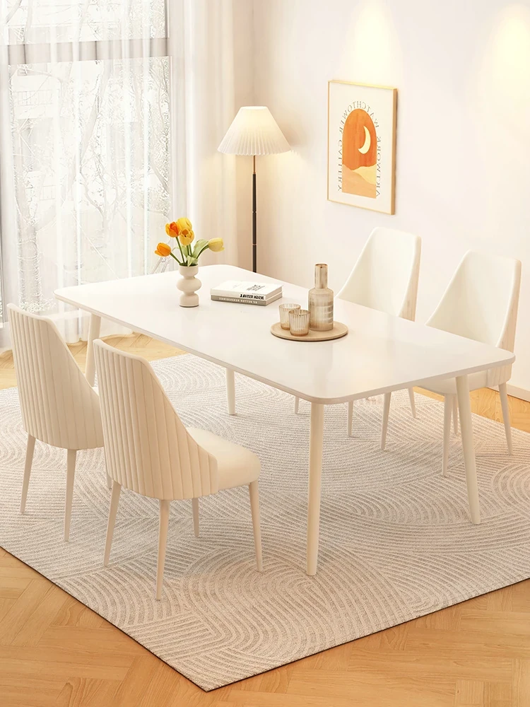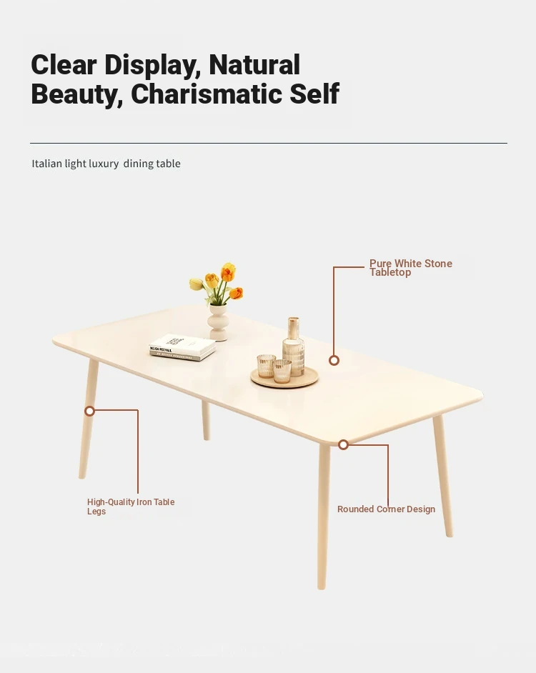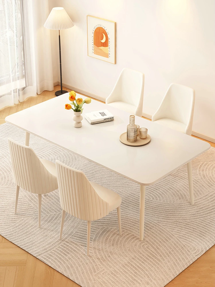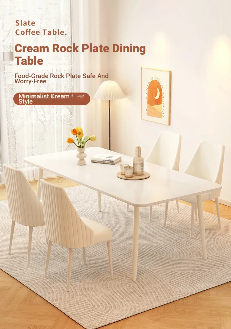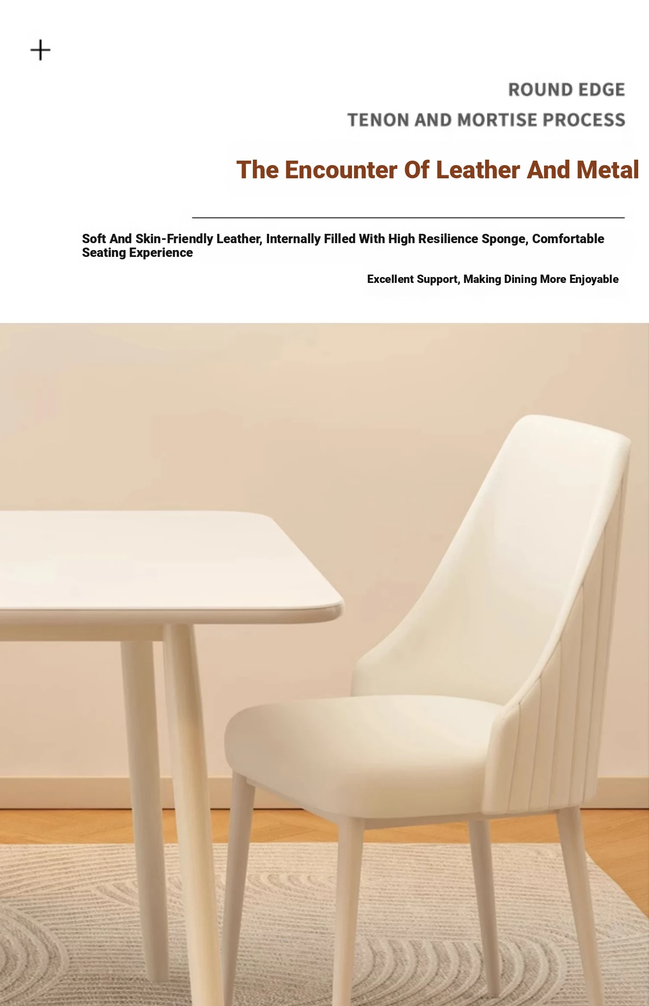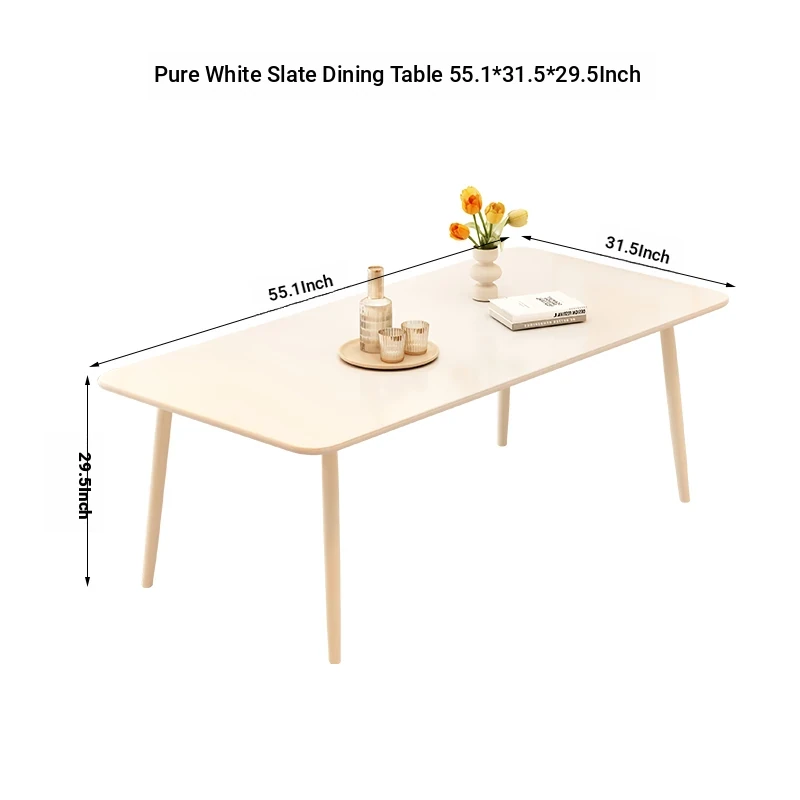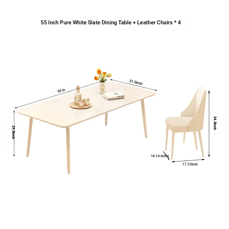 [One Table and Four Chairs] 55.12 in Pure White Rock Plate Dining Table +4 Leather Chairs
