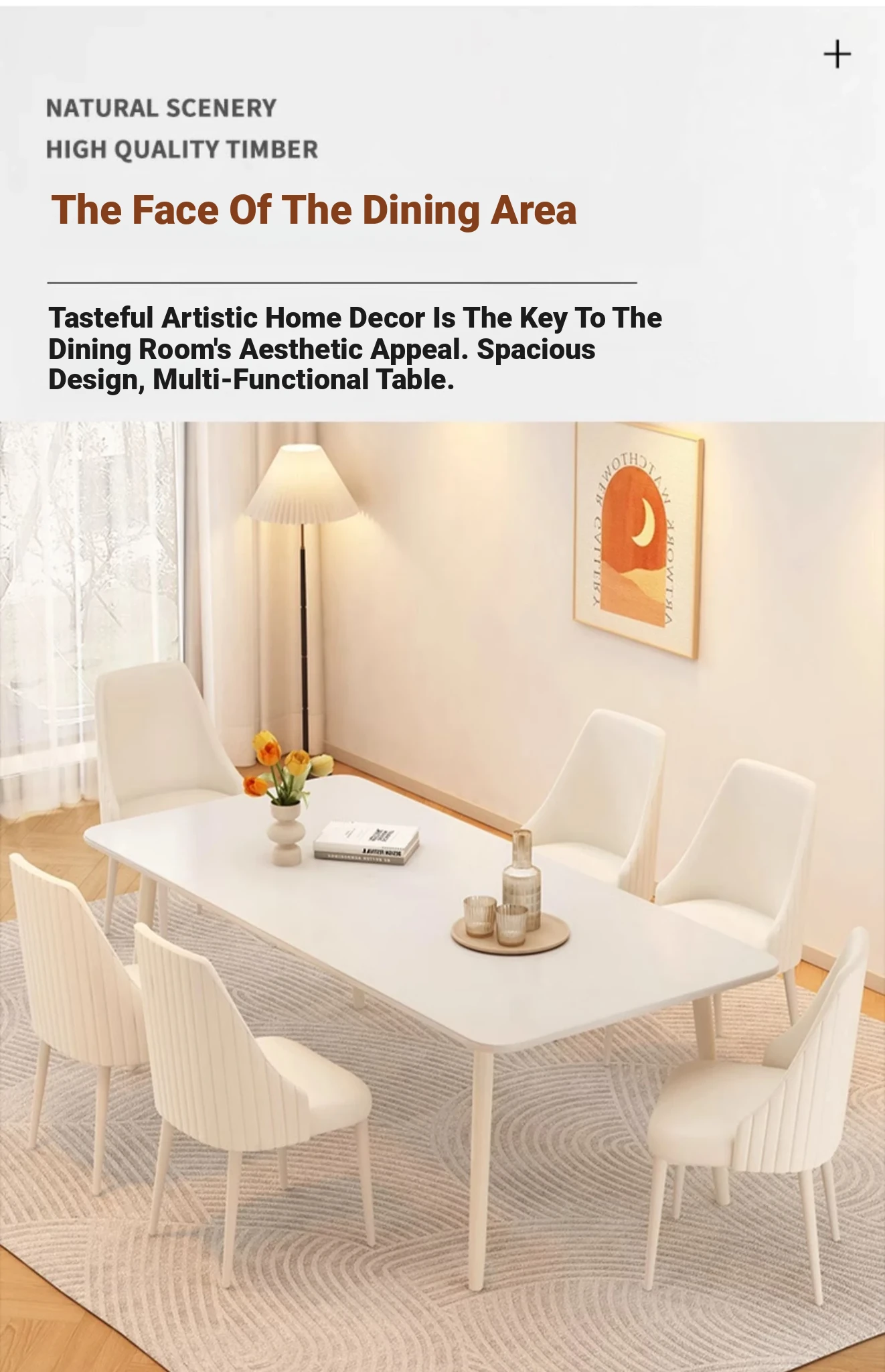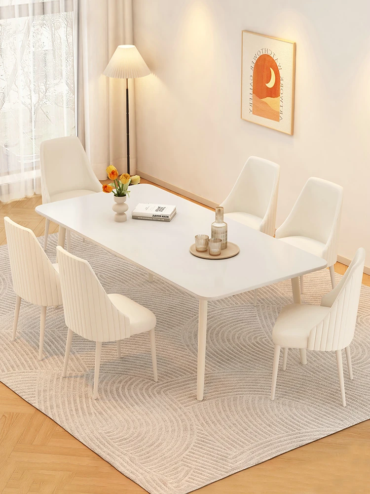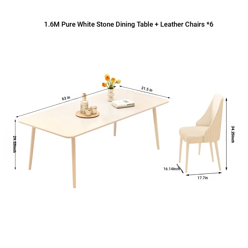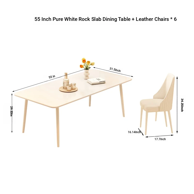 [One Table and Six Chairs] 55.12 in Pure White Rock Plate Dining Table +6 Leather Chairs