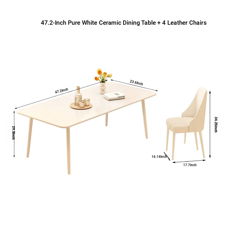 [One Table and Four Chairs] 47.24 in Pure White Rock Plate Dining Table +4 Leather Chairs