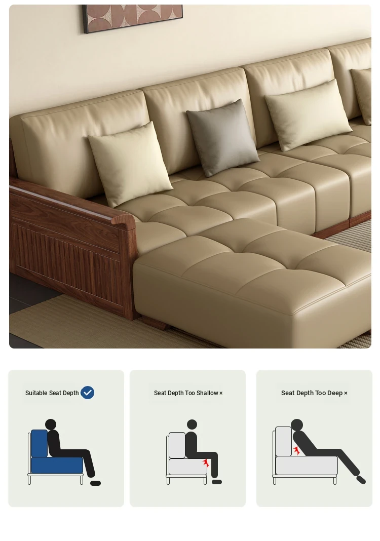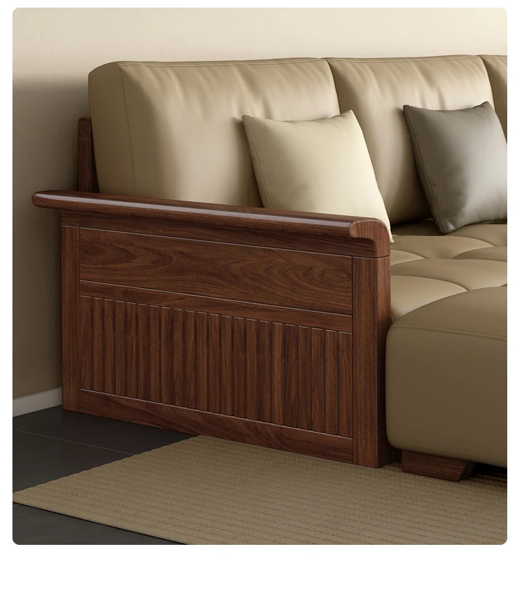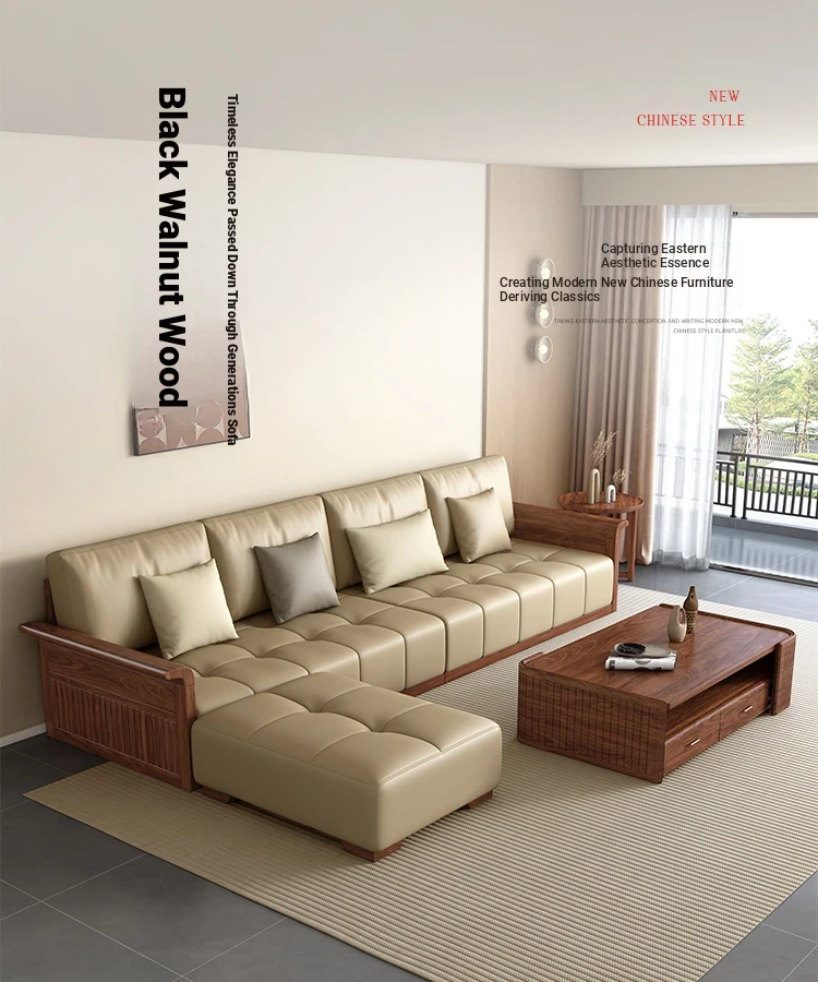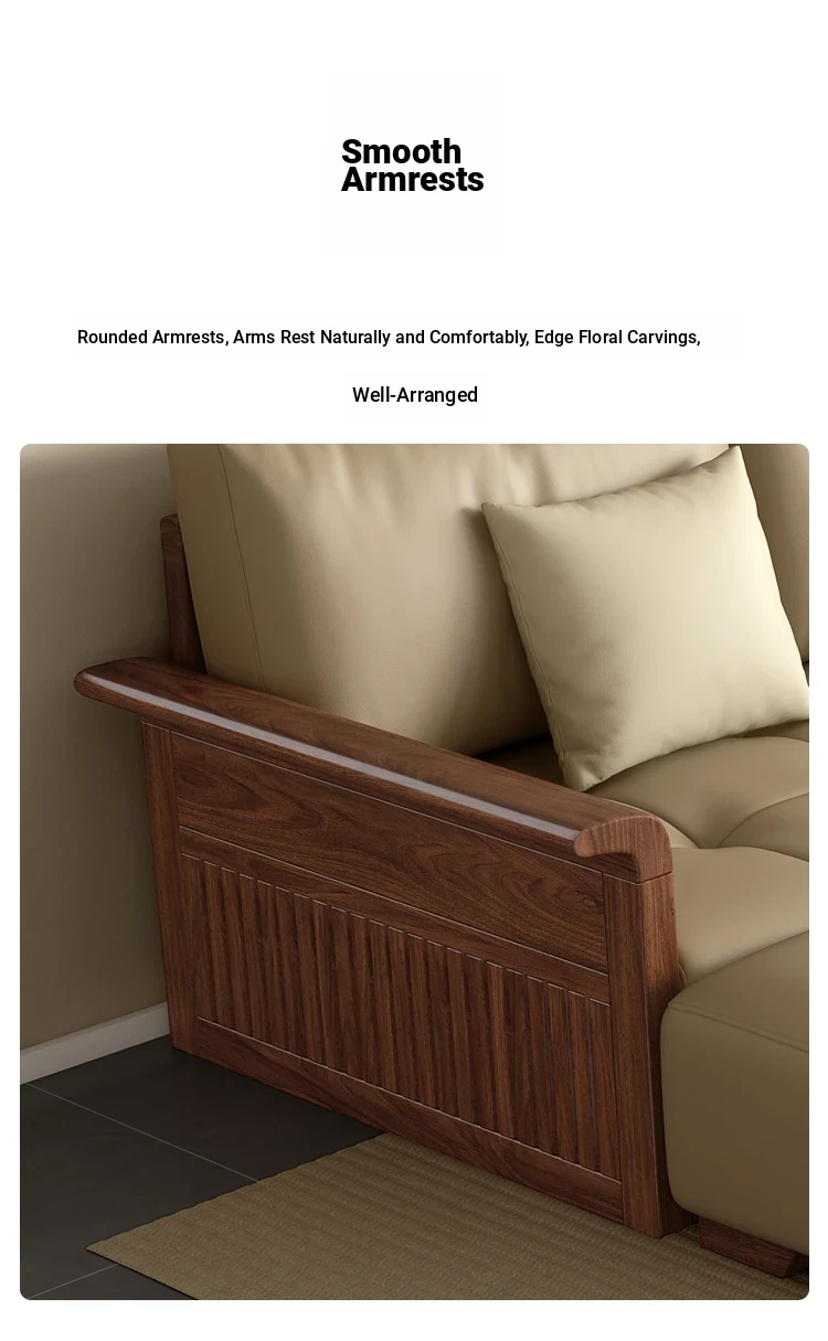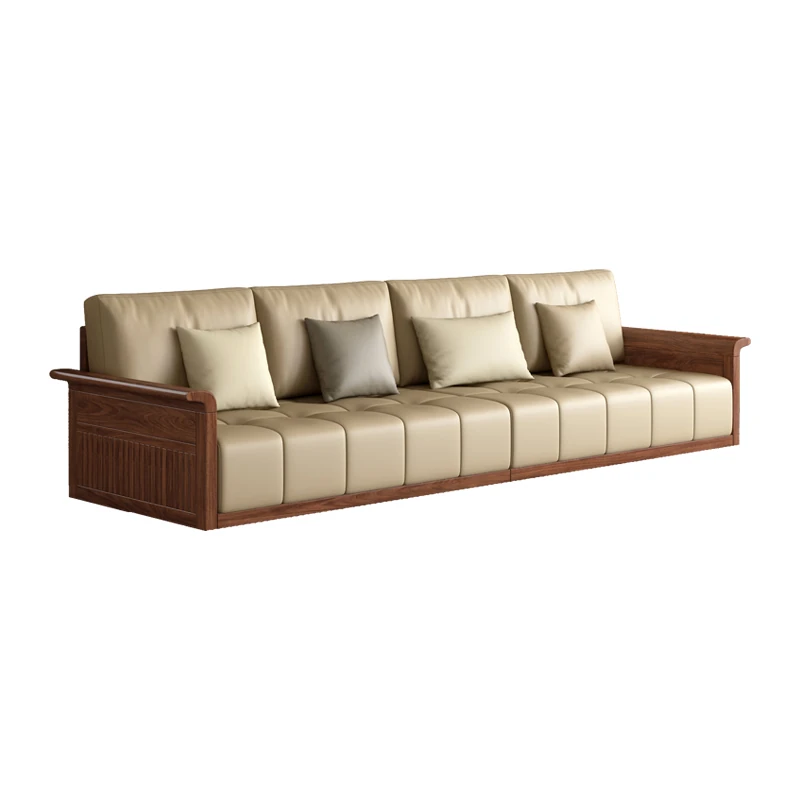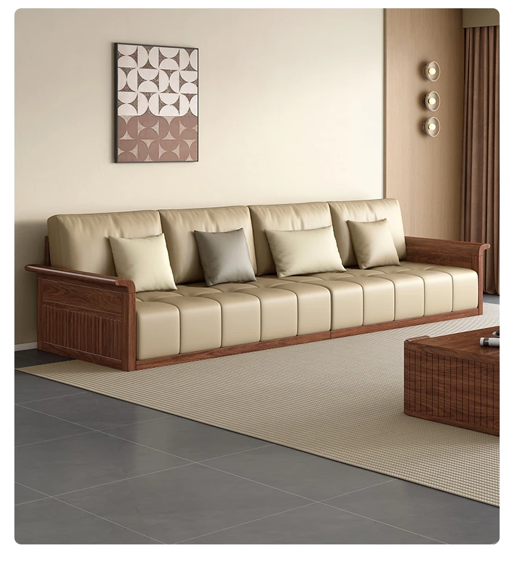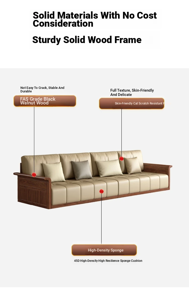 Mid-Century Modern Black Walnut Solid Wood Leather Sofa - Luxurious Yet Simple Design for Spacious Living Rooms, Accommodates Four People.