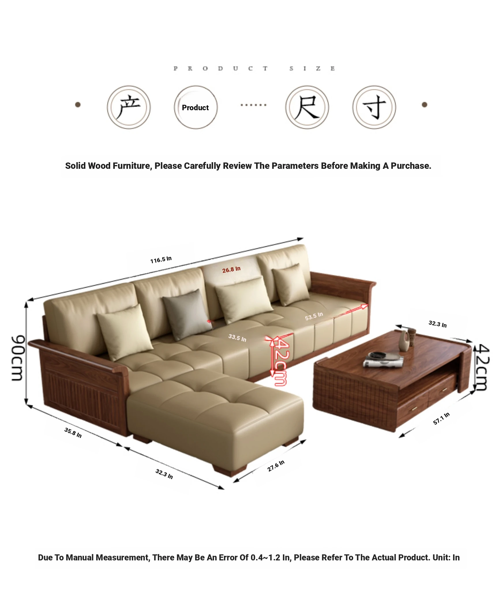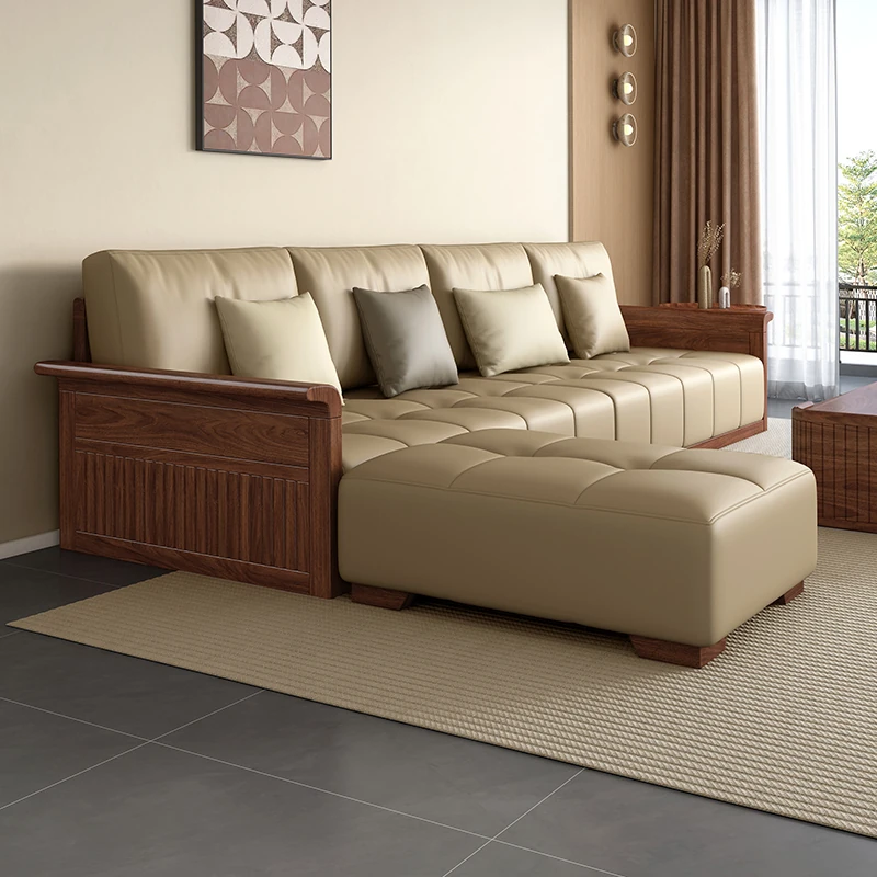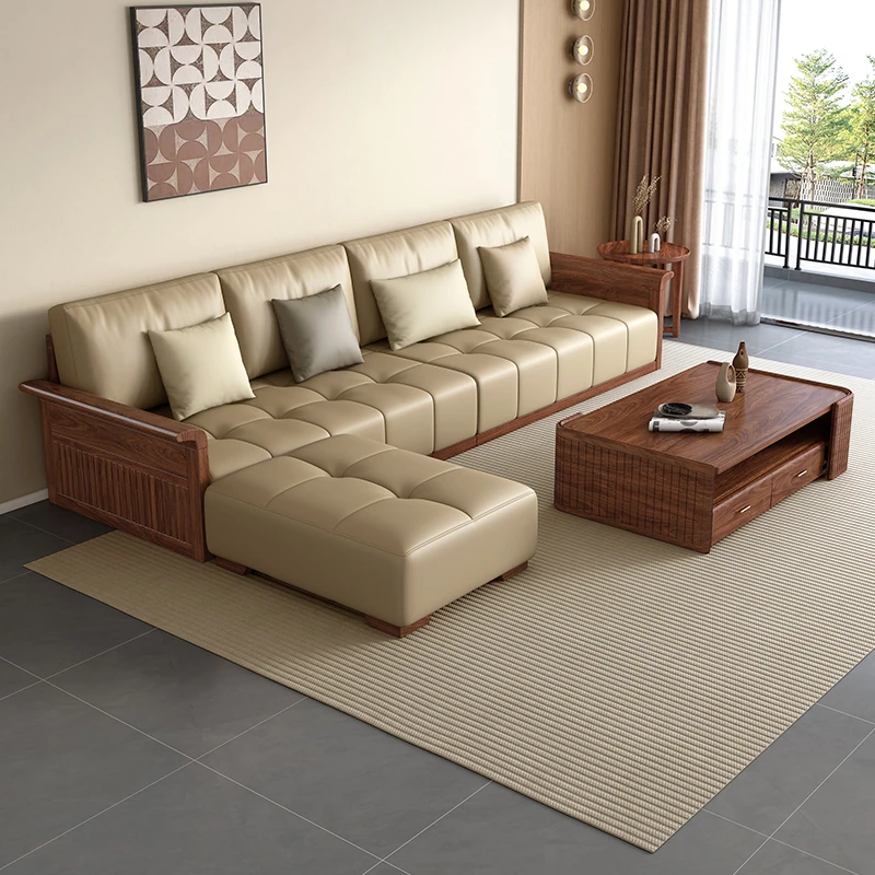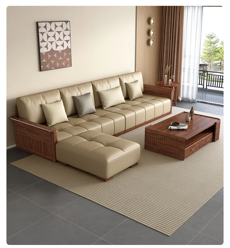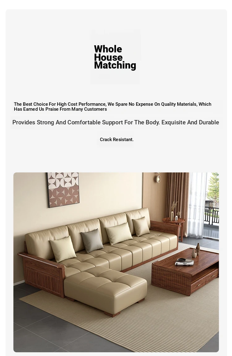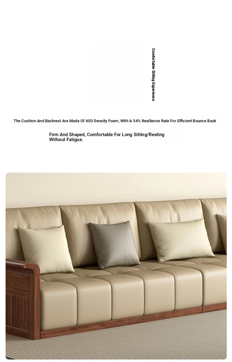 Mid-Century Modern Black Walnut Solid Wood Leather Sofa - Luxurious Yet Simple Design for Spacious Living Rooms, Accommodates Four People.