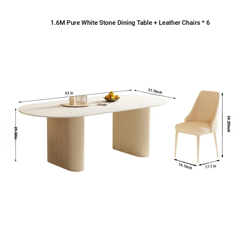 [One Table and Six Chairs] 55.12 in Pure White Rock Plate Oval Dining Table +6 Leather Chairs