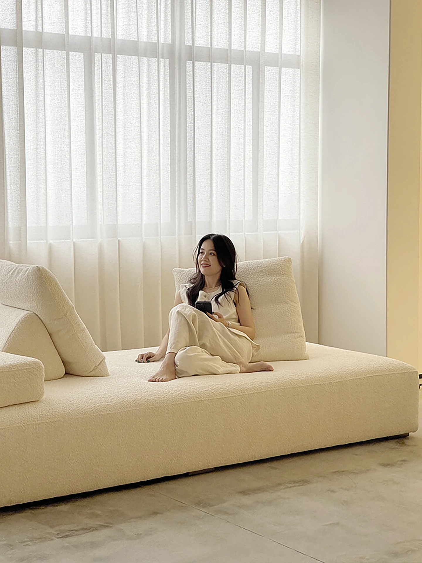 クリームカラーのファブリックソファ - イタリアンミニマリズムの極み、現代的なシンプルデザイン!直線的なスタイルが魅力のデザイナーズ中古民宿向け、アーチ型のユニークなフォルムでおしゃれなリビングを演出します。