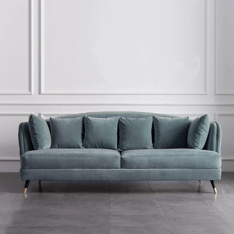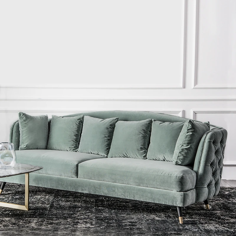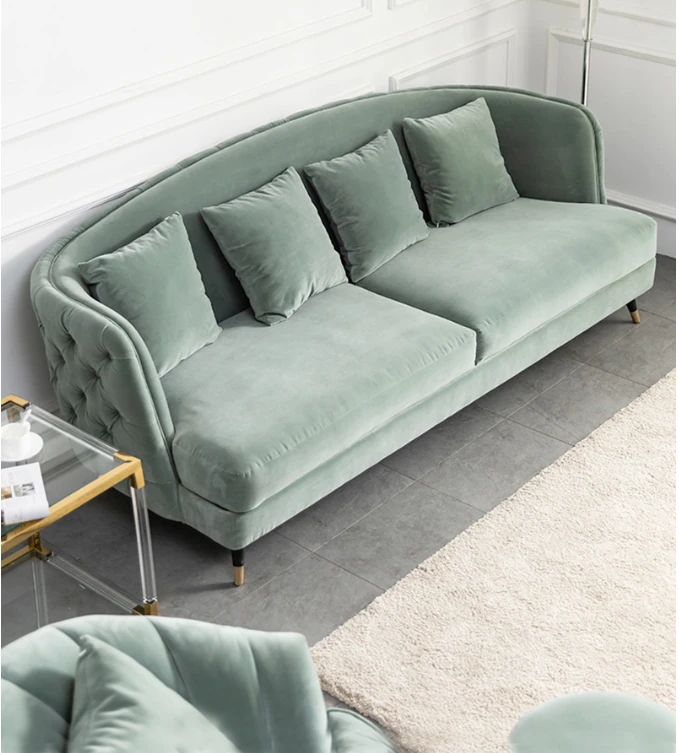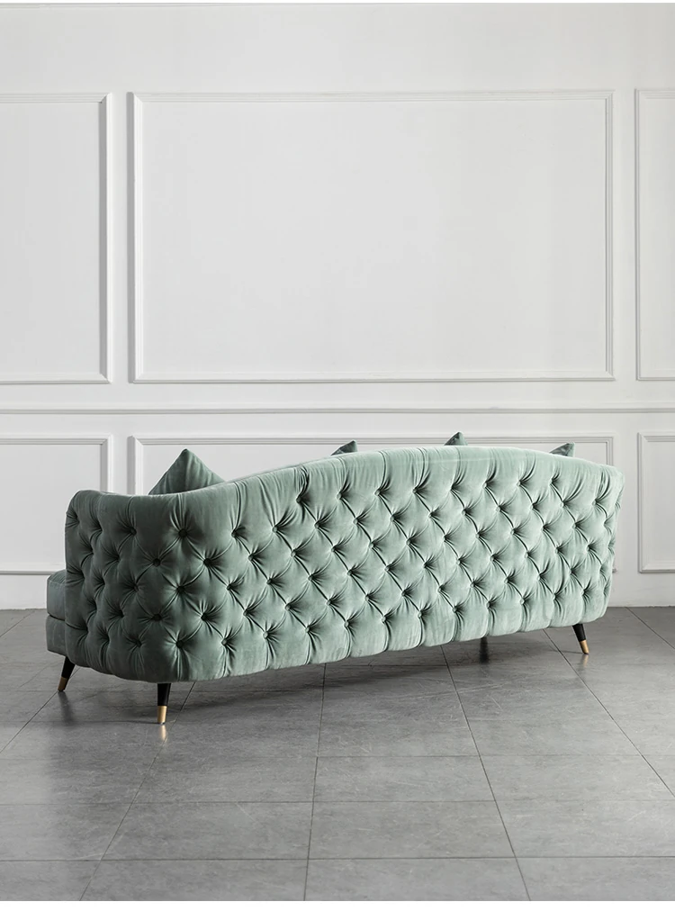 アメリカンポストモダンリビングルーム3人掛けソファ - シンプルで洗練されたデザイン、ラグジュアリーなベルベット生地使用。美容院やラウンジにも最適なスタイルで、居心地の良さを追求しました。あなたの空間を格上げする一品です!