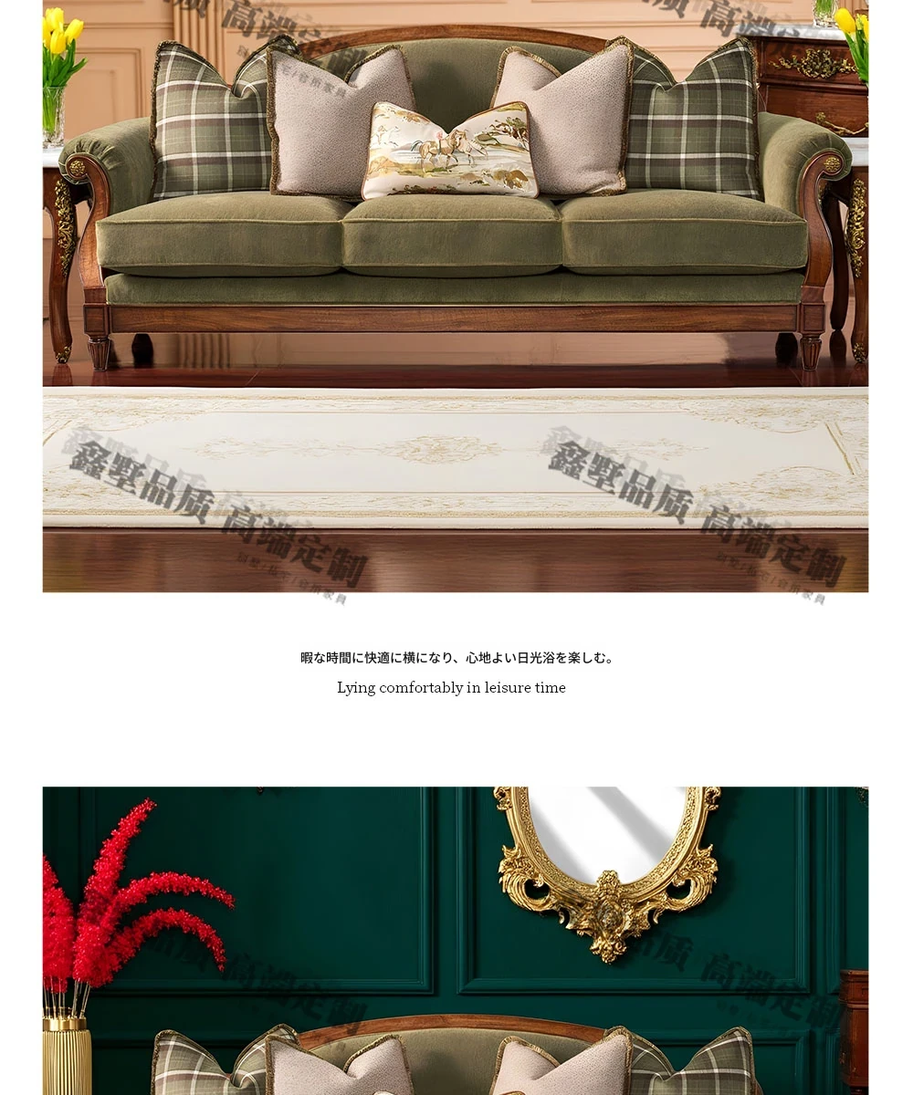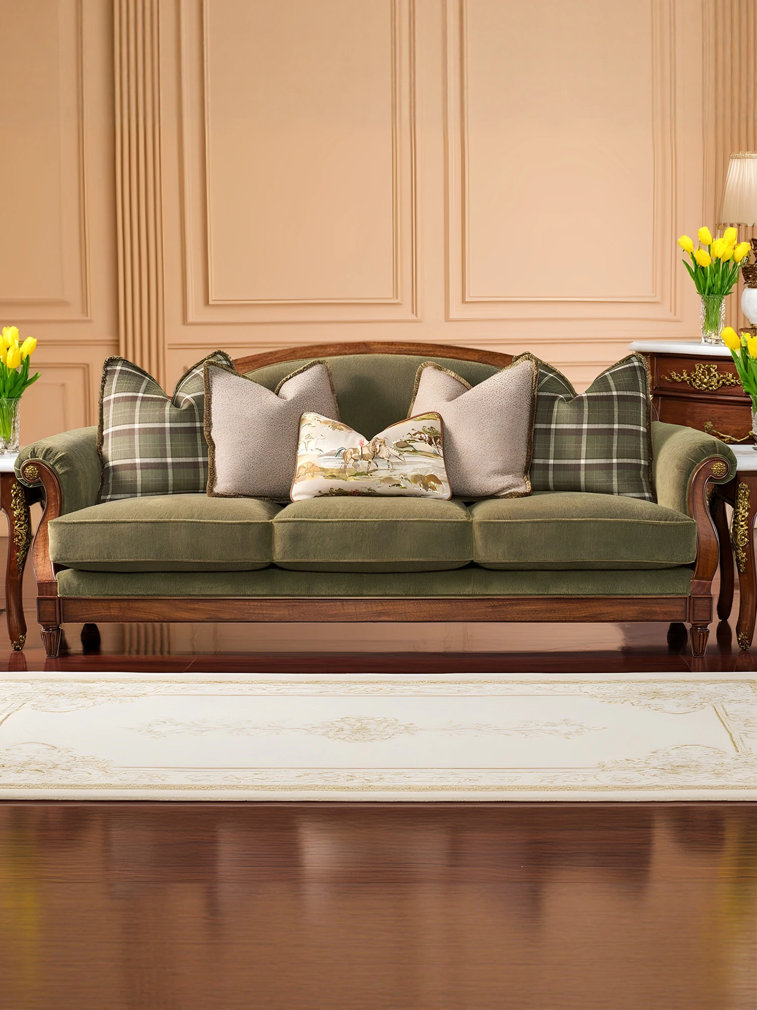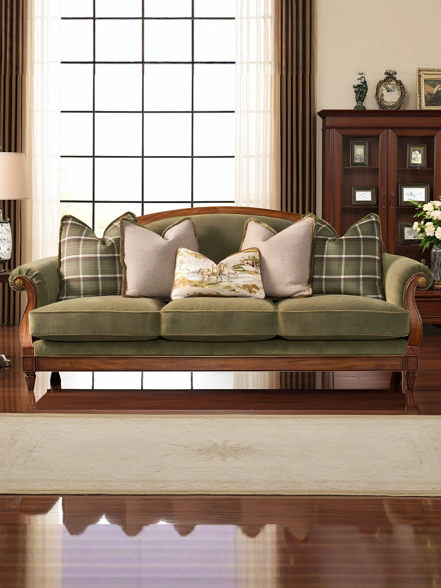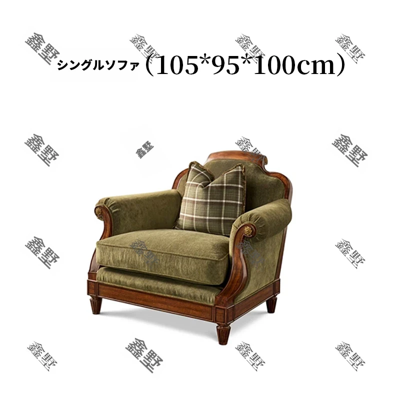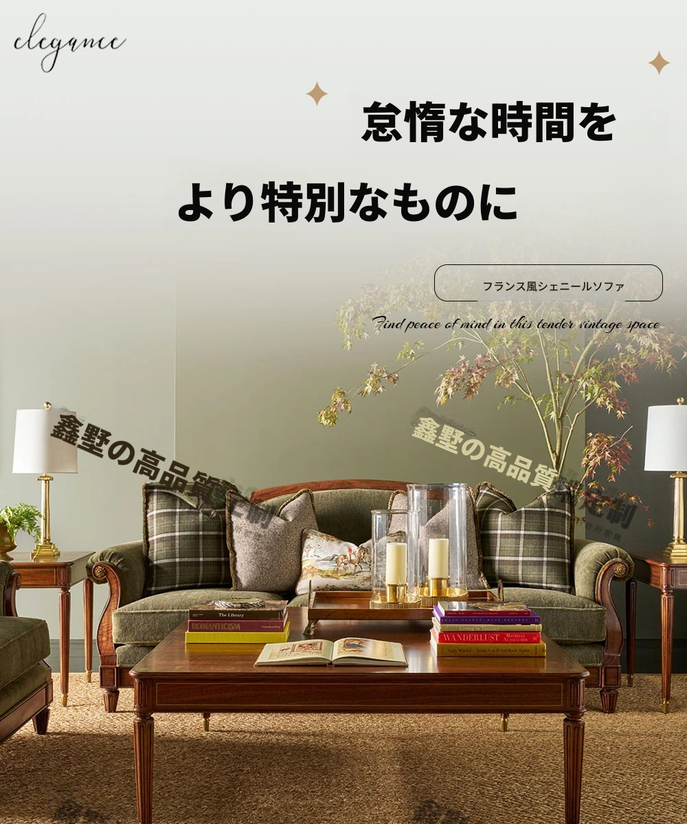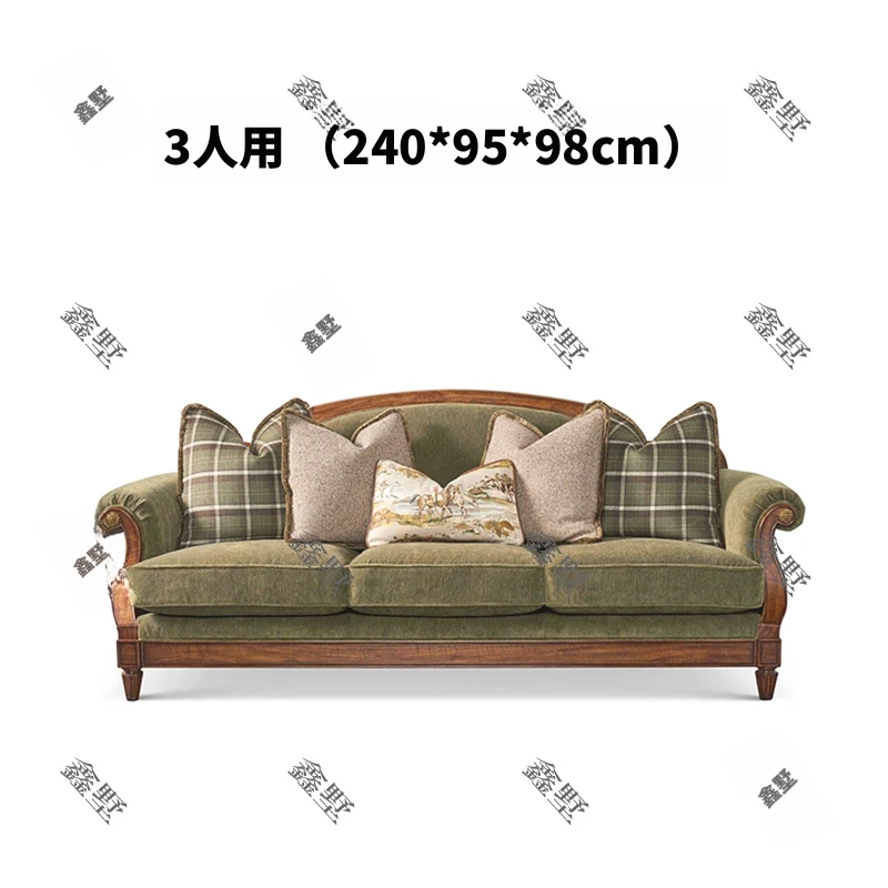 アメリカンレトロデザインの無垢材ソファ - ヴィラのリビングに最適なデザイナー3人掛けソファ。フレンチアンティーク風のシェニール大ソファで、上品で快適な空間を演出します。