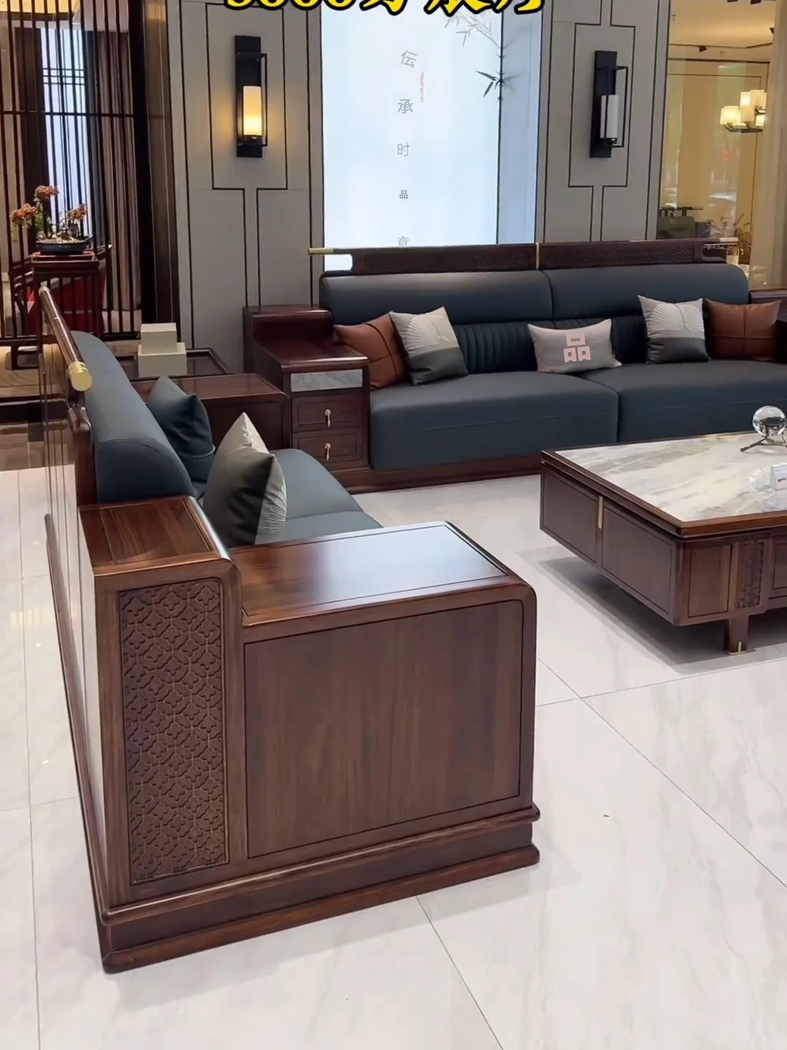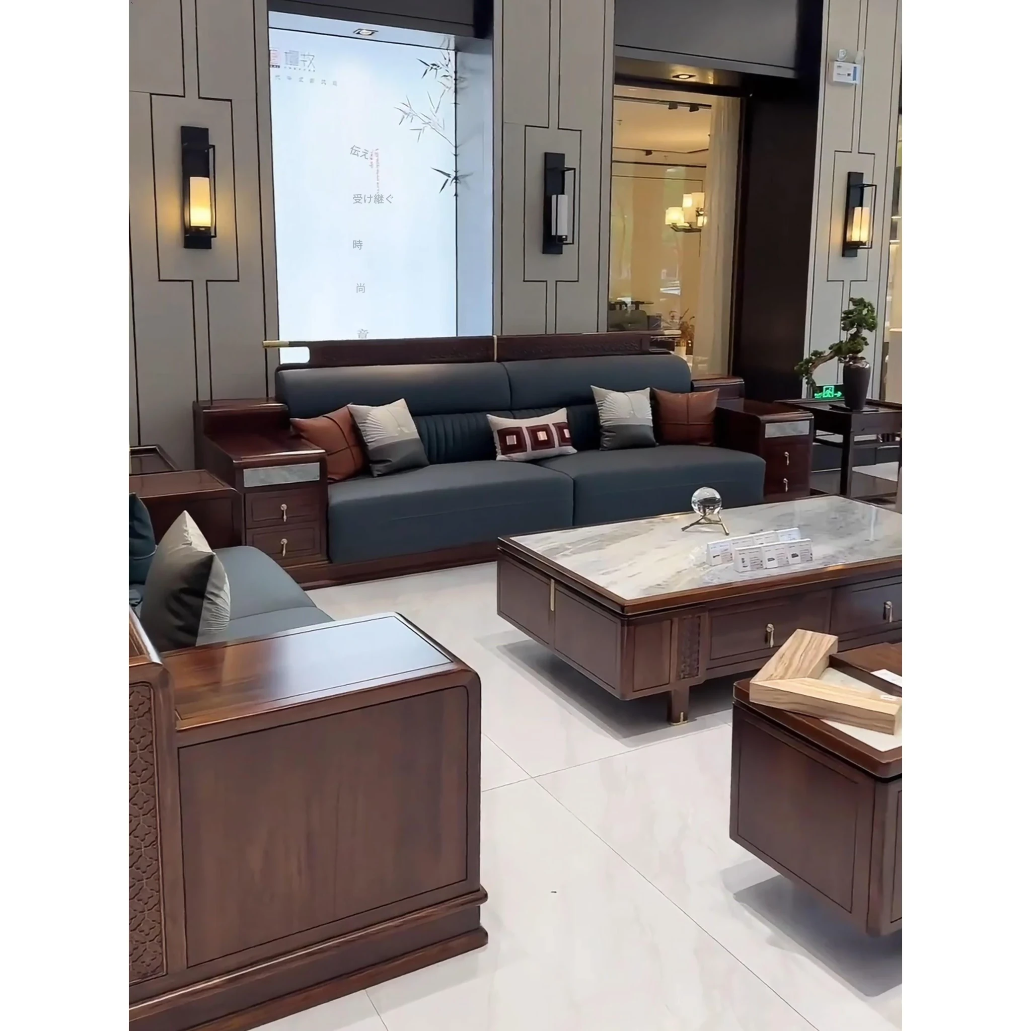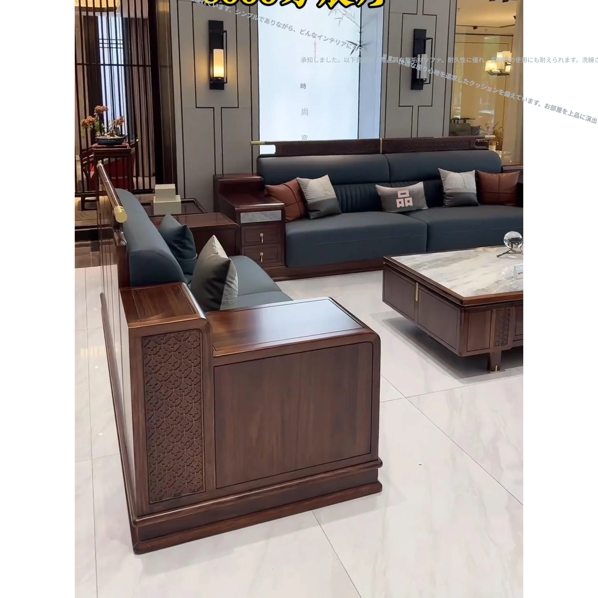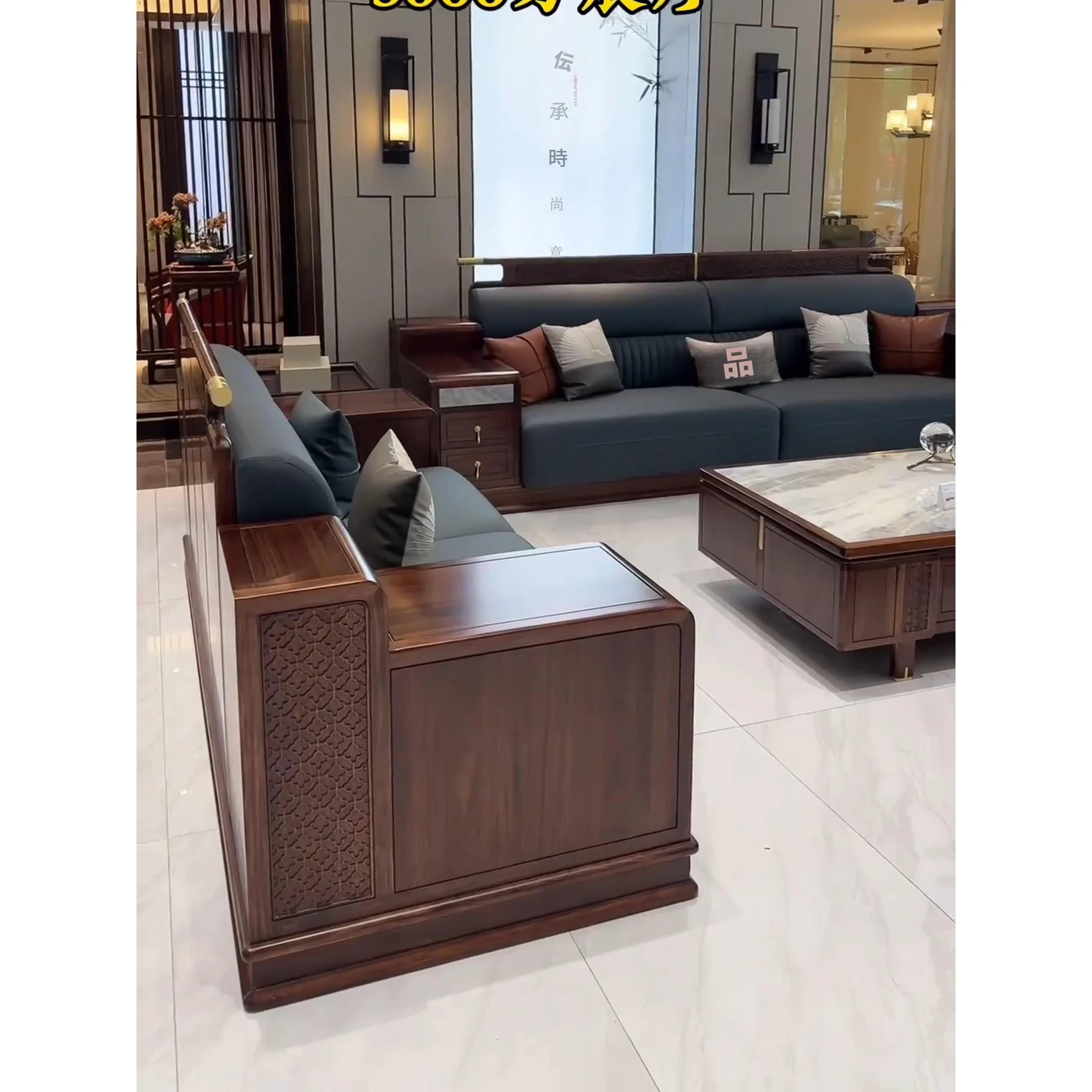 新中式ウッドソファー - シンプルでラグジュアリーな本革、禅の美学を感じる高級別荘向けの中国風家具。広々としたリビングルームに最適!