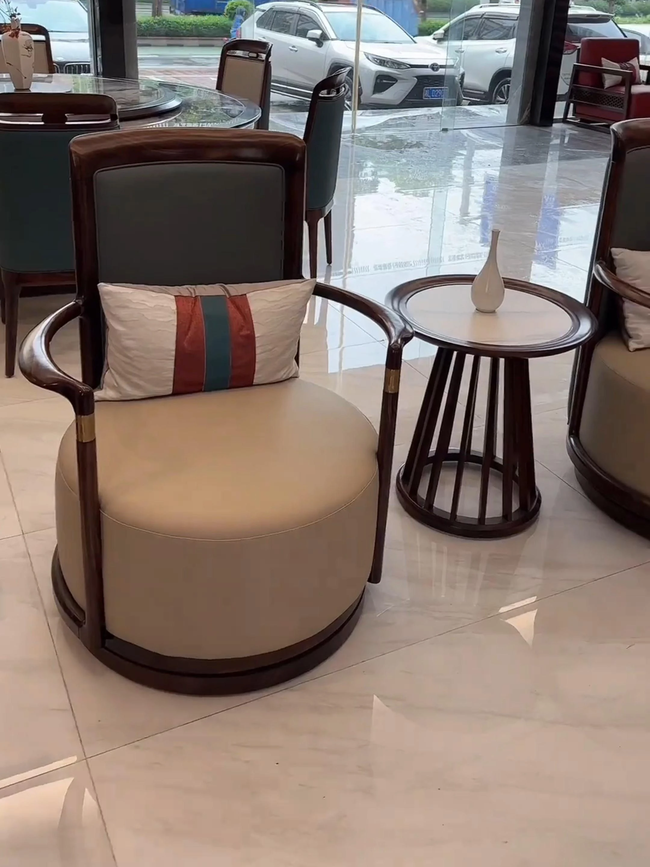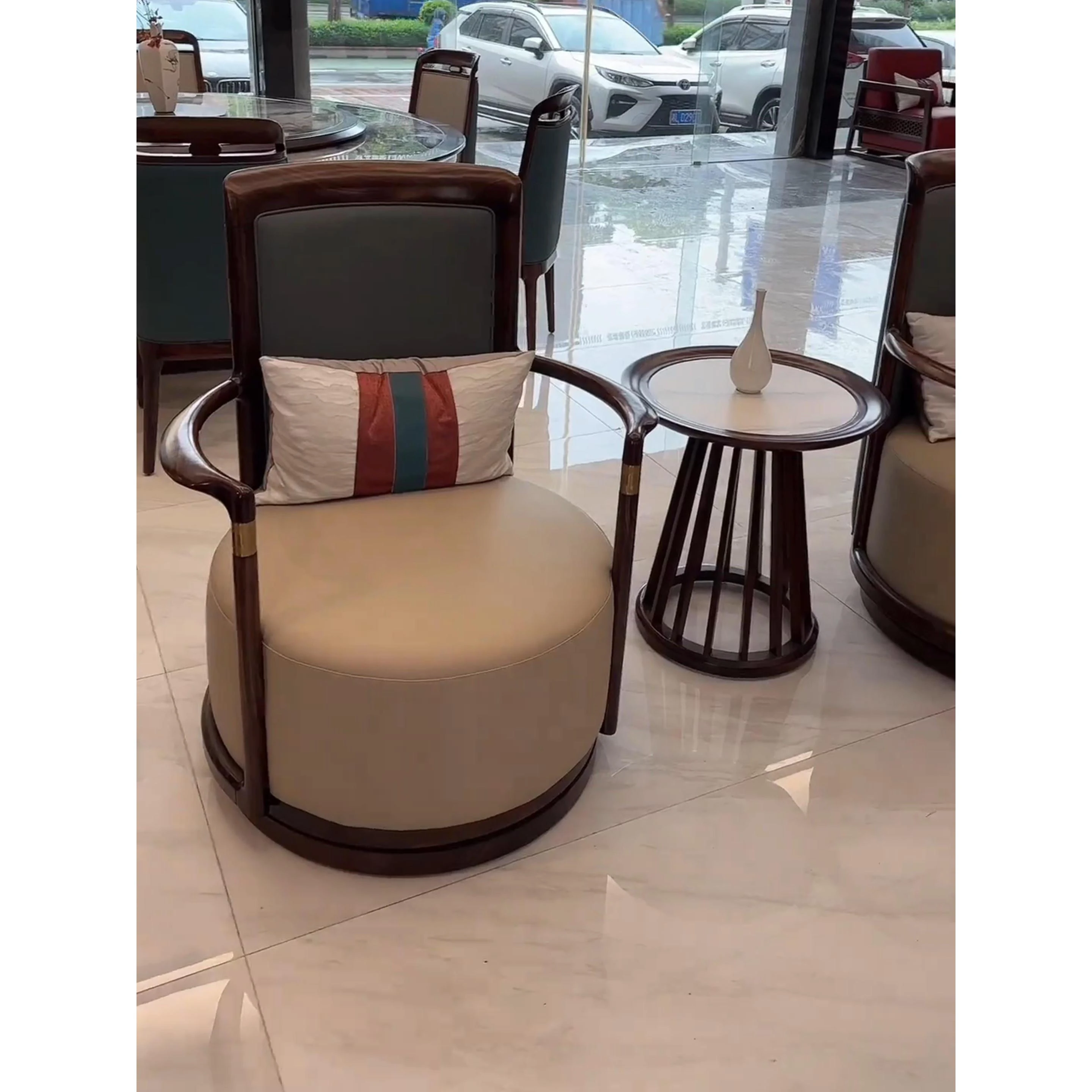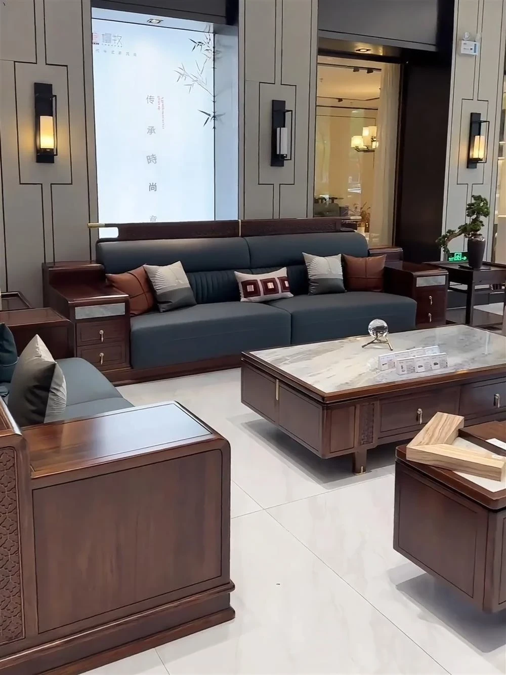 新中式ウッドソファー - シンプルでラグジュアリーな本革、禅の美学を感じる高級別荘向けの中国風家具。広々としたリビングルームに最適!
