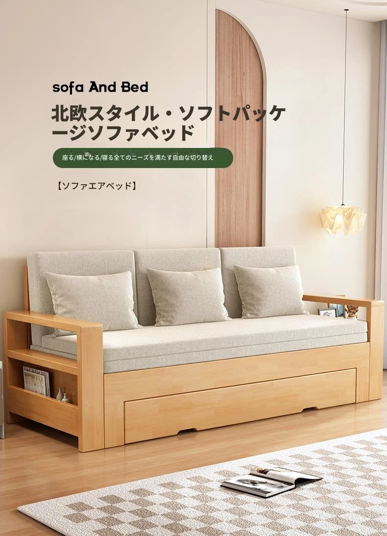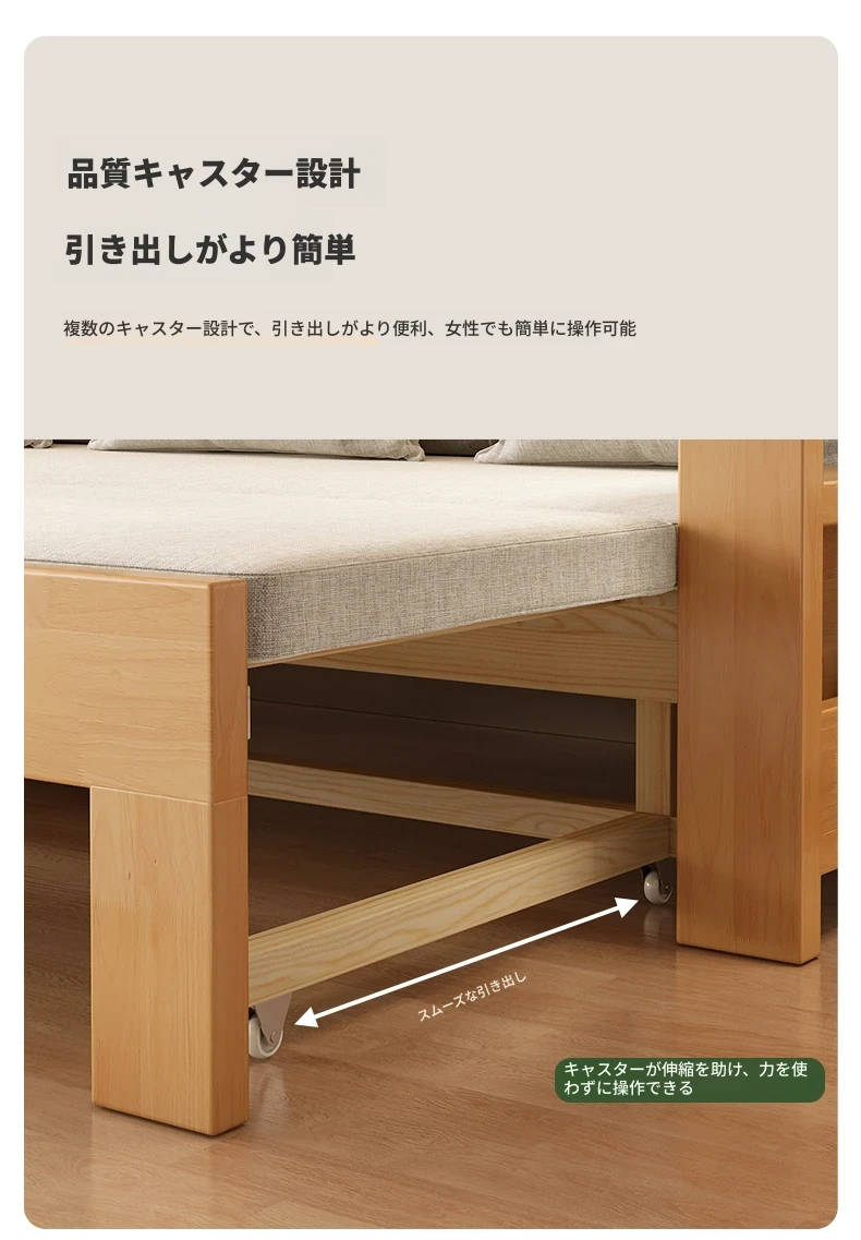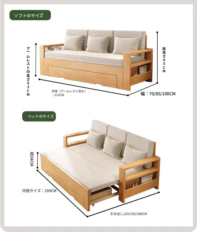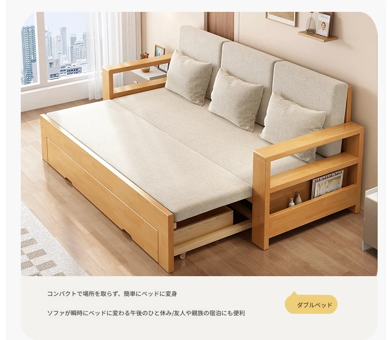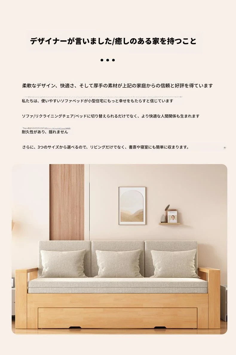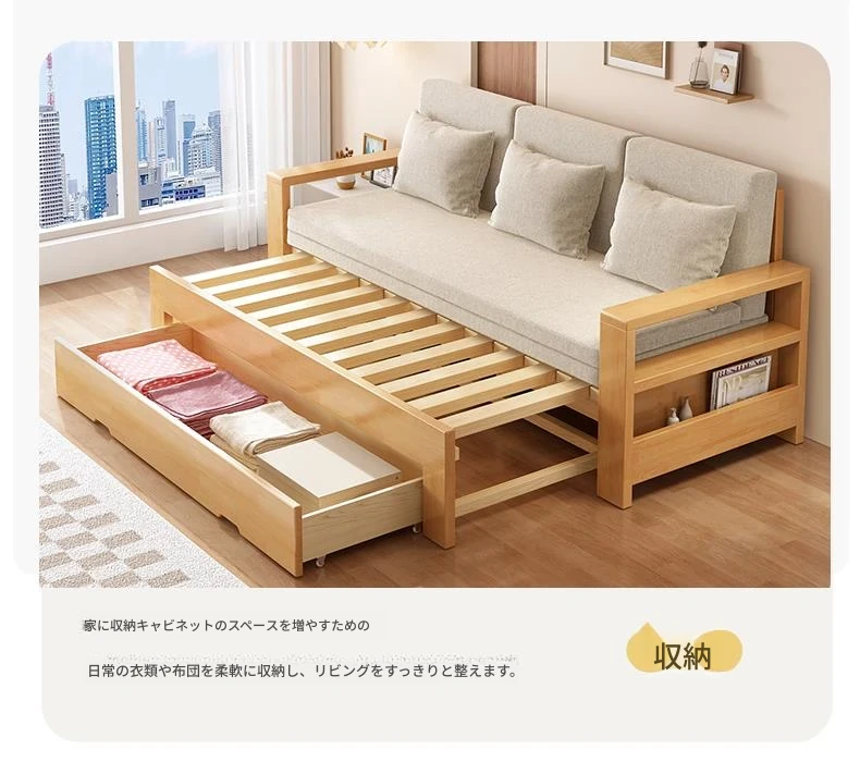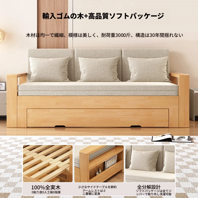 香港送料無料!全実木製のソファベッド、折りたたみ式で小型住宅にぴったり!多機能で伸縮可能なデザイン、ラバーウッドと布のコンビネーションで快適な空間を実現!