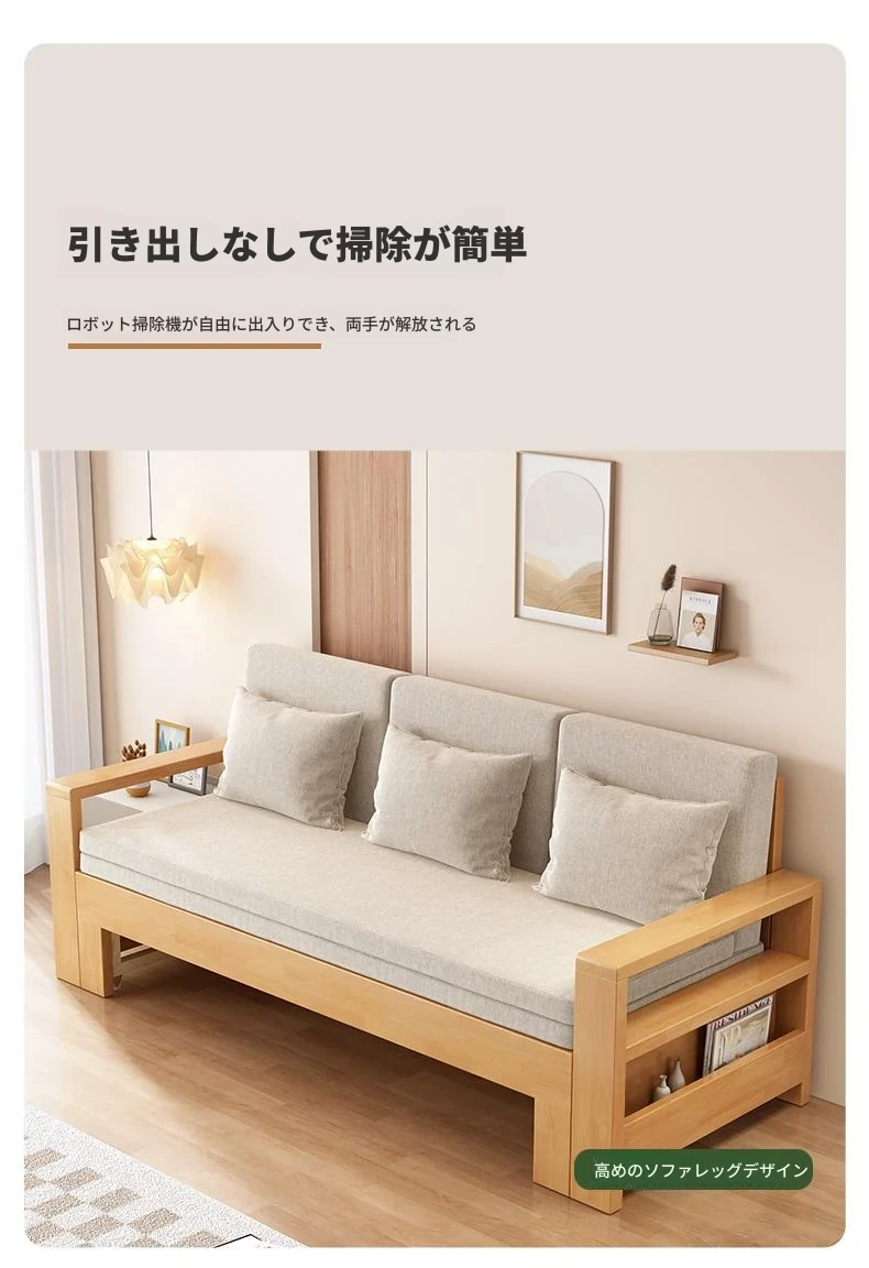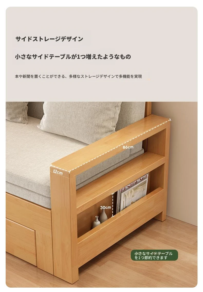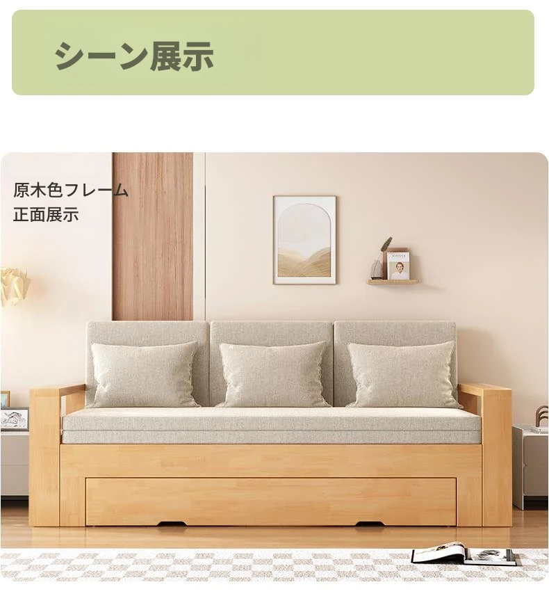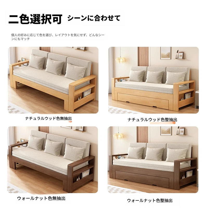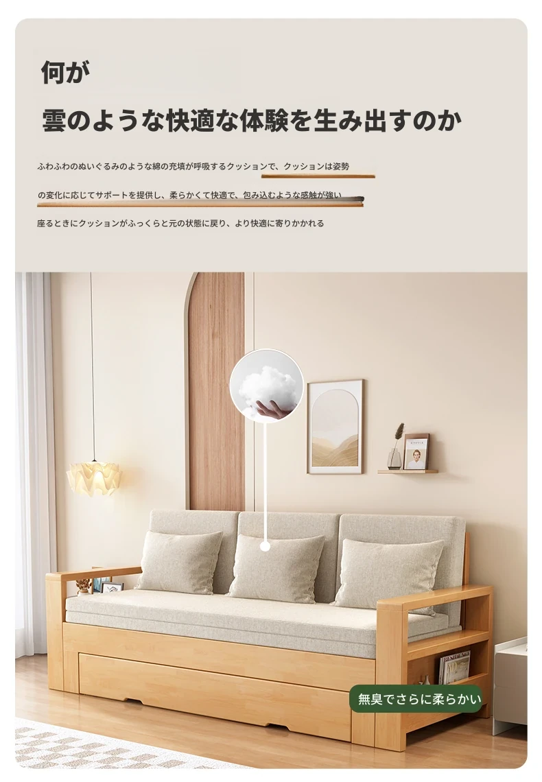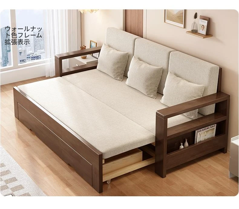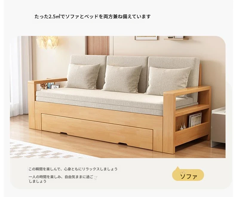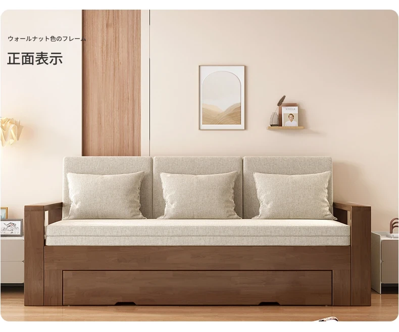 香港送料無料!全実木製のソファベッド、折りたたみ式で小型住宅にぴったり!多機能で伸縮可能なデザイン、ラバーウッドと布のコンビネーションで快適な空間を実現!