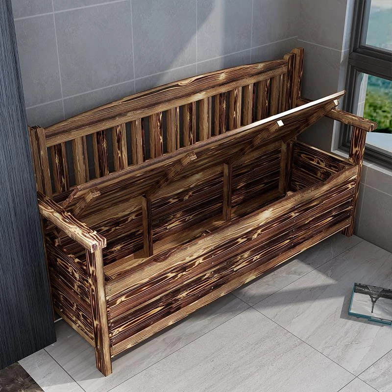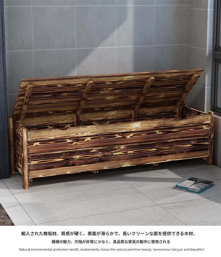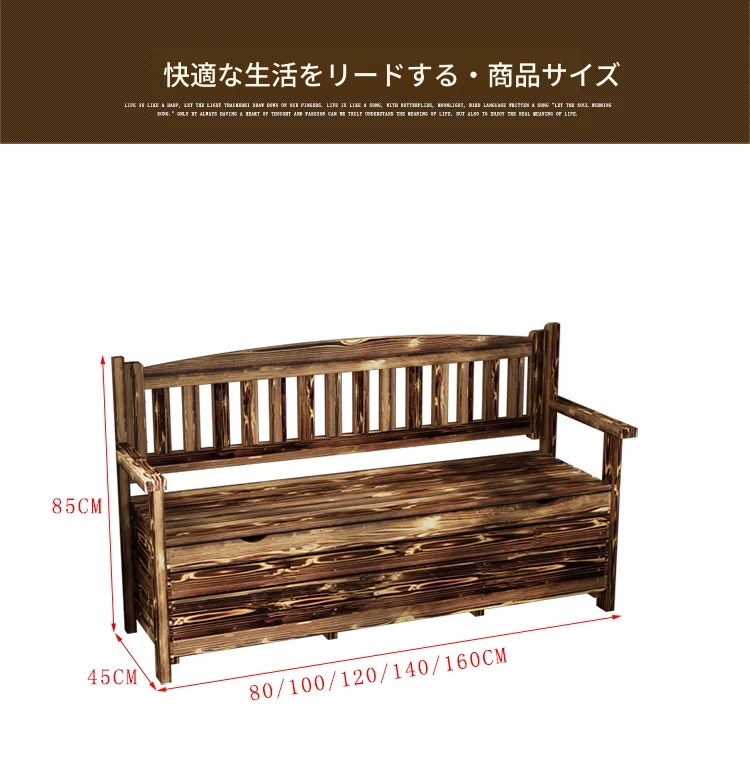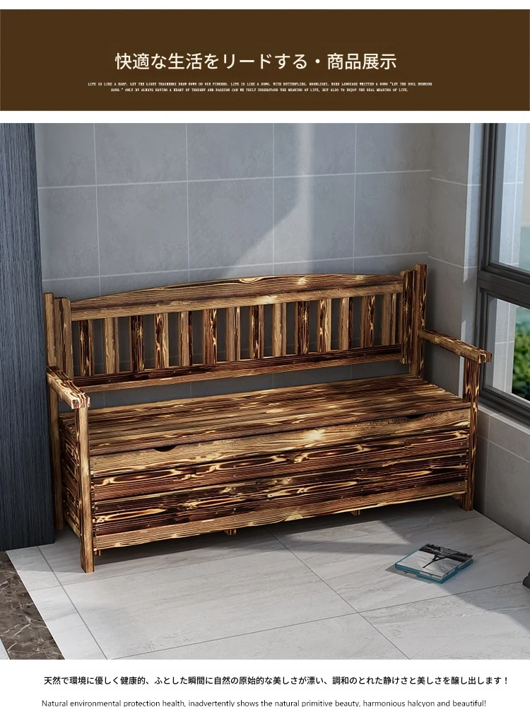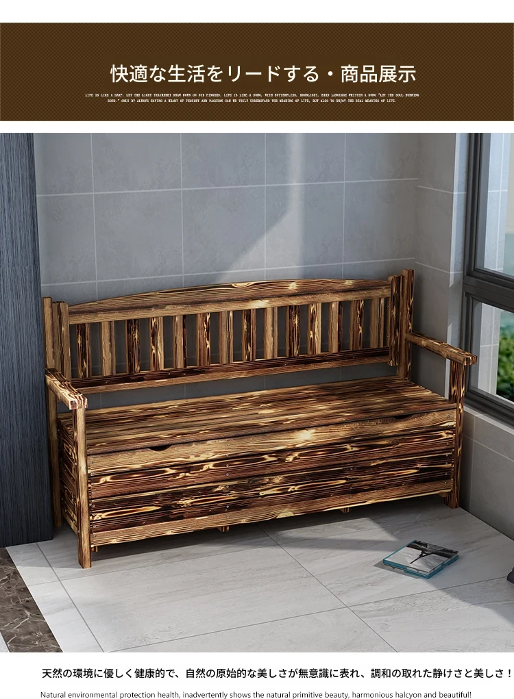 [香港送料無料] 高級天然木製ロングベンチ!バルコニー収納付き炭化ソファ1人用、アウトドア庭園用アームレスト付き背もたれ。快適なひとときをお楽しみください!