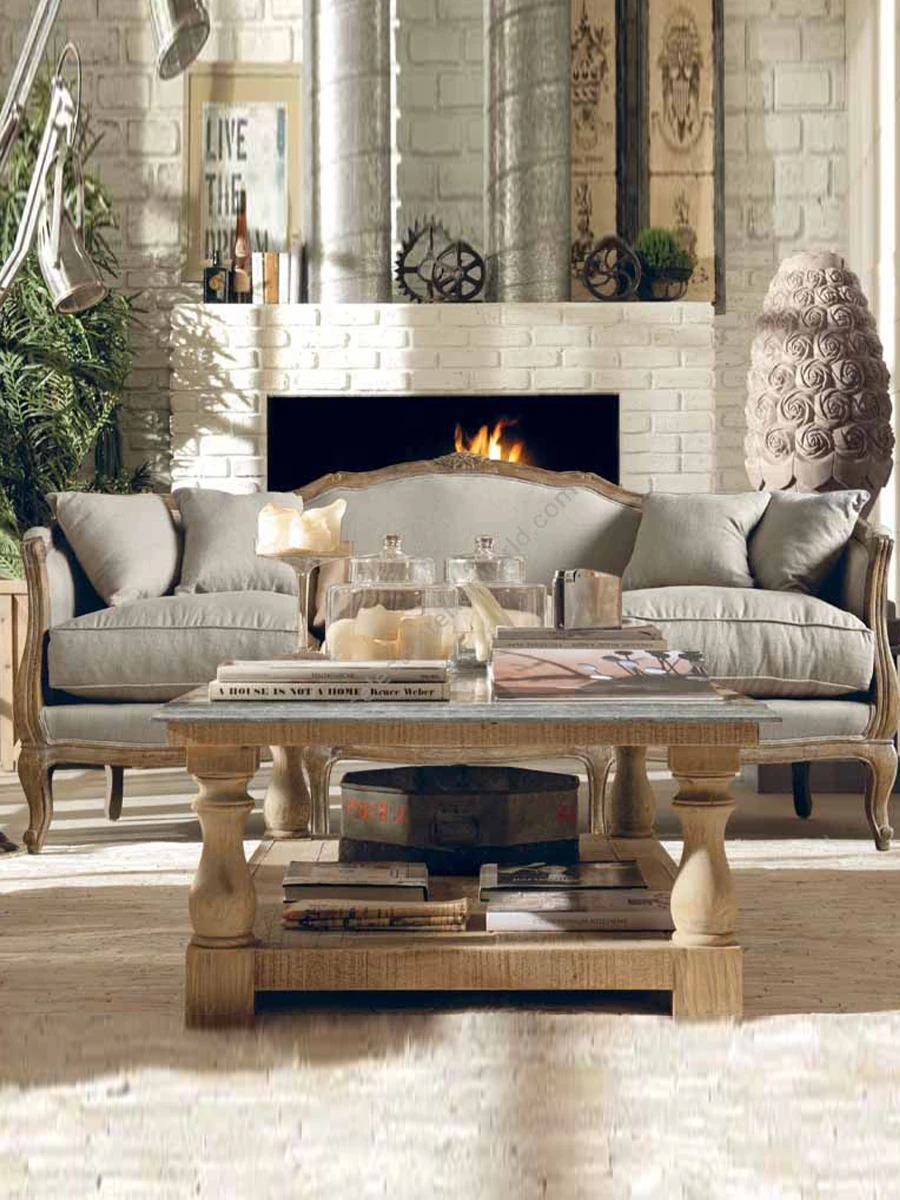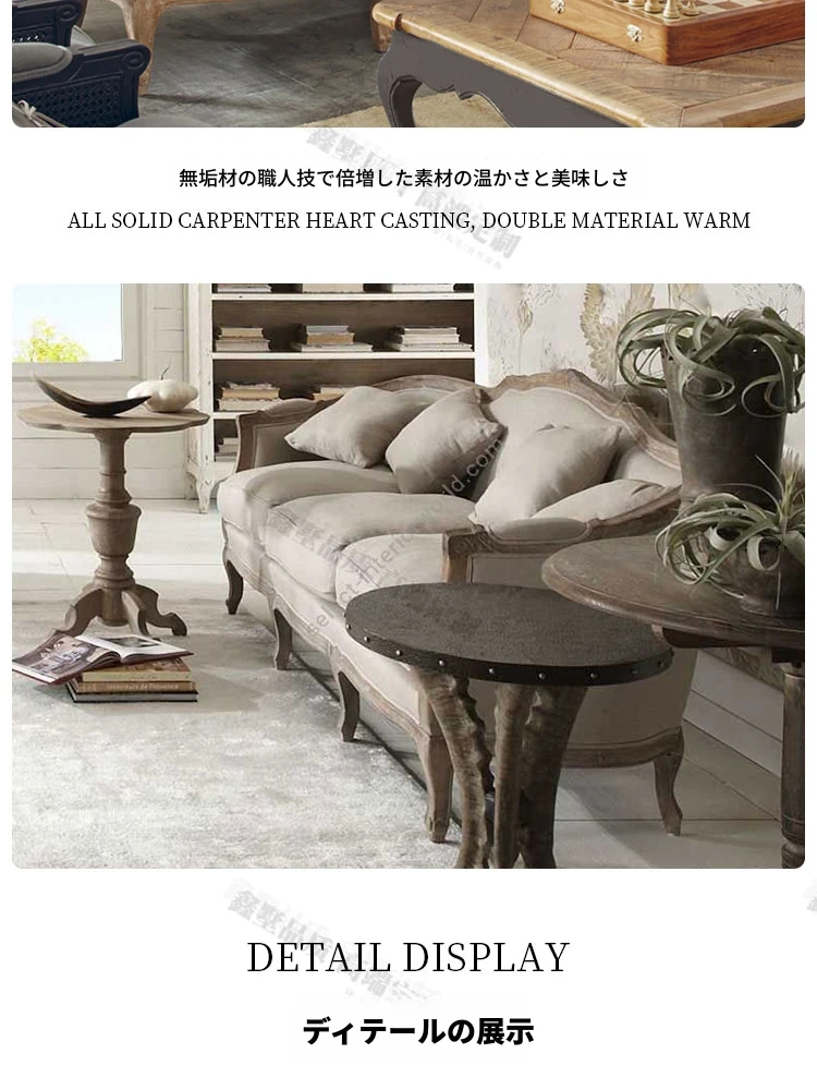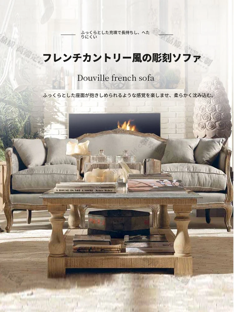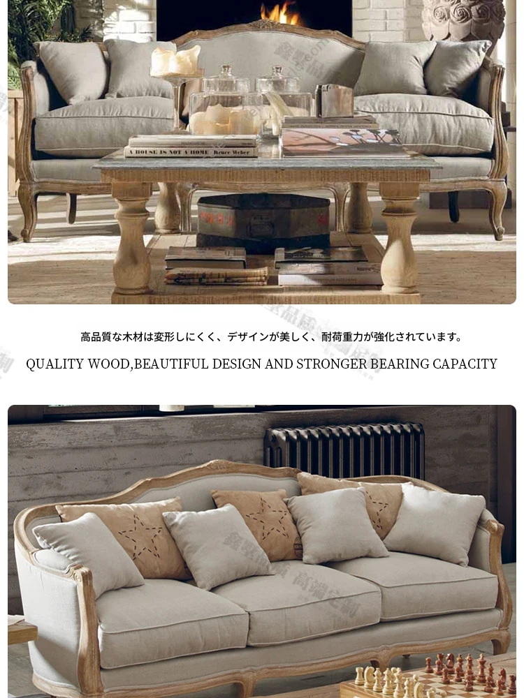 フレンチスタイルの無垢材ソファ|アメリカンカントリー風|小さなリビングにぴったりな布張り3人掛けソファ|オーク材使用のヴィンテージ風別荘ソファ|おしゃれで快適な空間を演出します!