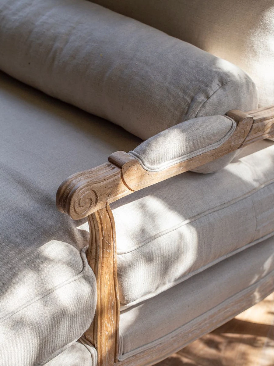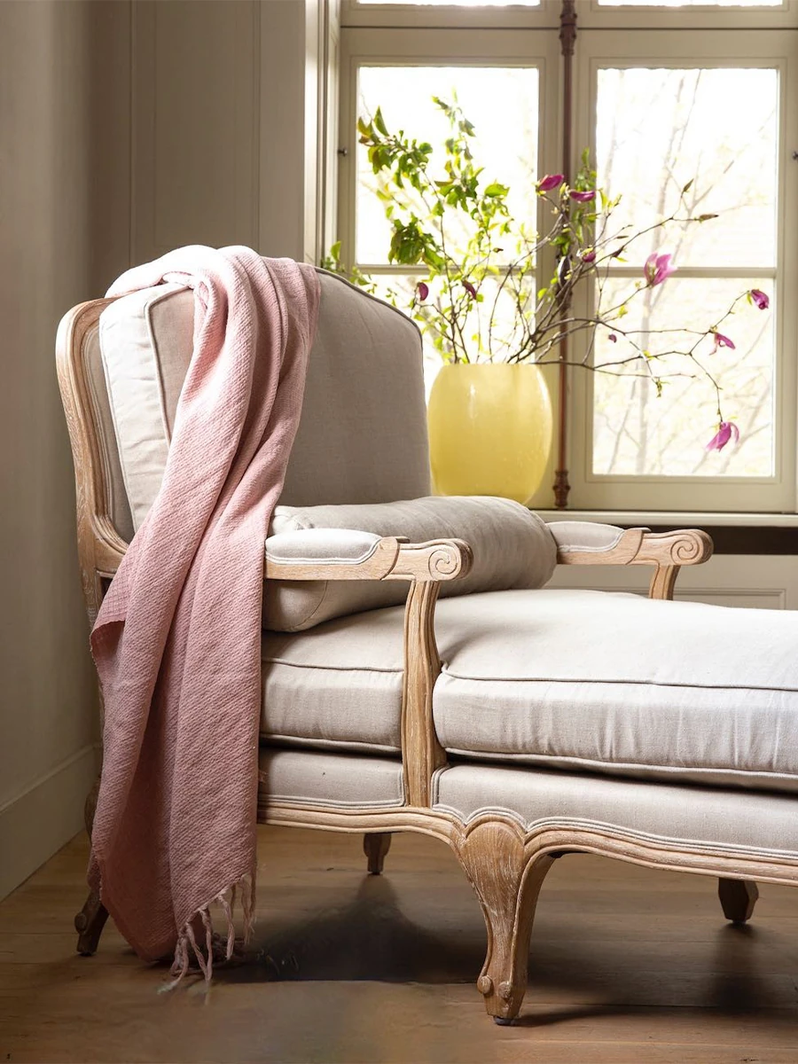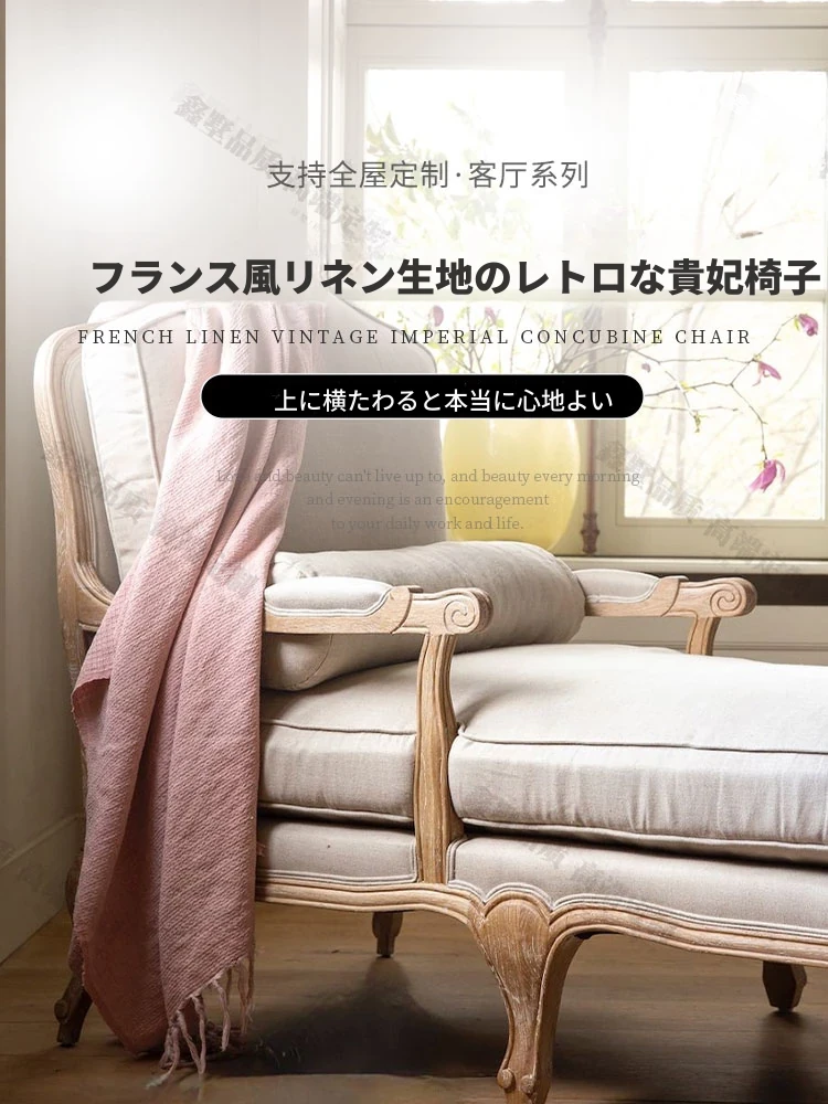 フレンチスタイルの無垢材製の貴妃椅子、コンパクトなリビングにぴったり!心地よい布張りのソファ、アメリカンスタイルのベッドサイドベンチとしても活躍する、美しいリラックスチェア。