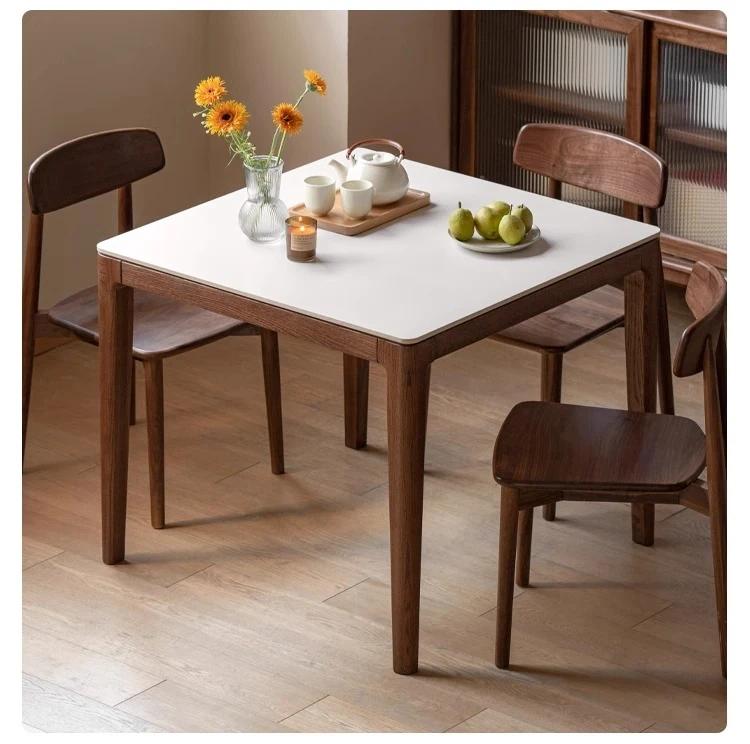 (ウォールナット色)0.8メートルアイボリー白岩板ダイニングテーブル(800*800*750mm)H54R07