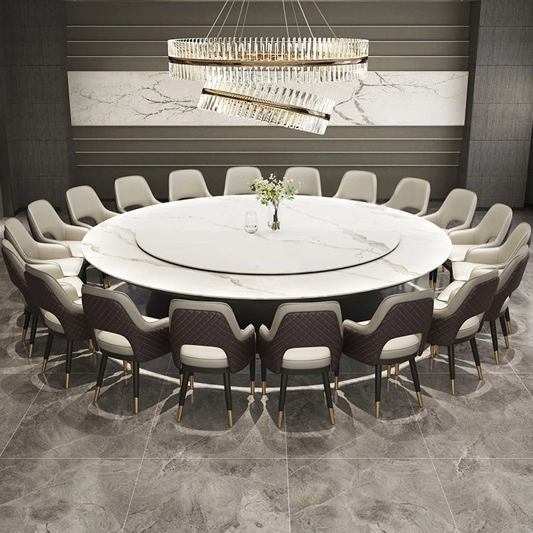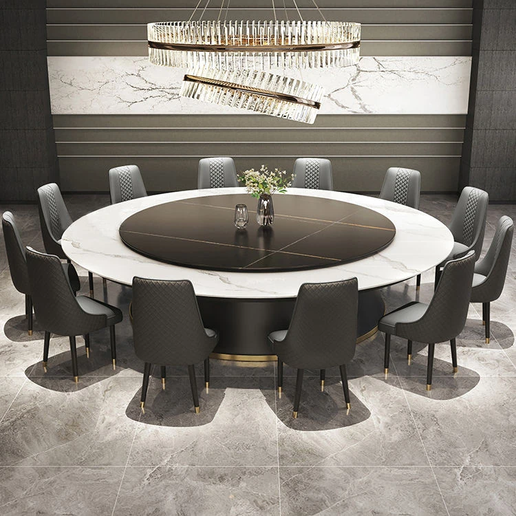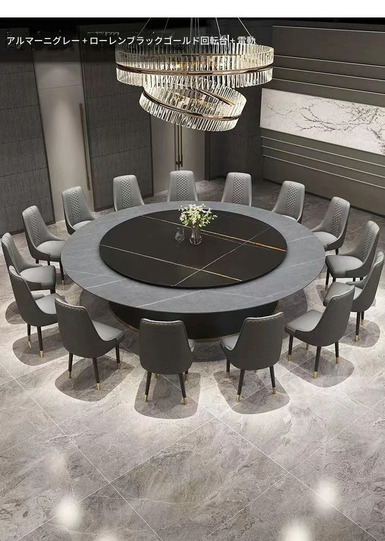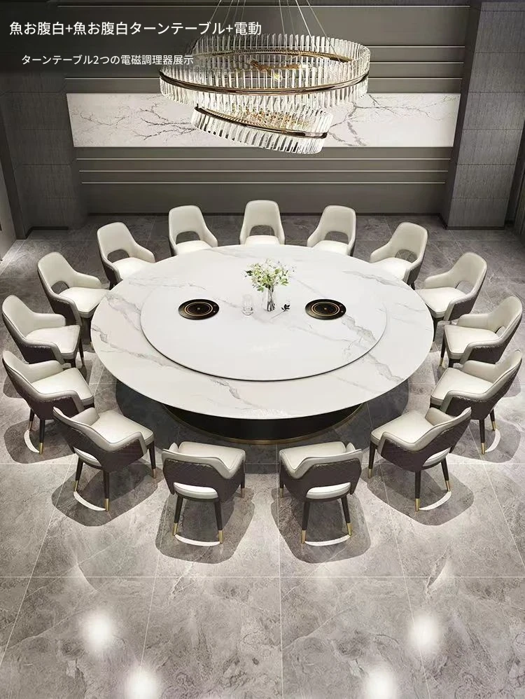 大理石の電動ダイニングテーブル - 12人用、2メートルの広々とした円形、豪華な別荘やホテルに最適!高級感あふれる岩板デザインで、心地よい食事のひとときを演出します。電磁調理器付きで、便利さも抜群!