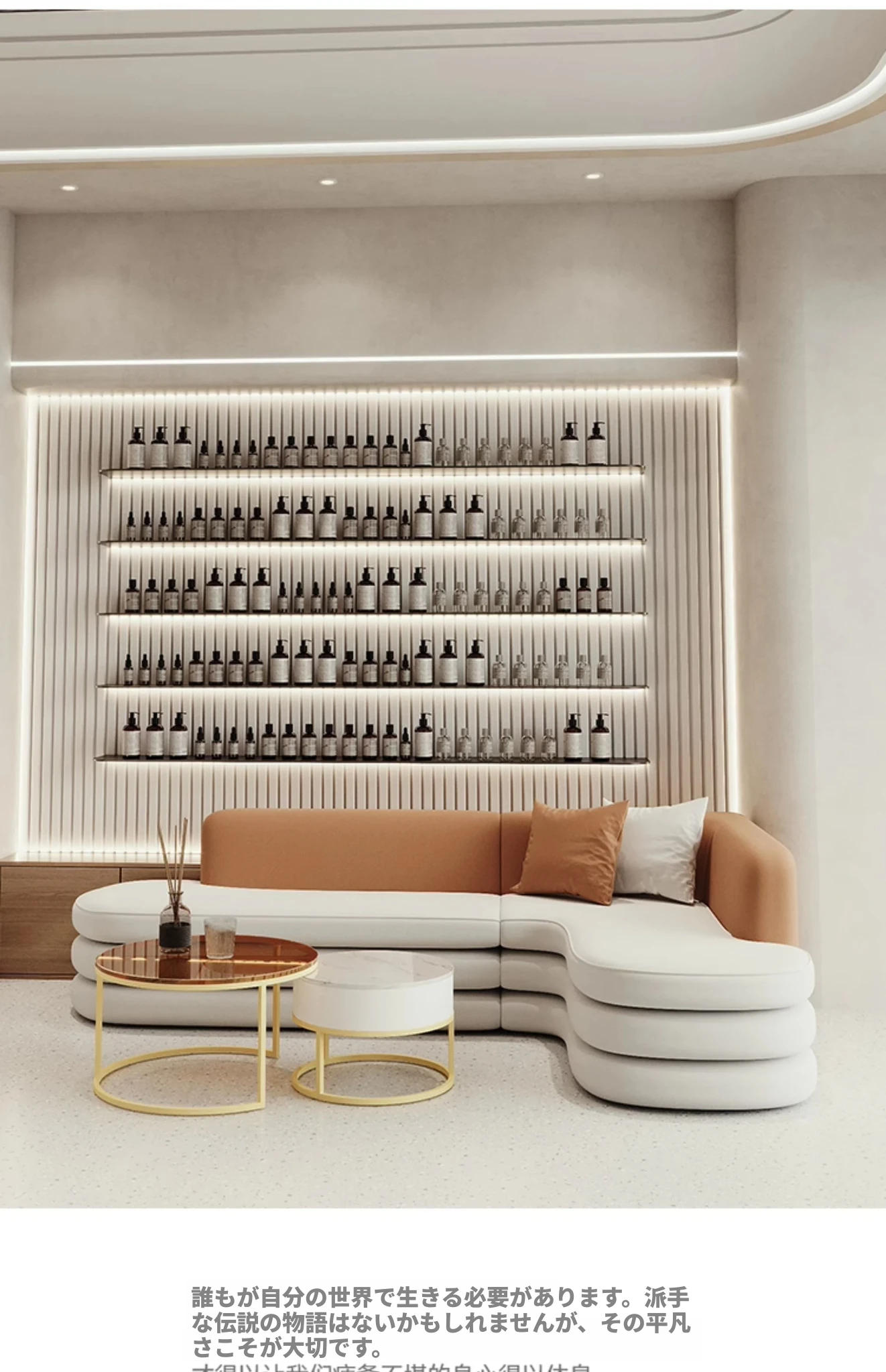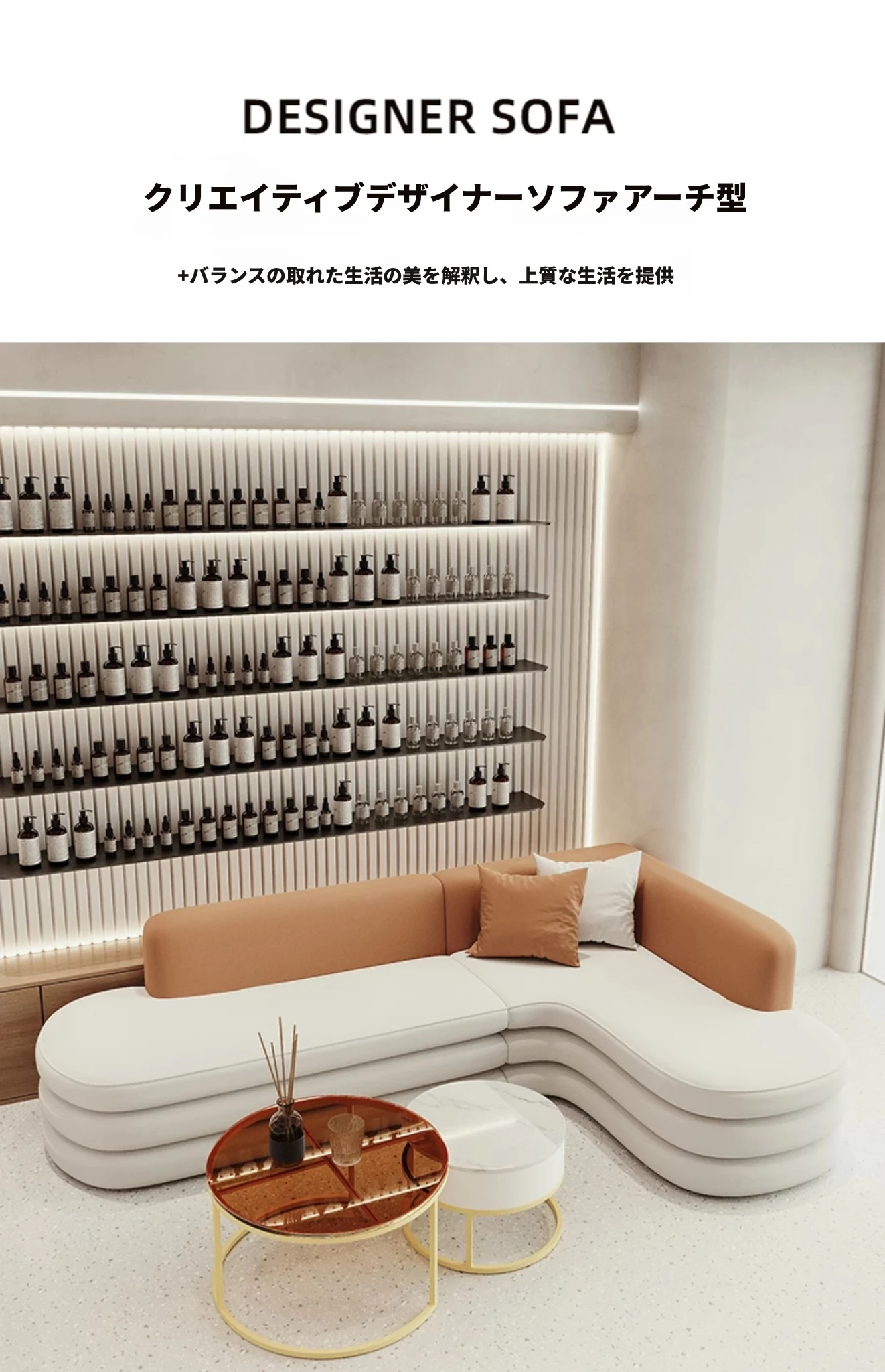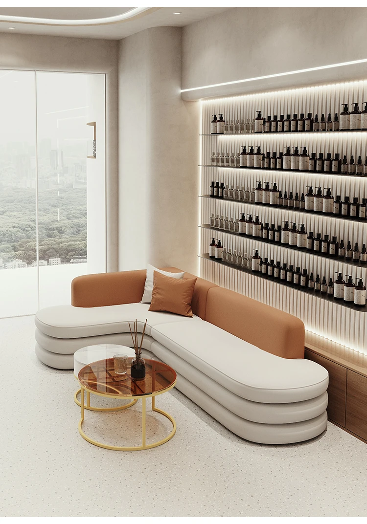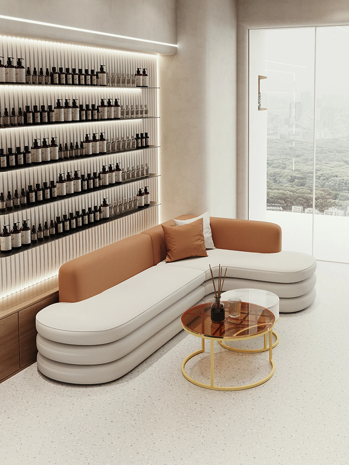 L型美容院専用コーナーソファ - 独創的な7字型デザインで、狭いスペースにもぴったり!快適な休息エリアを演出し、ゲストをおもてなし。おしゃれで機能的な接客空間を実現します!