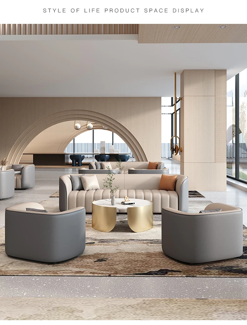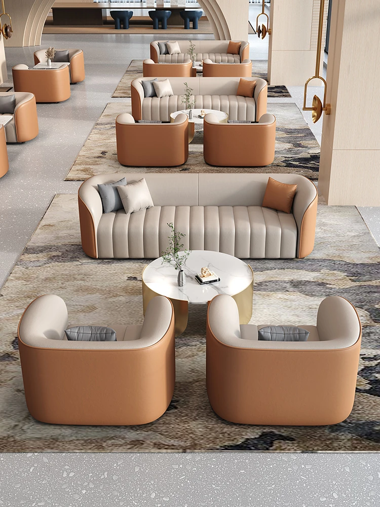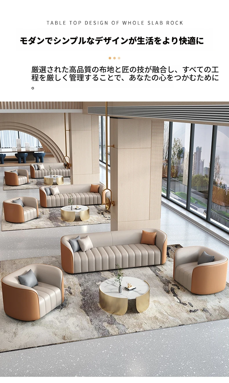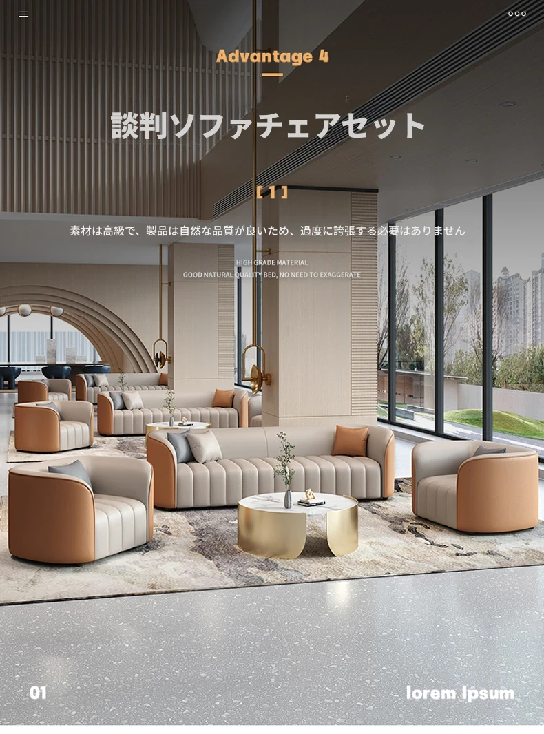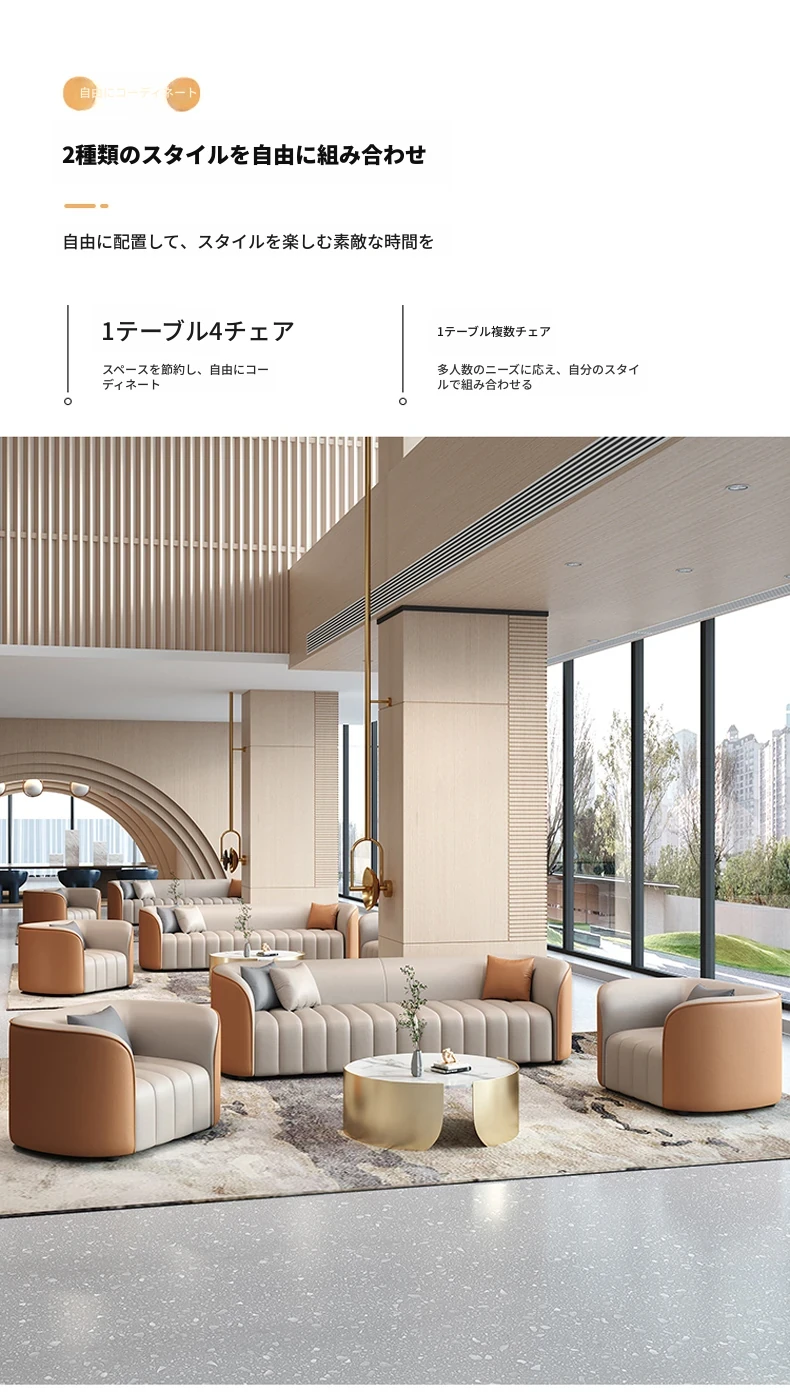 ホテルロビーのVIPラウンジ!快適なソファでお客様をお迎えし、リラックスしたひとときを提供します。販売オフィスの商談にも最適なデザイン。高級感あふれる空間で大切なお客様をおもてなし!