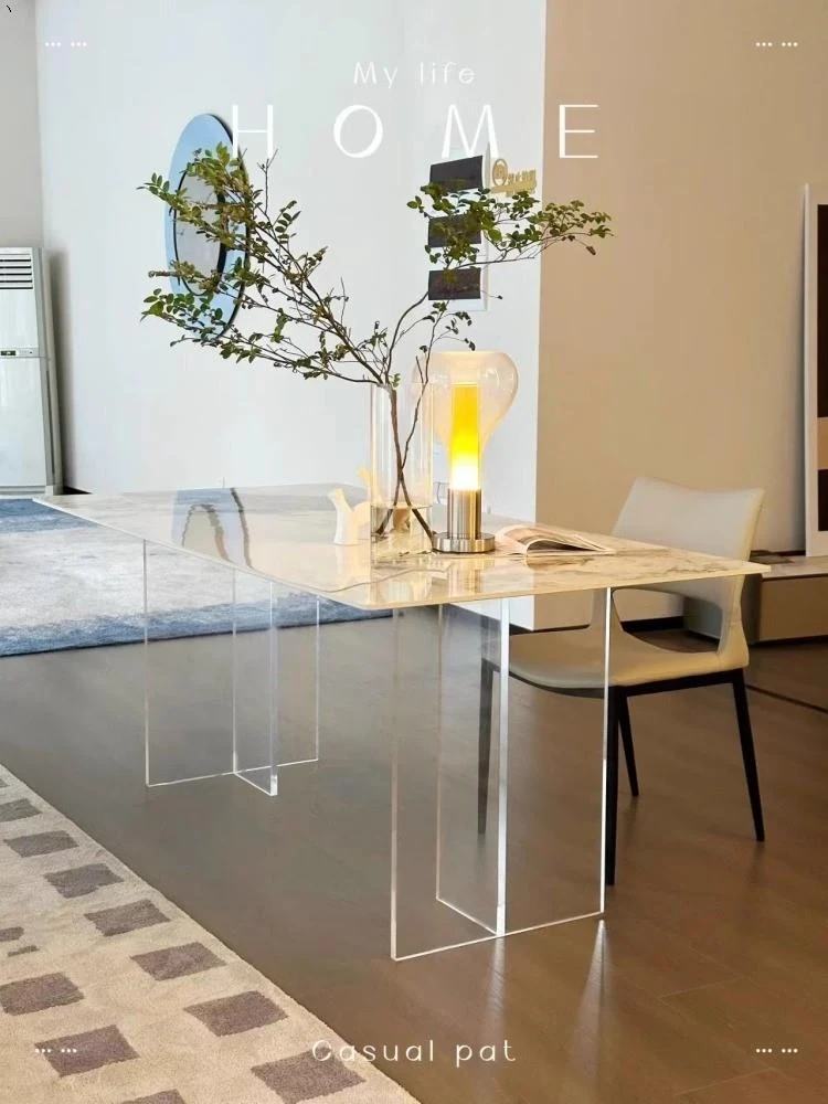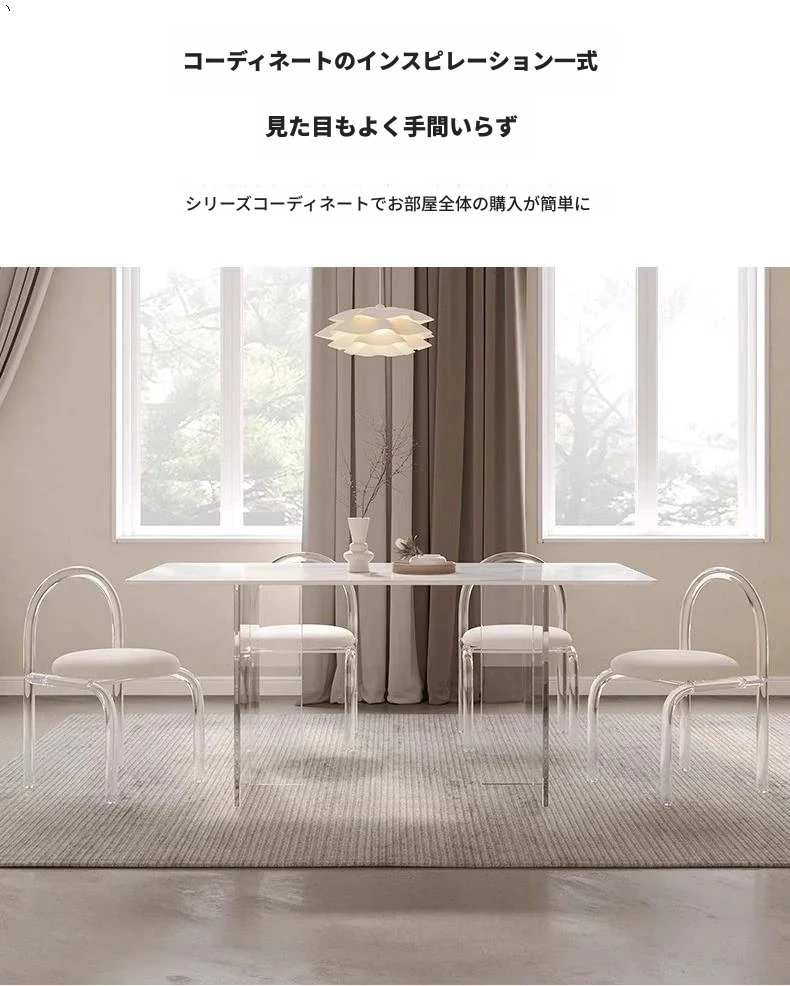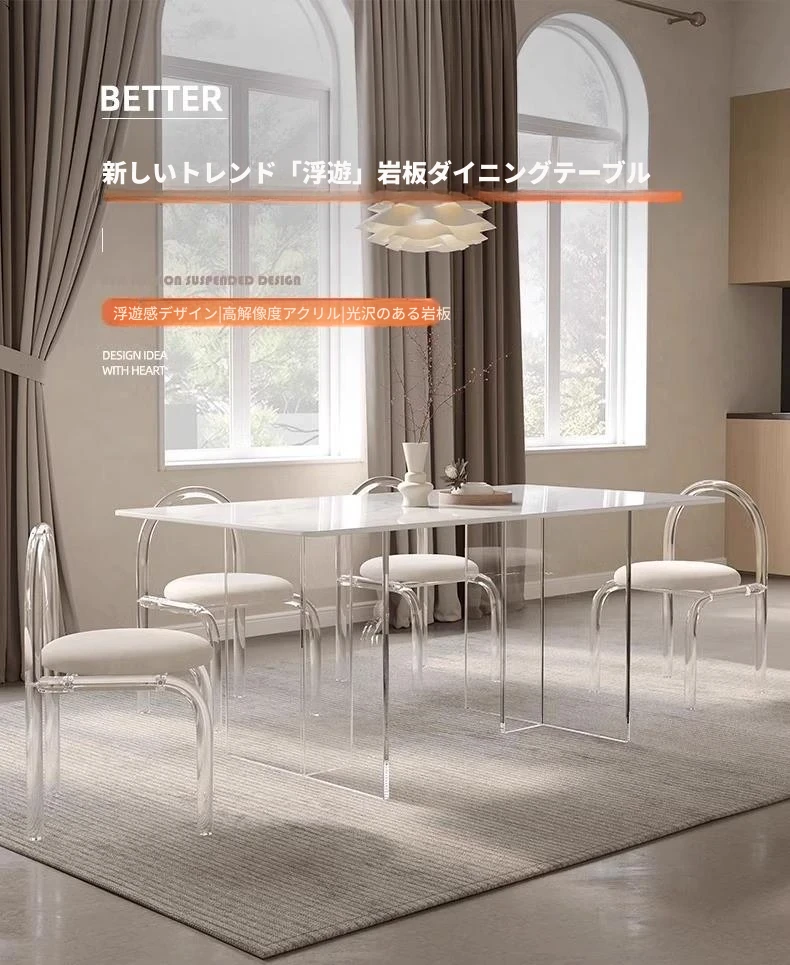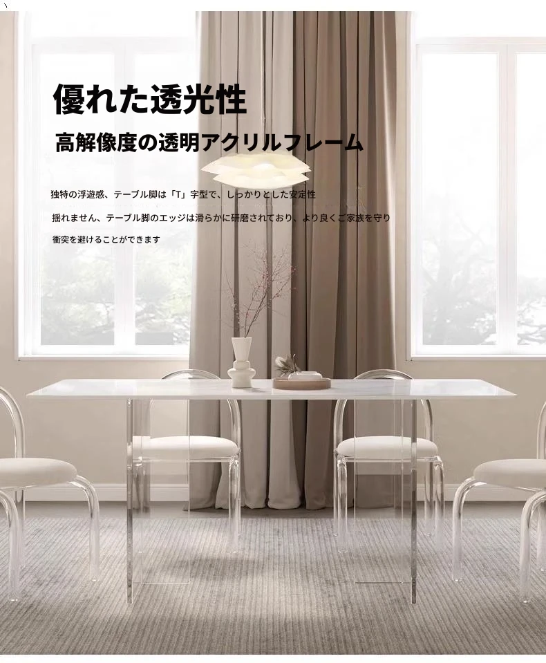 アクリル製の浮遊感を持つモダンな長方形ダイニングテーブルと椅子のセット - 小型住宅にぴったりの透明感あふれるシンプルデザイン!