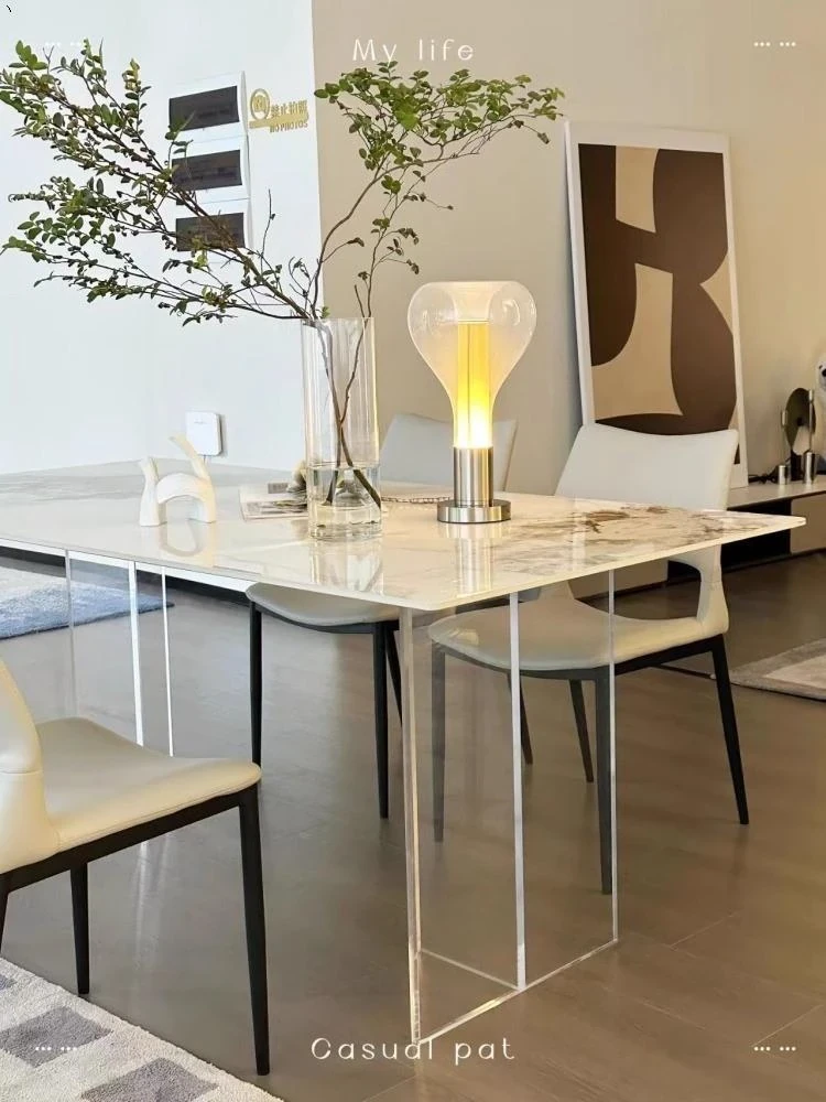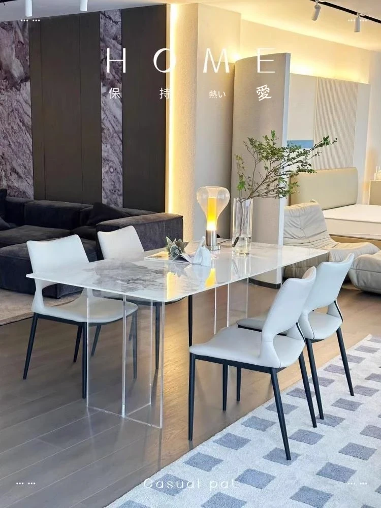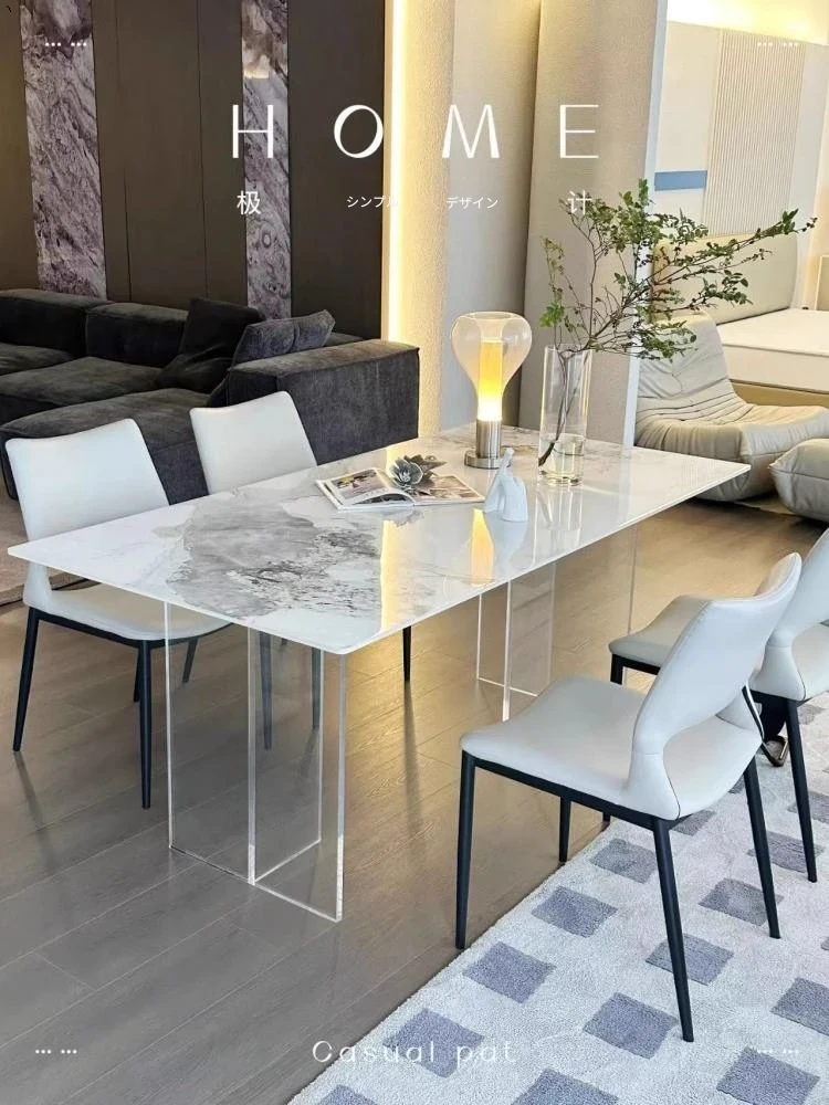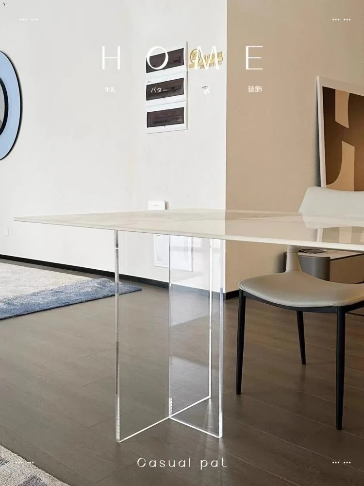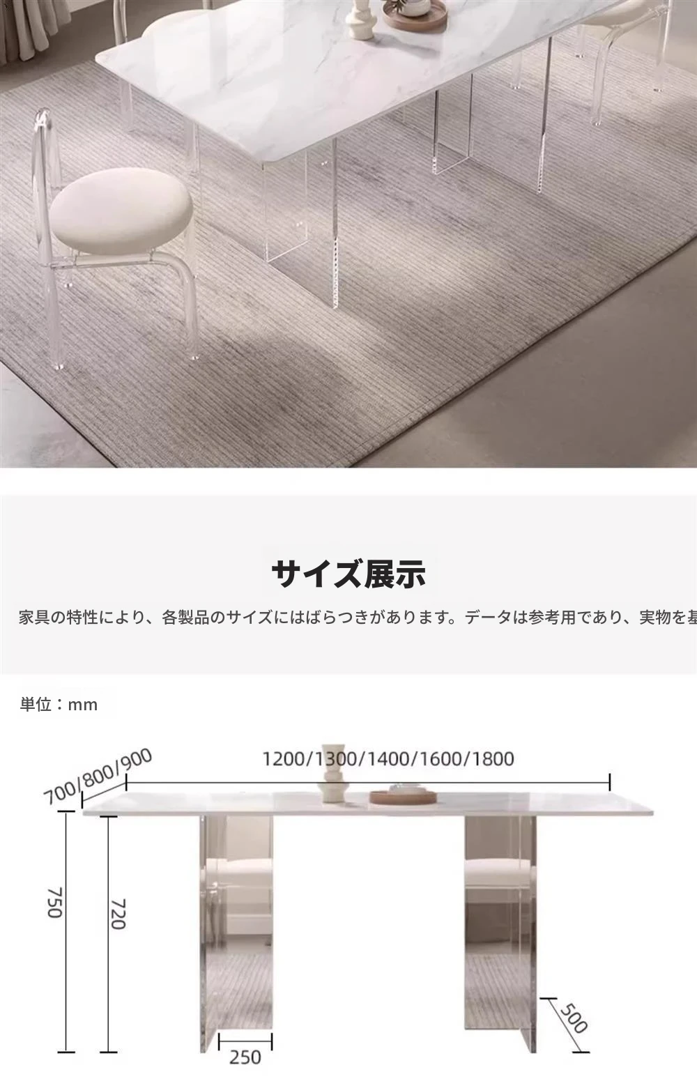 アクリル製の浮遊感を持つモダンな長方形ダイニングテーブルと椅子のセット - 小型住宅にぴったりの透明感あふれるシンプルデザイン!