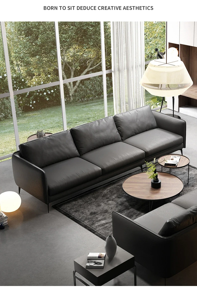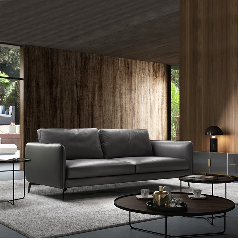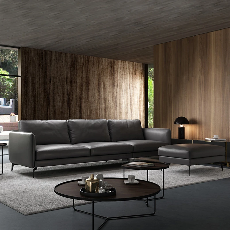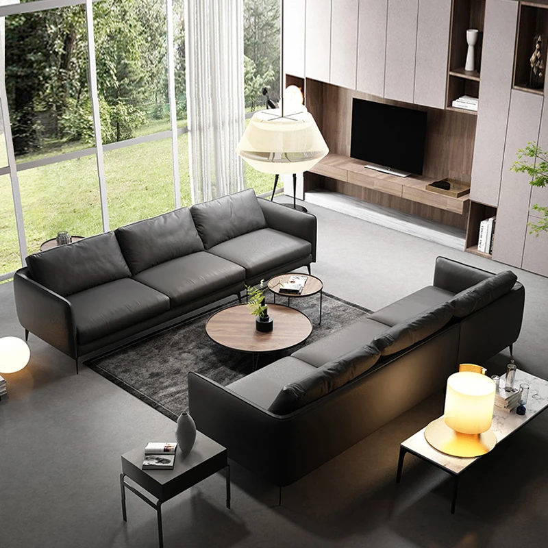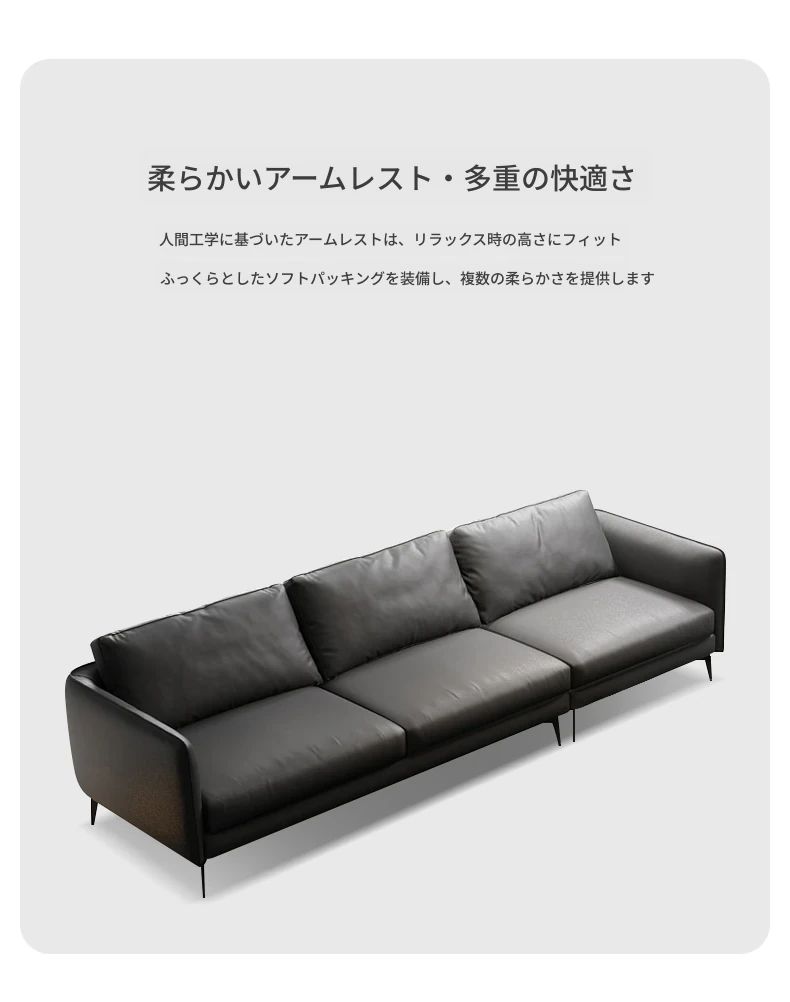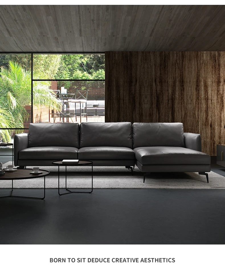 イタリアンミニマリスト本革ソファ - モダンでシンプルな直線型L字型カウチソファ、上質な牛革使用で贅沢な座り心地を実現!お部屋を洗練された空間に演出します。