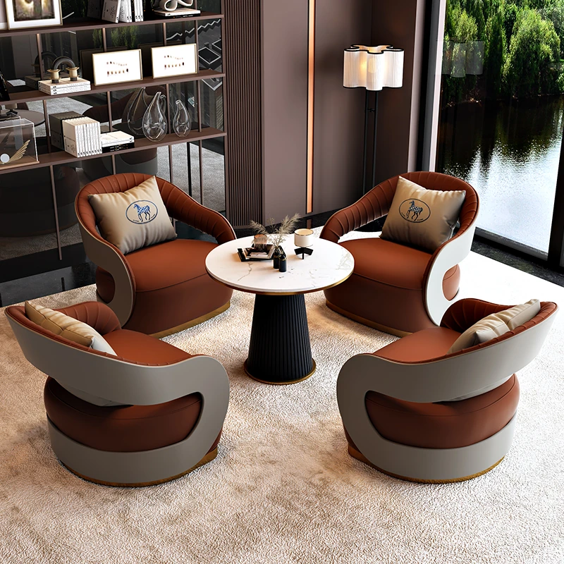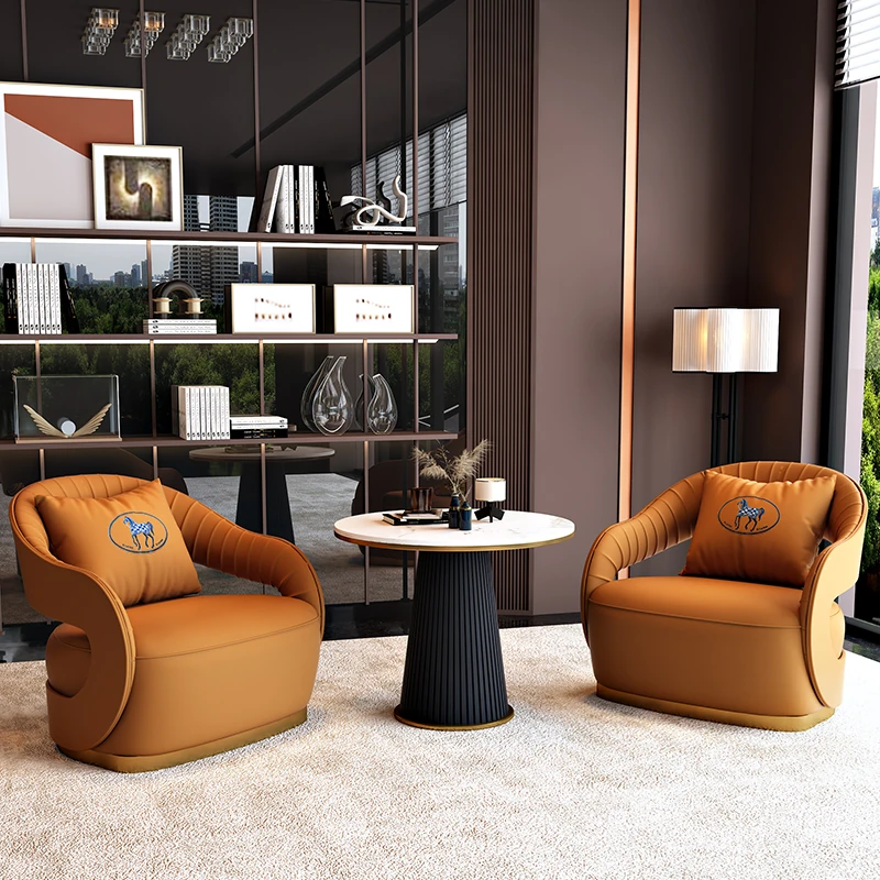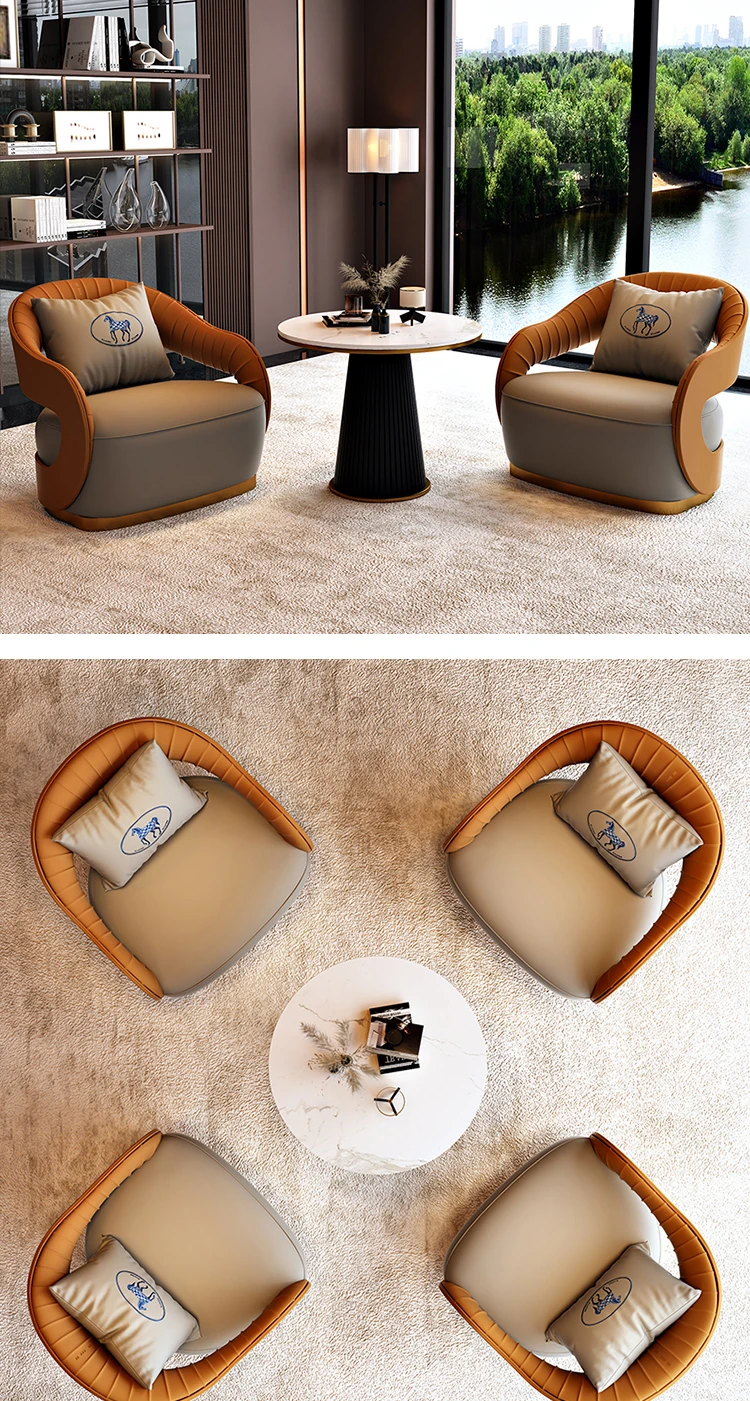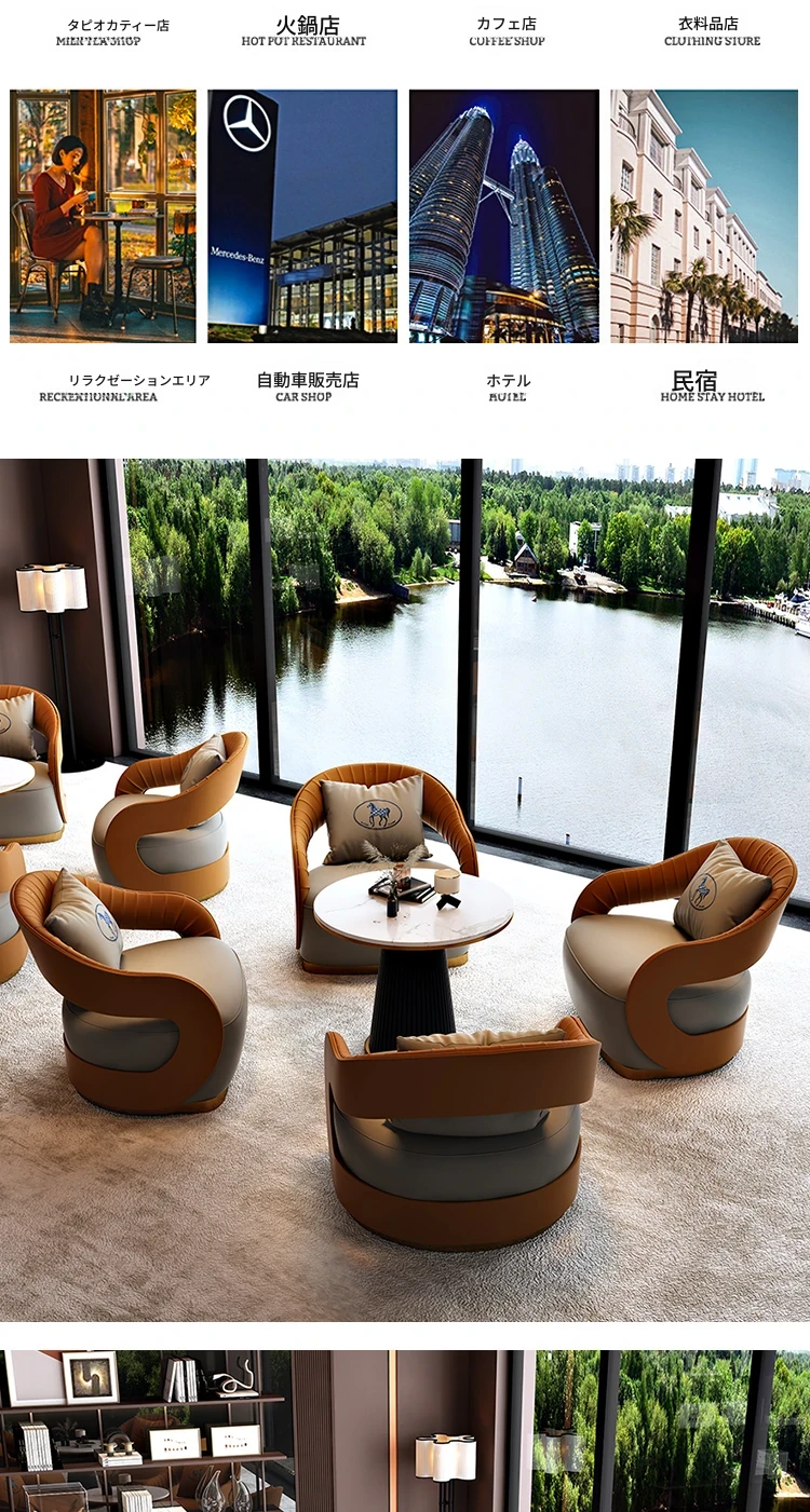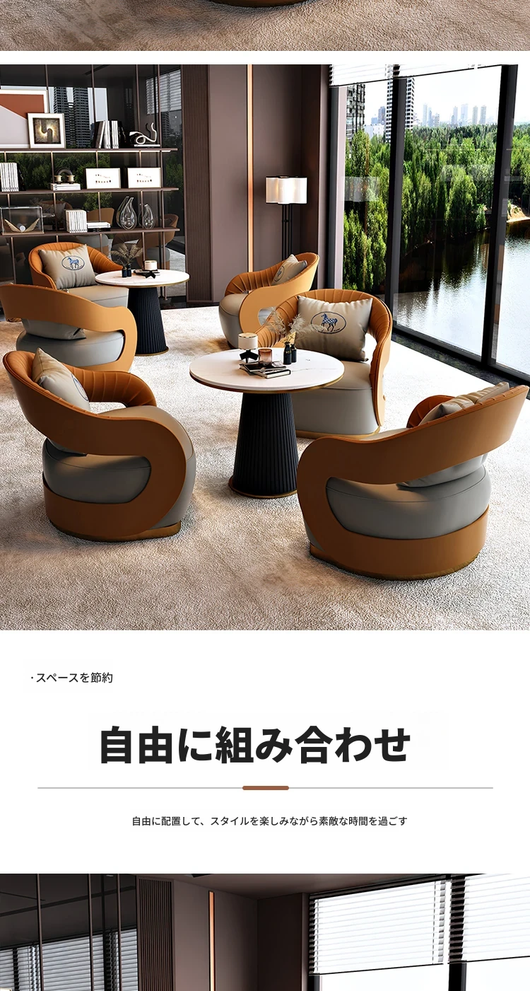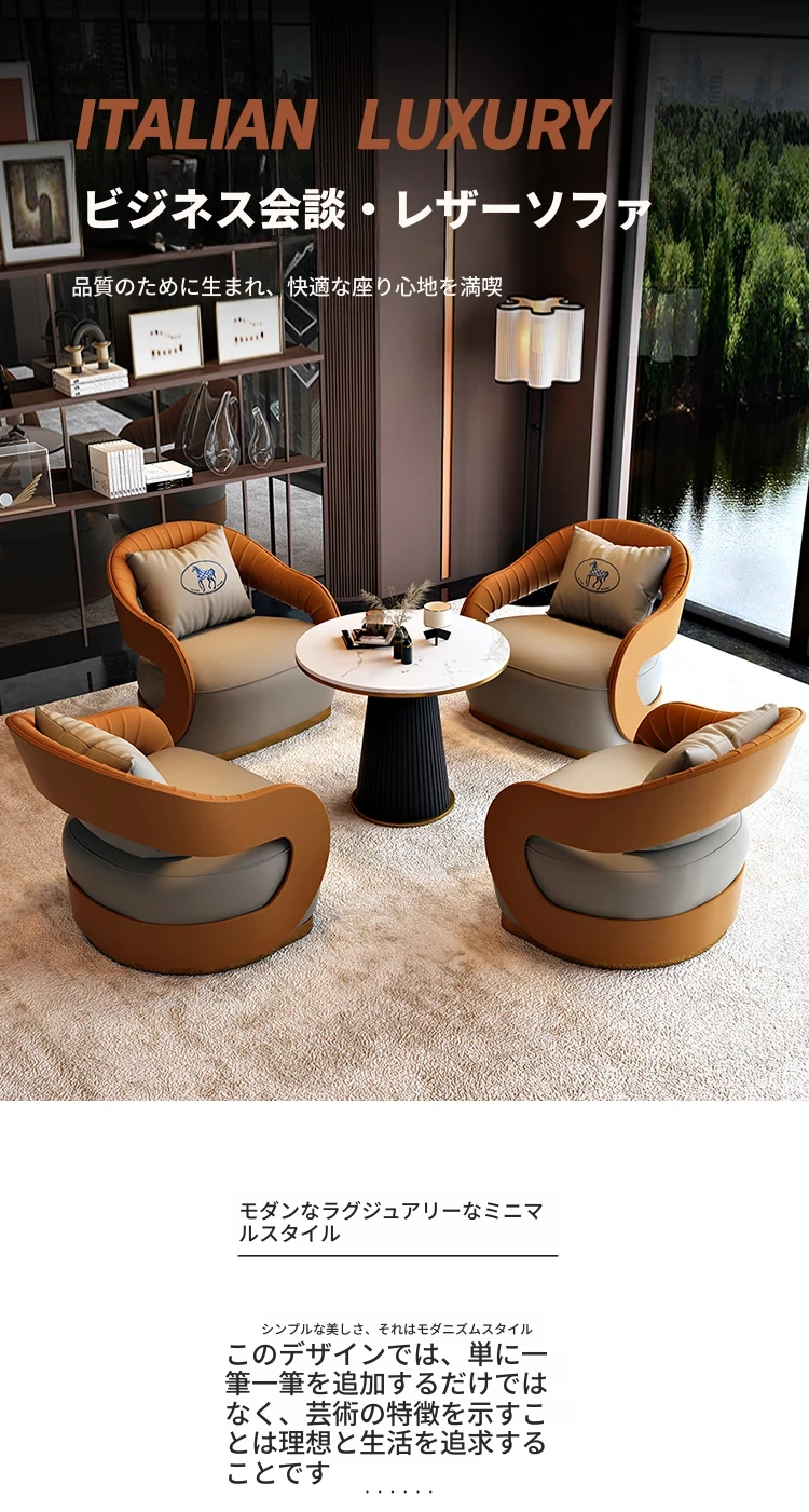 北欧スタイルのレザーソファ|現代美容院・ホテルロビー・販売所に最適なリラックススペース用家具|おしゃれで快適な談話エリアを演出!
