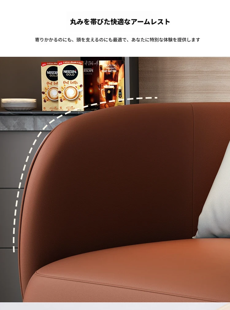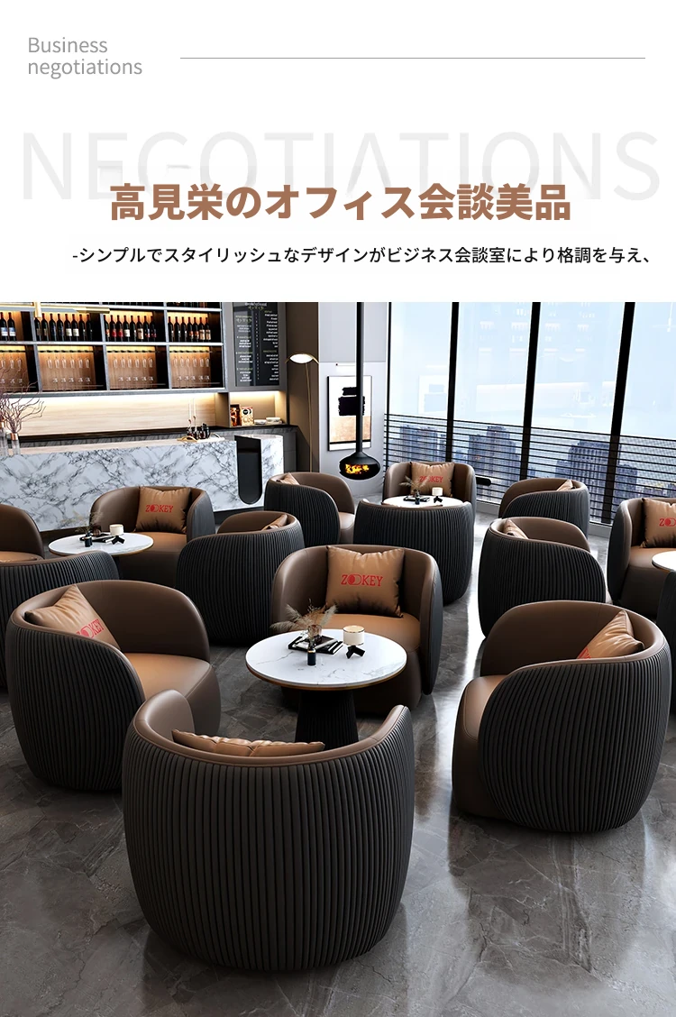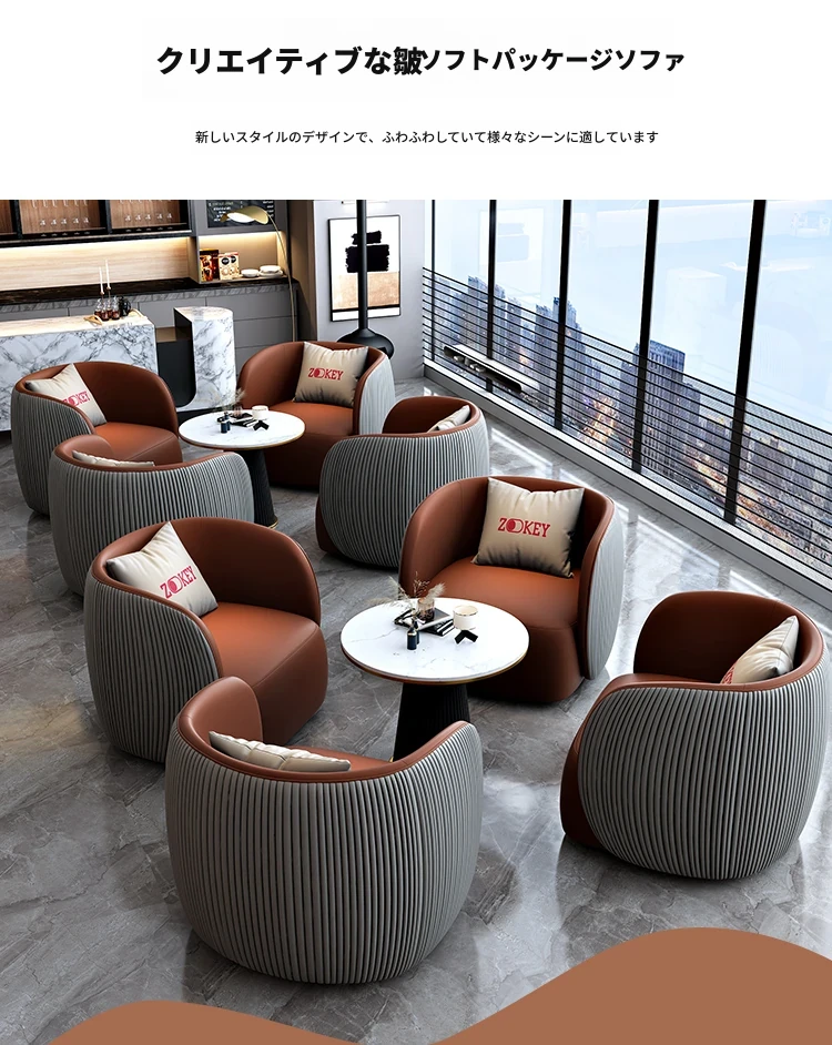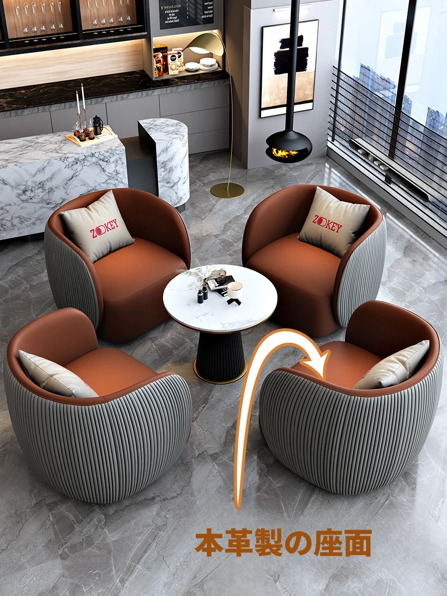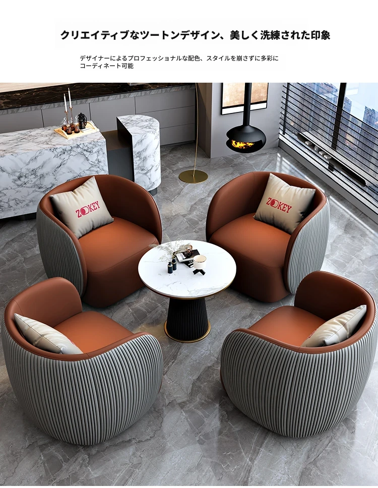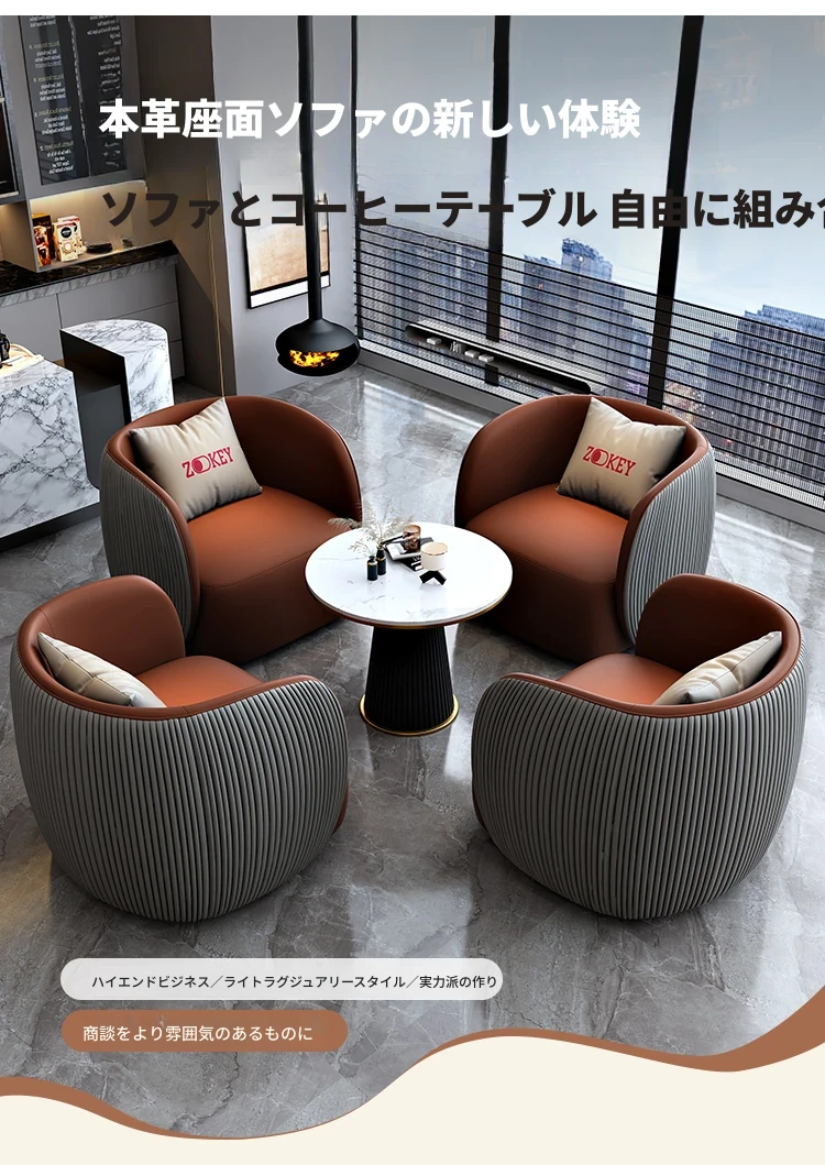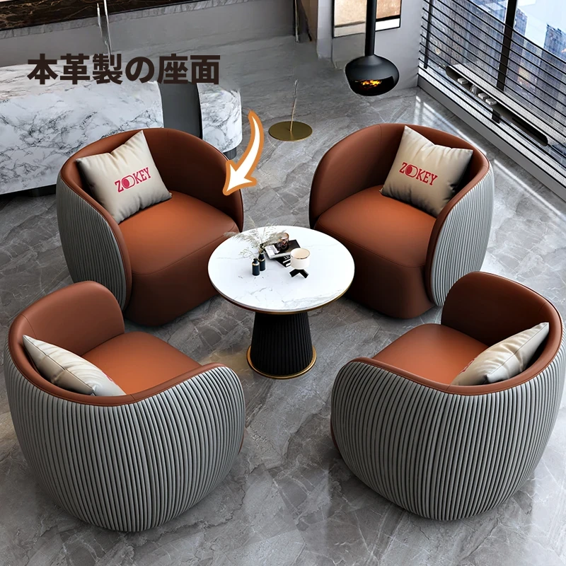 北欧風のレザーソファセット|モダンでラグジュアリーなデザイン|不動産営業所やホテルの休憩エリアに最適な接客用リラックスチェア&テーブル