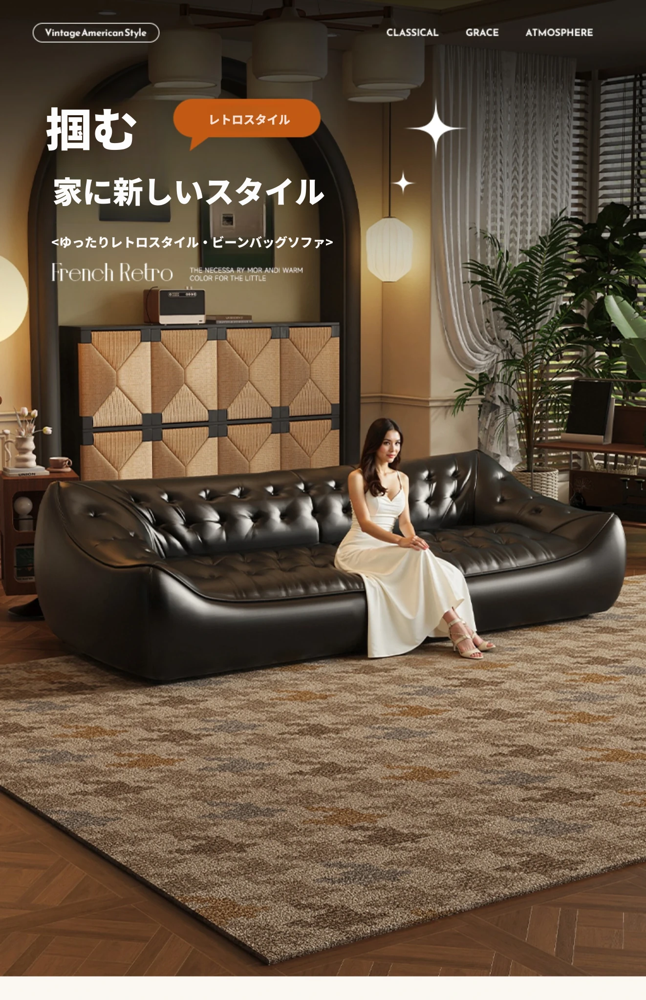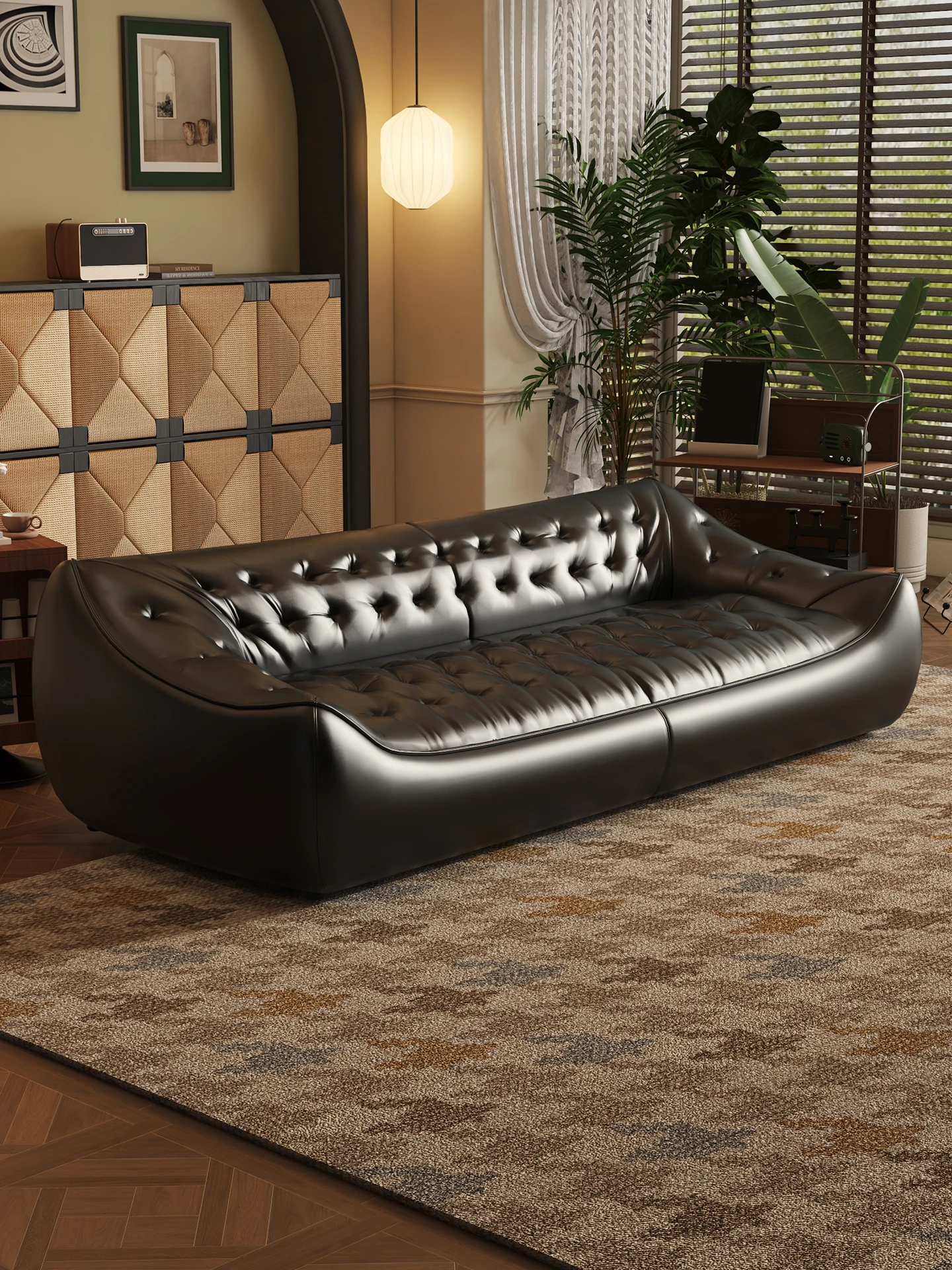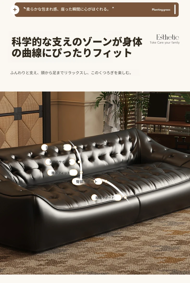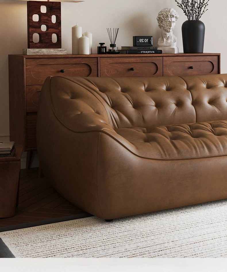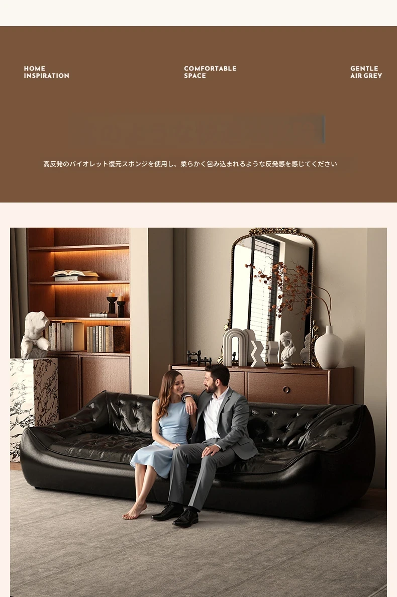 レトロスタイルの大きな深めのビーンバッグソファ、真皮製!リビングやオフィスに最適なダブル&トリプルシートのブラックレザーソファで、快適さとスタイルを兼ね備えています。