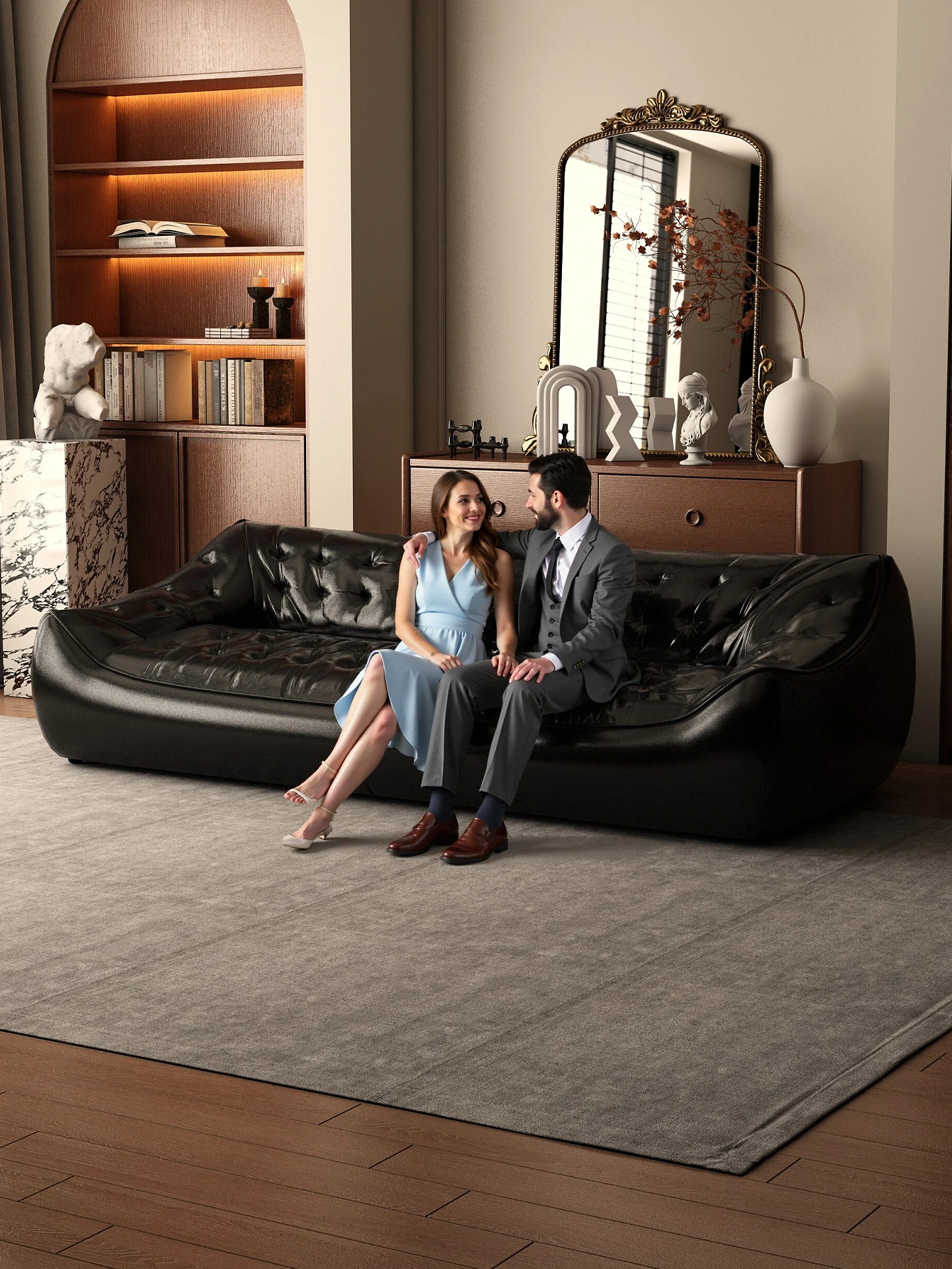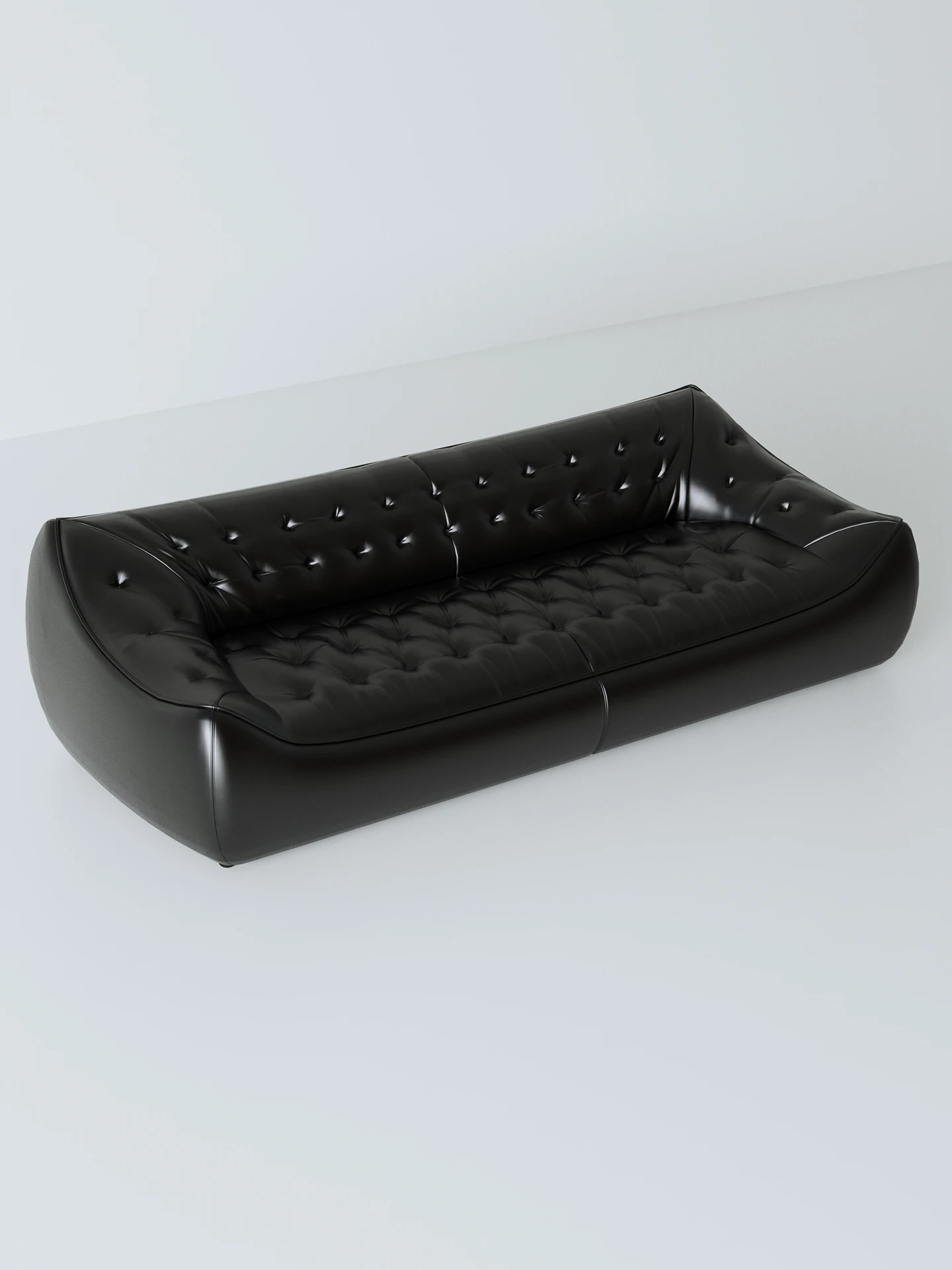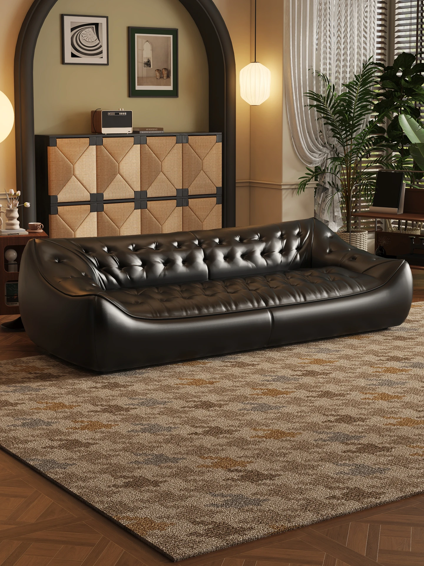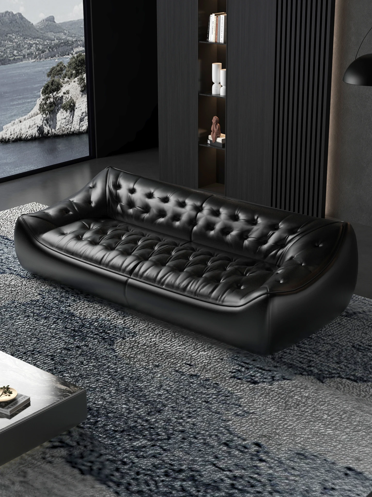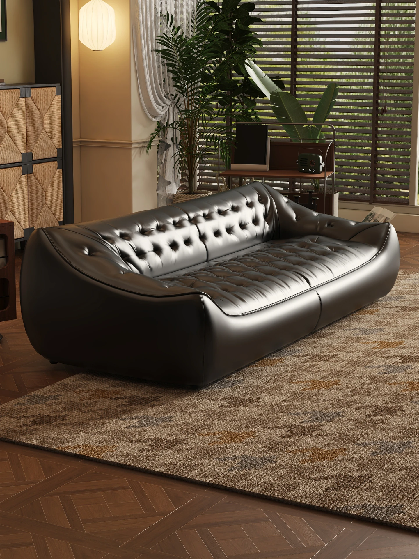 レトロスタイルの大きな深めのビーンバッグソファ、真皮製!リビングやオフィスに最適なダブル&トリプルシートのブラックレザーソファで、快適さとスタイルを兼ね備えています。