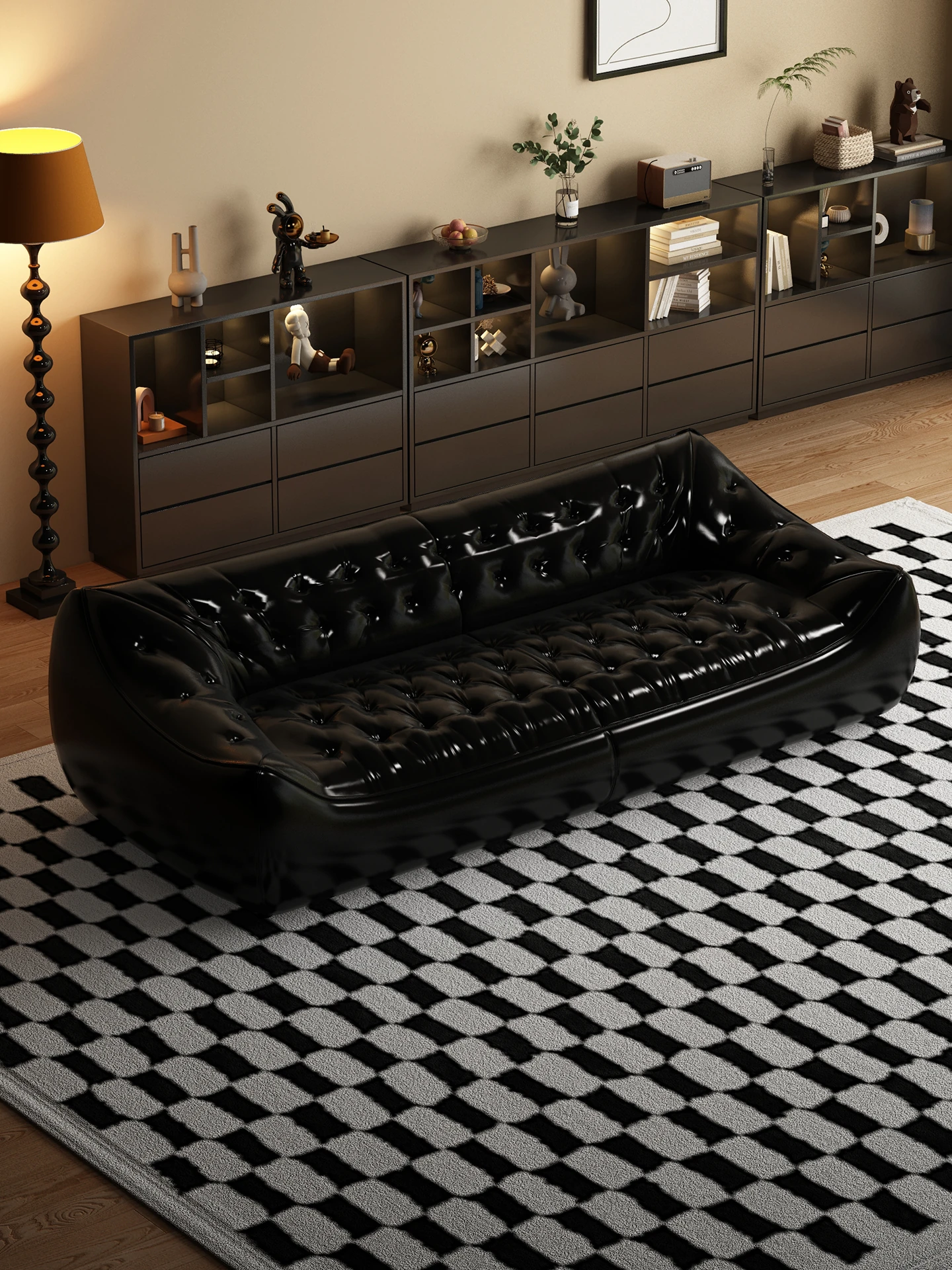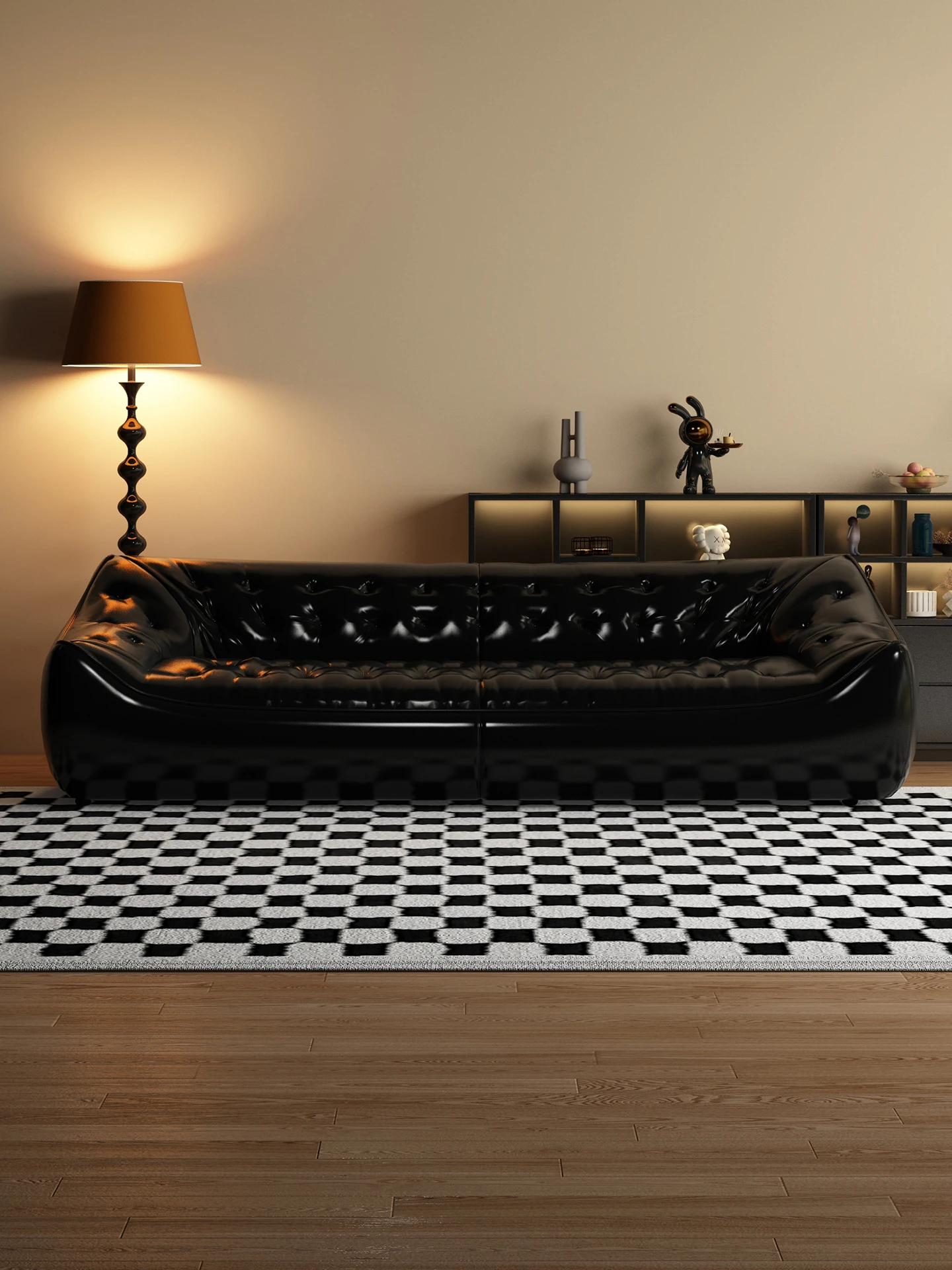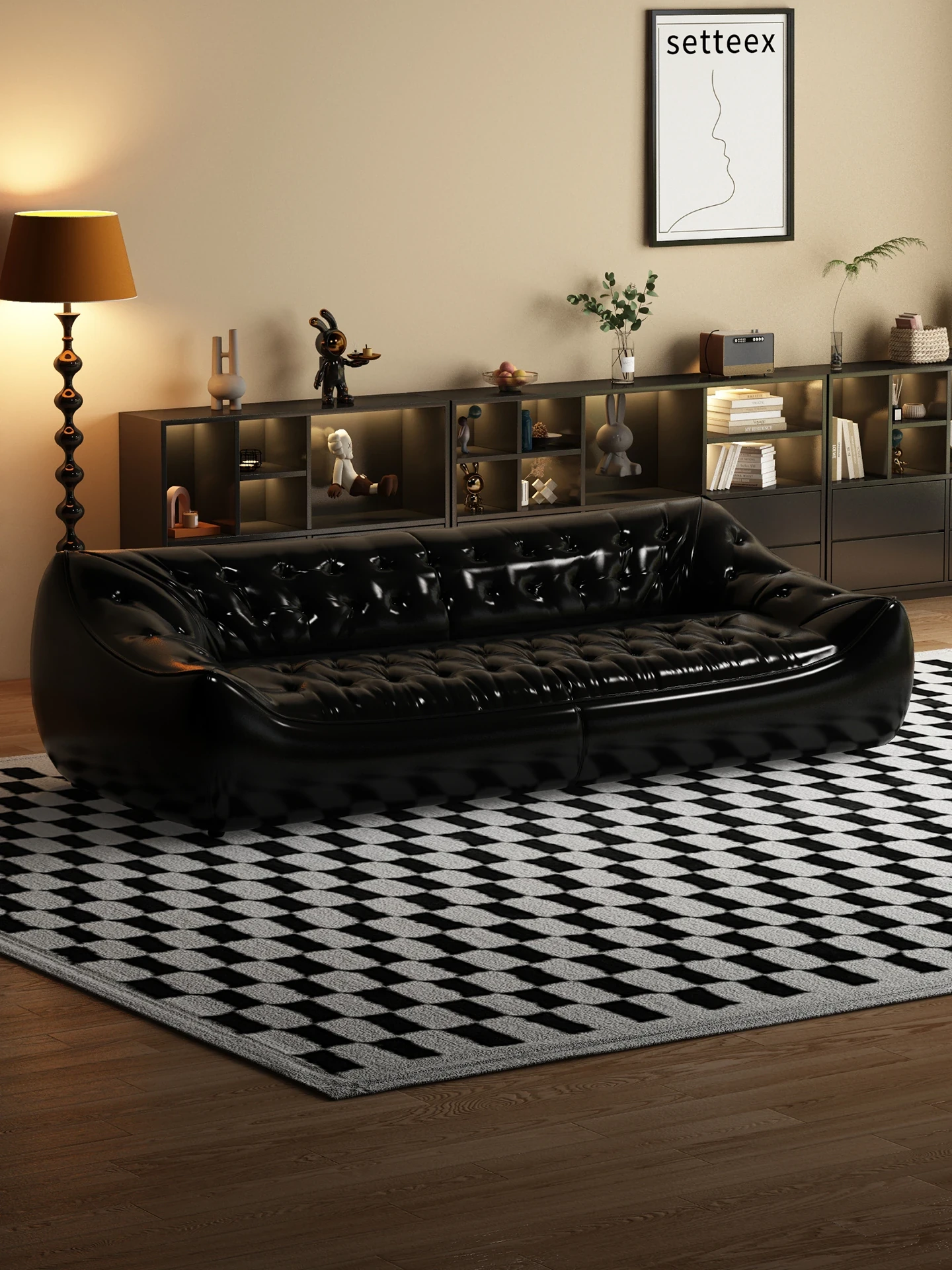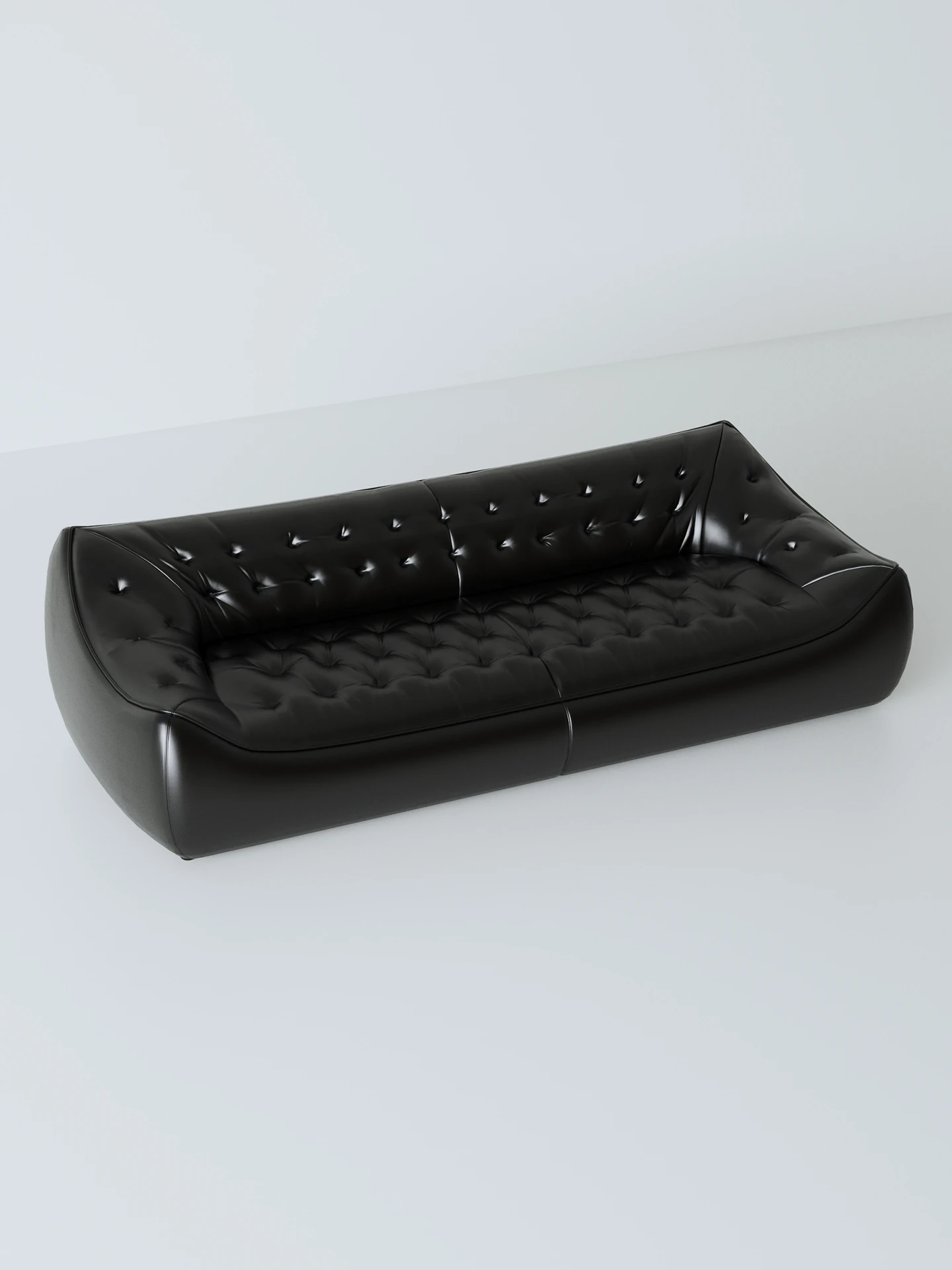 レトロスタイルの大きな深めのビーンバッグソファ、真皮製!リビングやオフィスに最適なダブル&トリプルシートのブラックレザーソファで、快適さとスタイルを兼ね備えています。