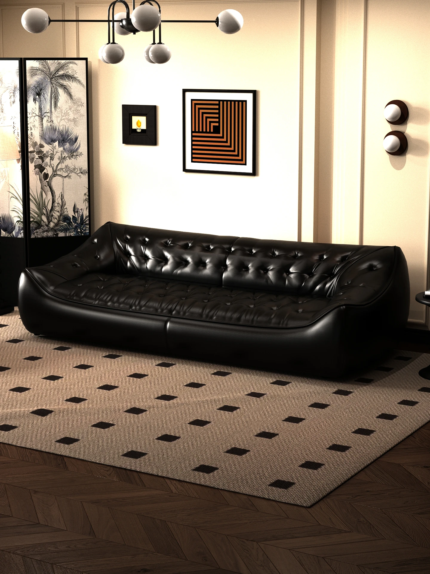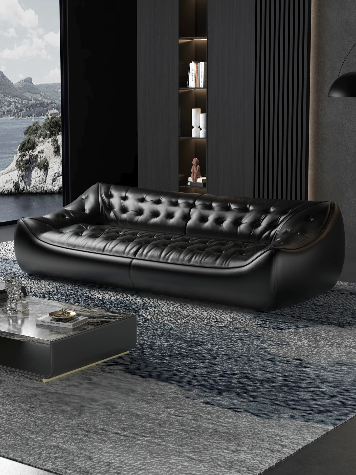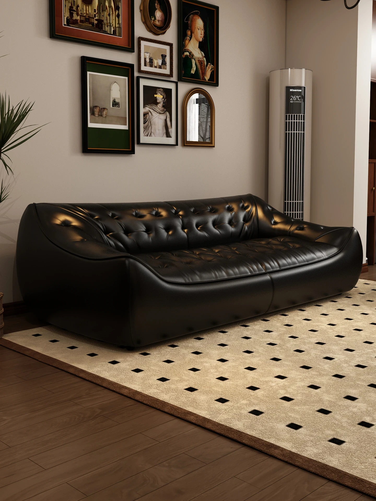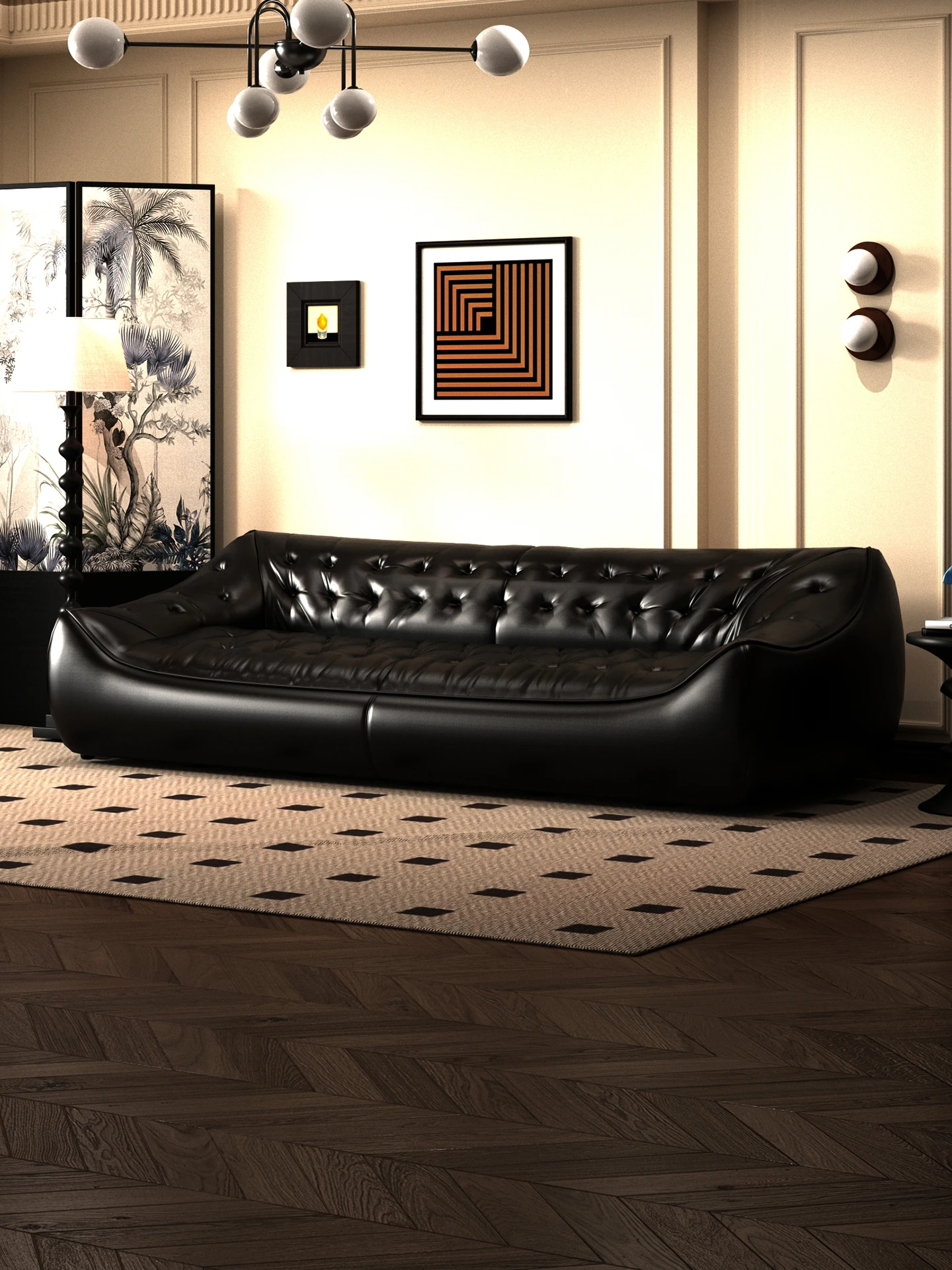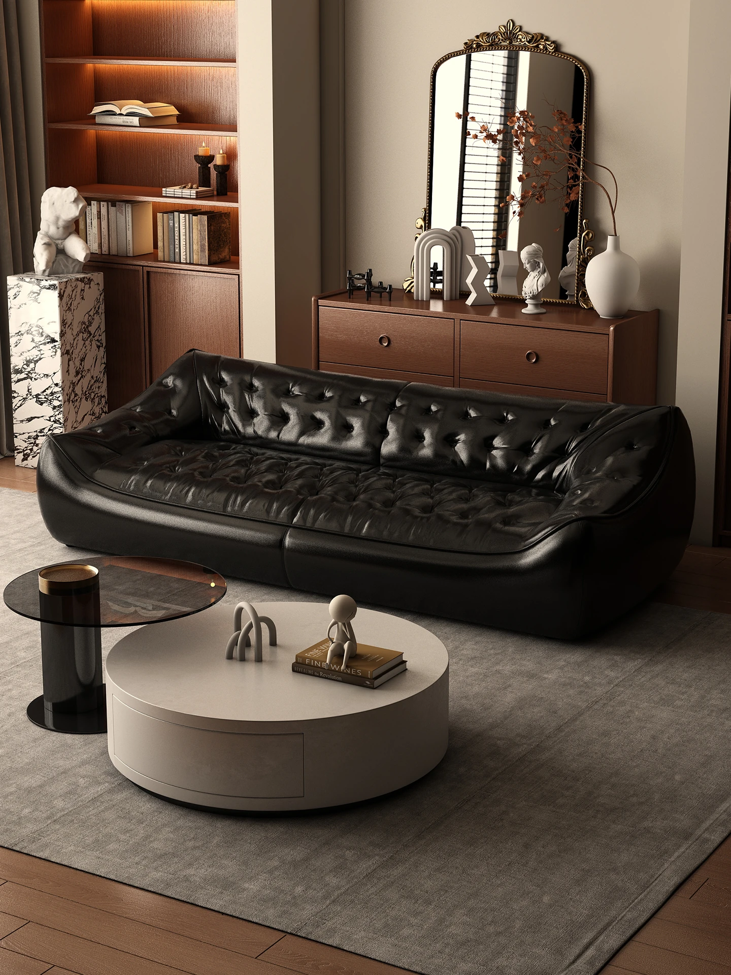レトロスタイルの大きな深めのビーンバッグソファ、真皮製!リビングやオフィスに最適なダブル&トリプルシートのブラックレザーソファで、快適さとスタイルを兼ね備えています。