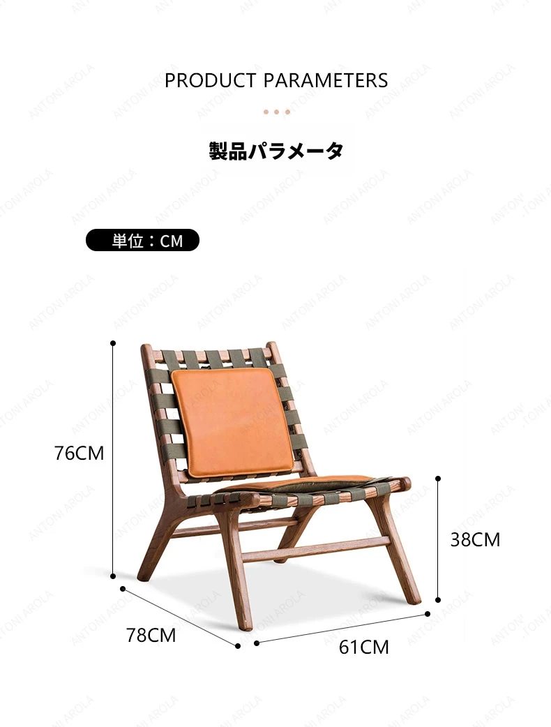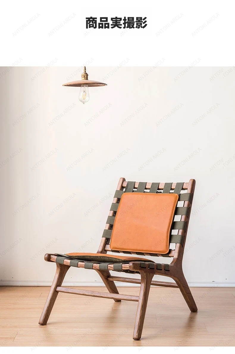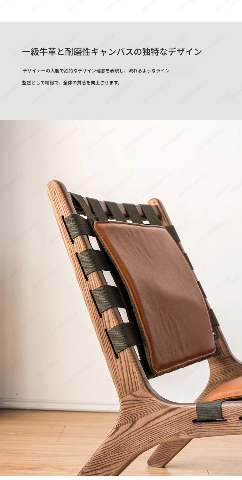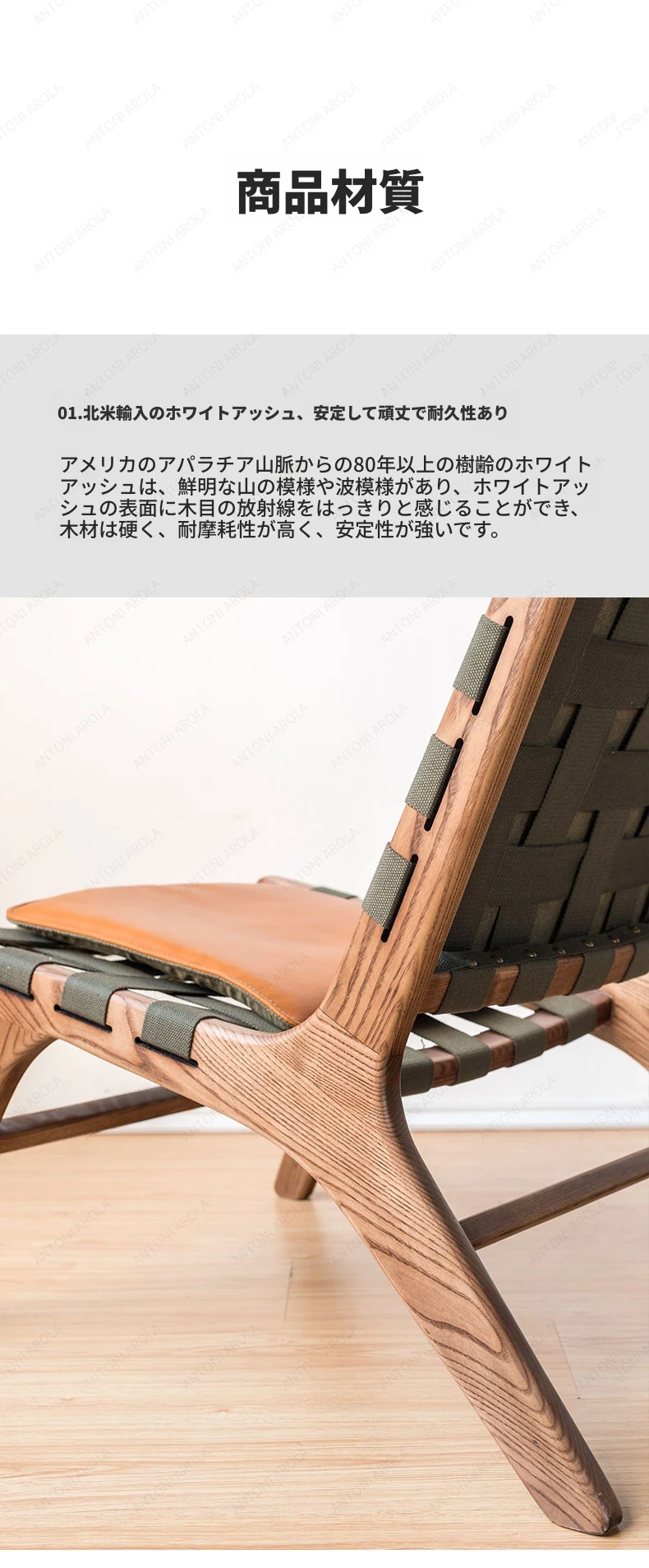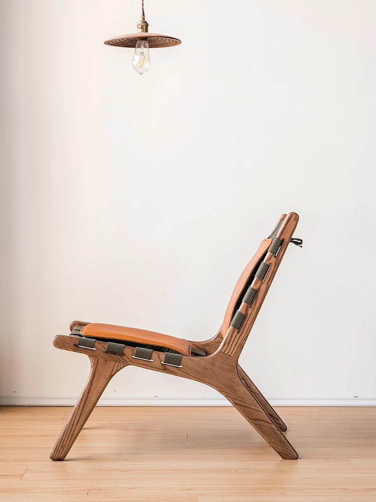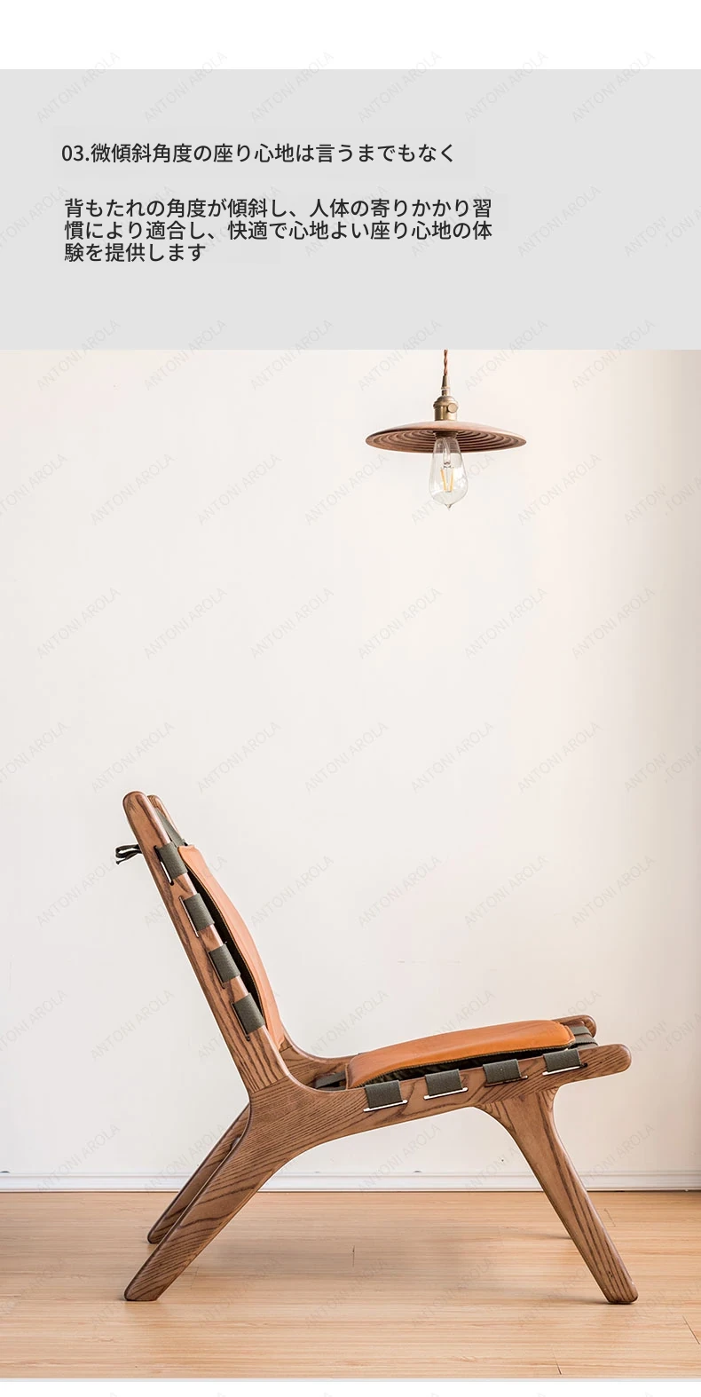 侘寂スタイルのシンプルな無垢材サドルチェア、真皮編みのリクライニングチェア。都会的なリラックス空間にぴったりの現代的なバルコニー用ラグジュアリーソファチェア。