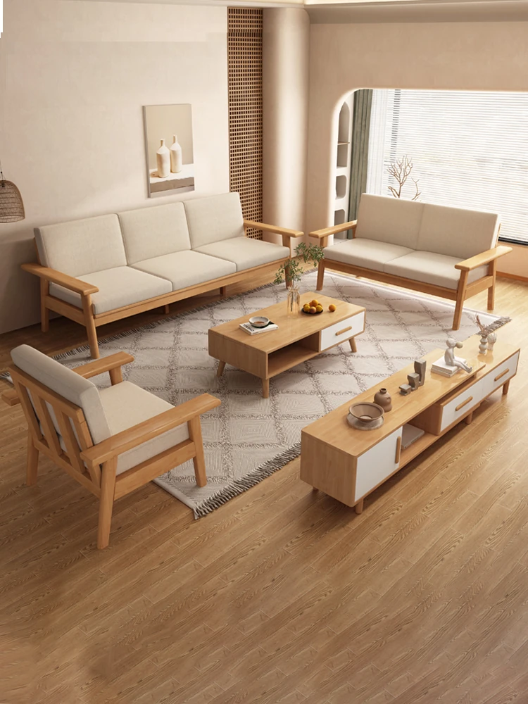 北欧スタイルの無垢材ソファセット|冬も夏も快適な布製・3人掛け|小型住宅にぴったりの原木ソファ|リビングに最適な中華風デザイン!