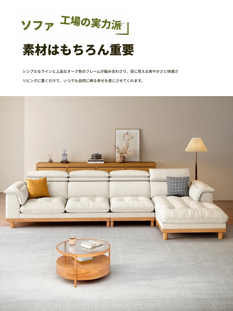 天然木材の風合いが魅力のソファ!小さなリビングにぴったりの和風デザイン。クリーミーな色合いでお部屋を明るく彩り、洗えるコットンリネン生地でお手入れ簡単。快適でおしゃれな空間を演出します!