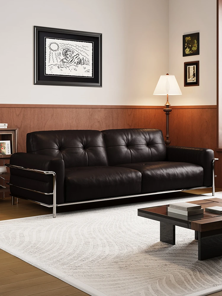 2025年新作!イタリアンラグジュアリーのブラックレザー雲朵ソファ - レトロスタイルのリビングにぴったり、直列デザインのプフレザーソファで、優雅さと快適さを両立!